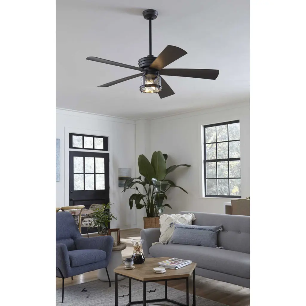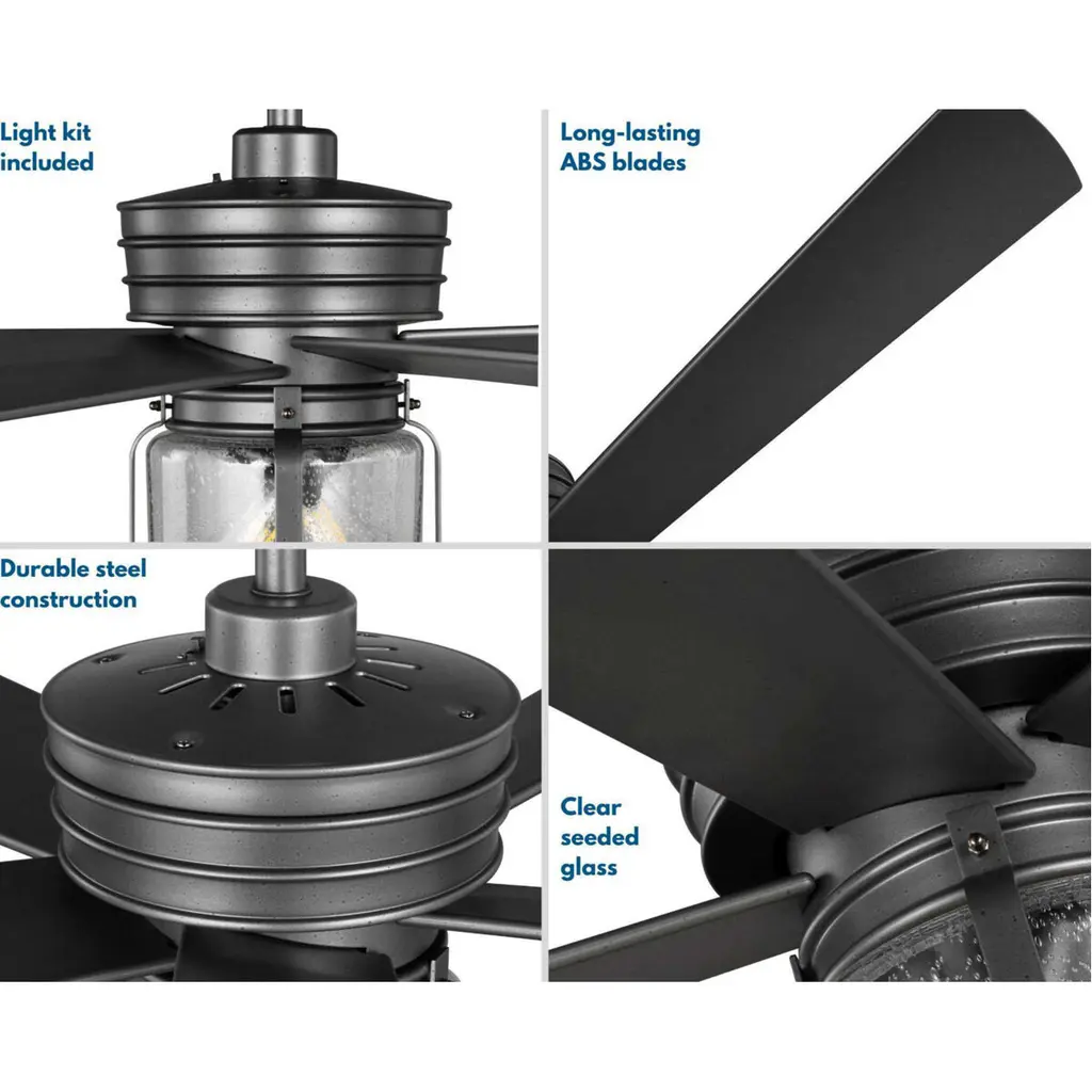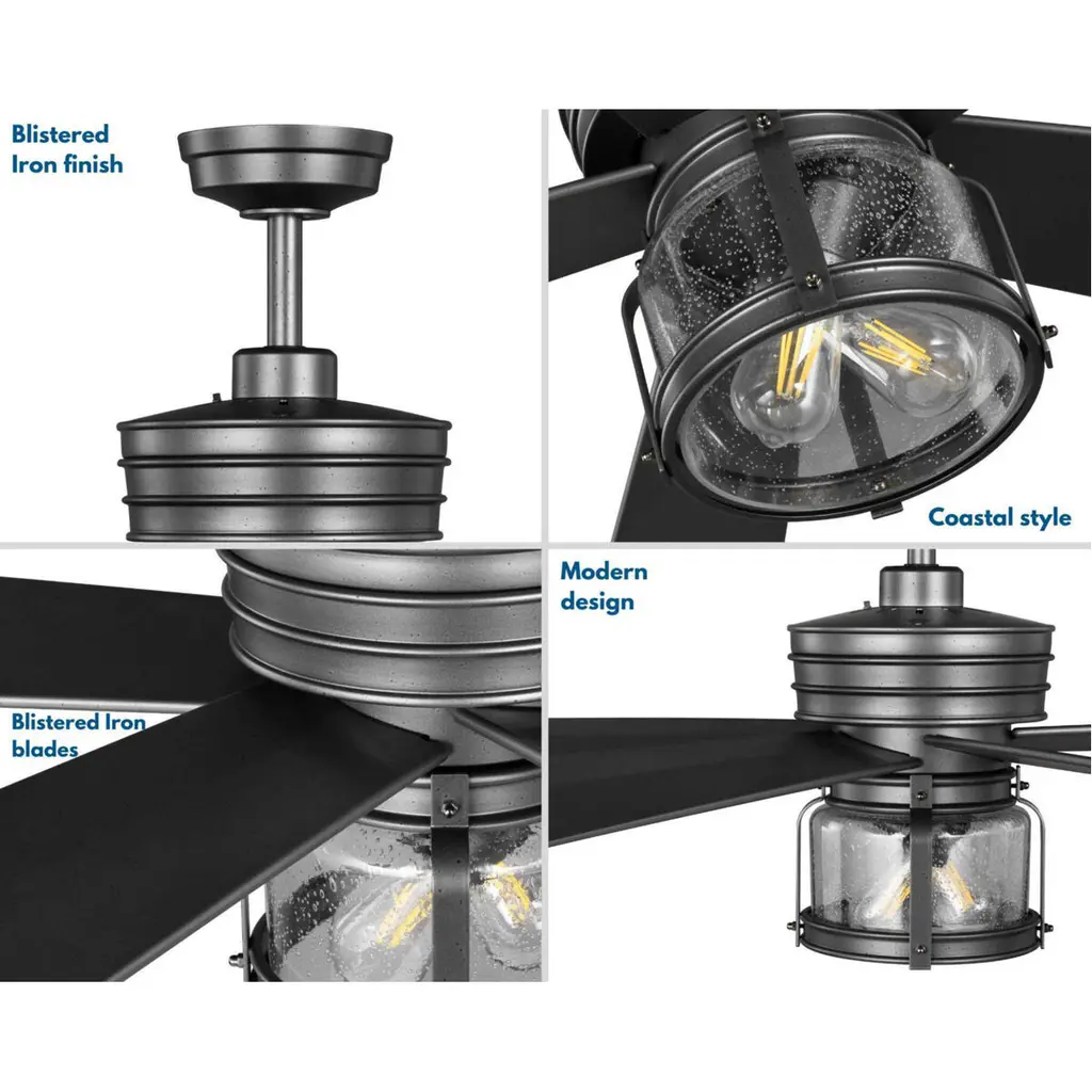 Offer a nostalgic appeal with the Midvale Collection 5-Blade Blistered Iron 56-Inch AC Motor Coastal Ceiling Fan.The rustic cage frame, banded metal, ceiling canopy, and blades are coated in a beautiful blistered iron finish. A clear seeded glass shade encloses vintage-style LED bulbs.A 3-speed handheld remote with batteries and a wall bracket for storage are included so you can adjust full-range dimming and fan speed without breaking a sweat. For ideal illumination, 2 medium base bulbs are included (7w max - LED/CFL/incandescent). The fan is compatible with dimmable bulbs.The ceiling fan's charming design is ideal for any covered outdoor living space in coastal and farmhouse style settings.It's time to breathe new life into the mundane every day with timeless and truly transformative lighting. Make your purchase today to begin your journey to a whole new lighting experience. Progress Lighting products are designed for exceptional quality, reliability, and functionality.