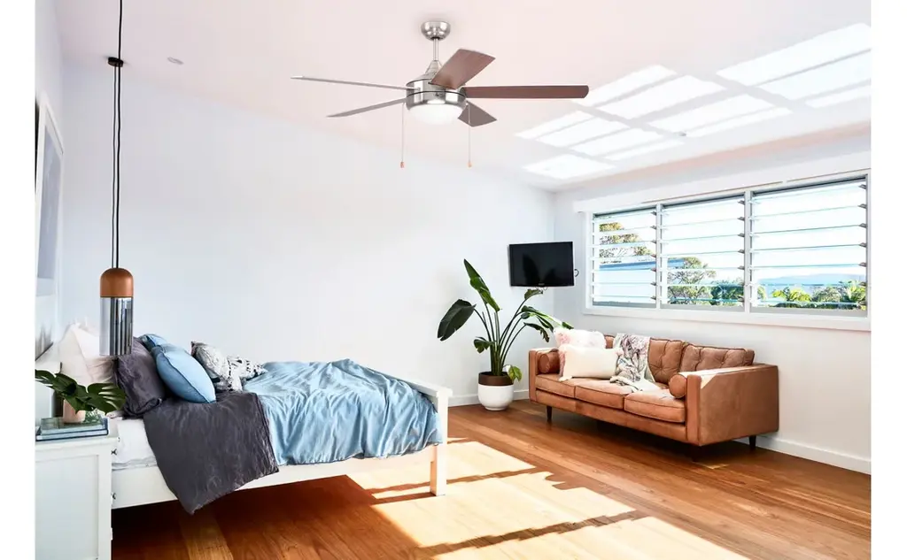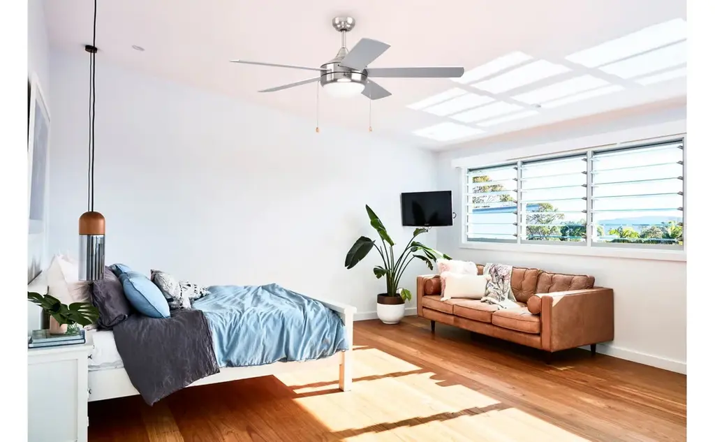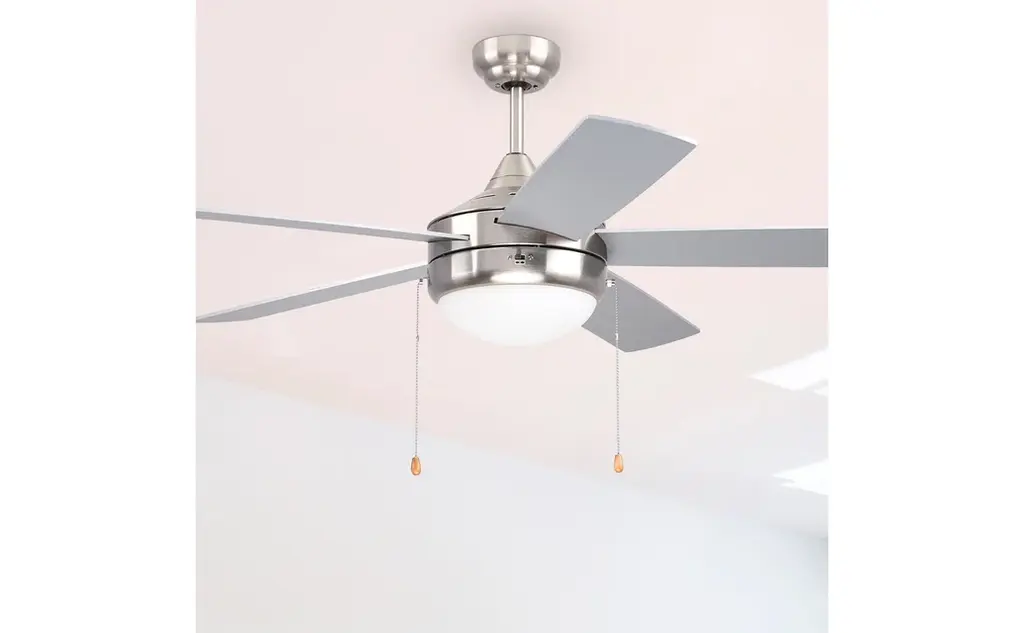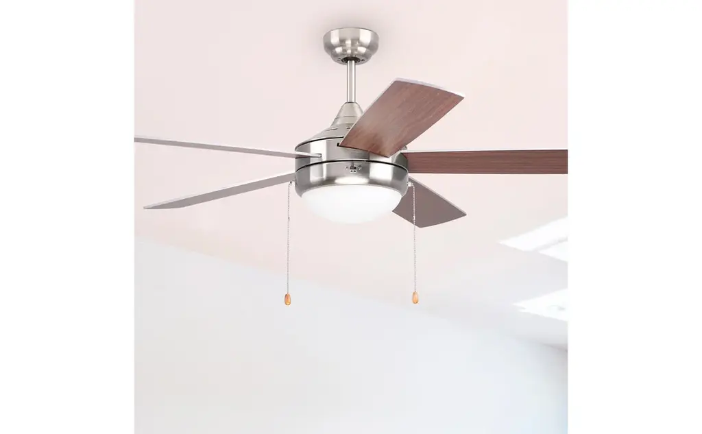 Features: Constructed from wood Comes with frosted glass shade Fan is controllable by a pull chain Can be installed on vaulted ceilings Includes a 4" downrod Includes medium (E26) LED bulb Rated for installation in dry locations Title 20 compliant Covered by manufacturer's 1 year manufacturer warranty Dimensions: Height: 15-5/8" Width: 52" Product Weight: 17.6 lbs Blade Specifications: Number of Blades: 5 Blade Span: 52" Blades Included: Yes Blade Pitch: 10.5° Reversible Blades: Yes Motor Specifications: Speeds: 3 CFM: 3378.91 Electrical Specifications: Bulb Base: Medium (E26) Light Kit Included: Yes Bulb Included: Yes Max Wattage: 56.54 watts Voltage: 120 volts Color Temperature: 3000K Color Rendering Index: 90CRI Lumens: 1600