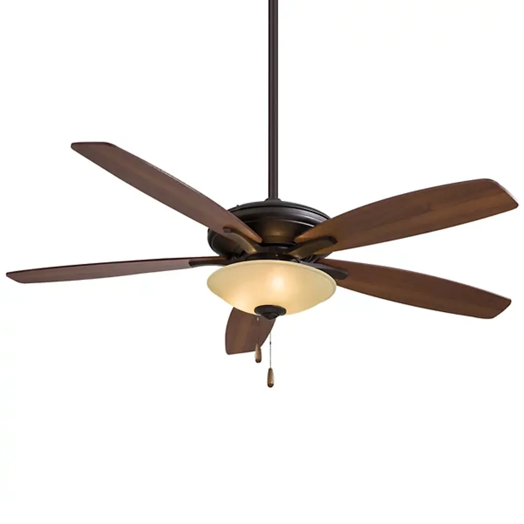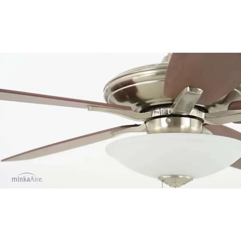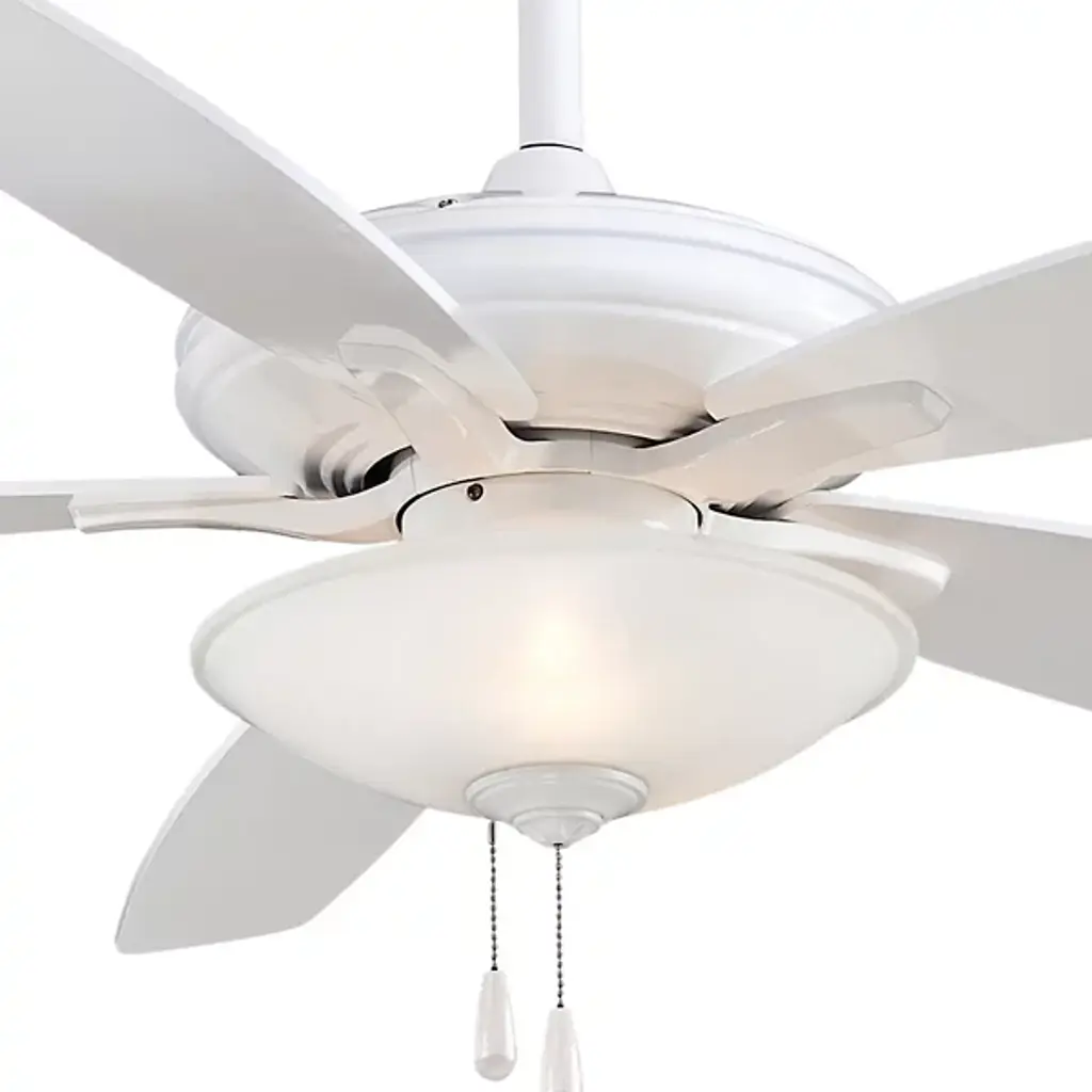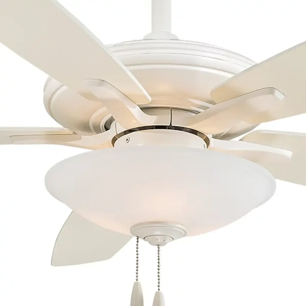 The Minka Aire Mojo Ceiling Fan has the look of a classic fan, updated with smooth, more relaxed lines. Includes 5 reversible blades, a low profile 3-bulb light kit with glass shade and a 6" downrod. Features a 3-speed pull chain control and warp resistant blades.