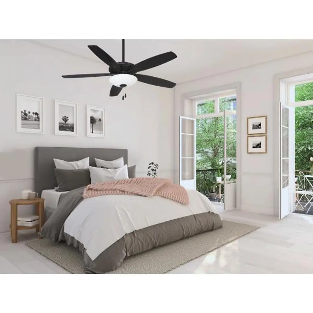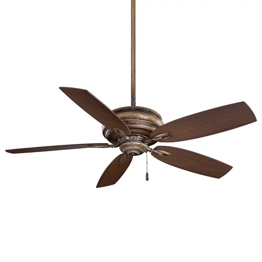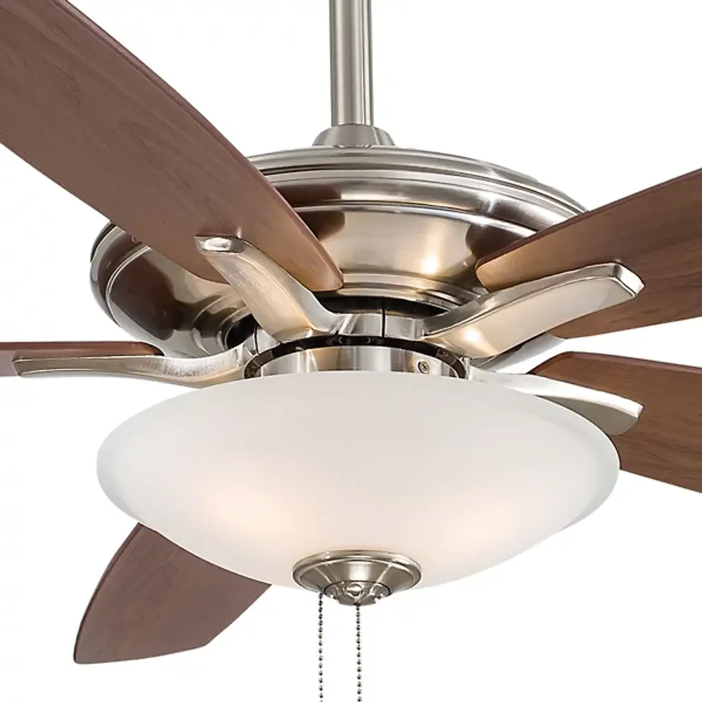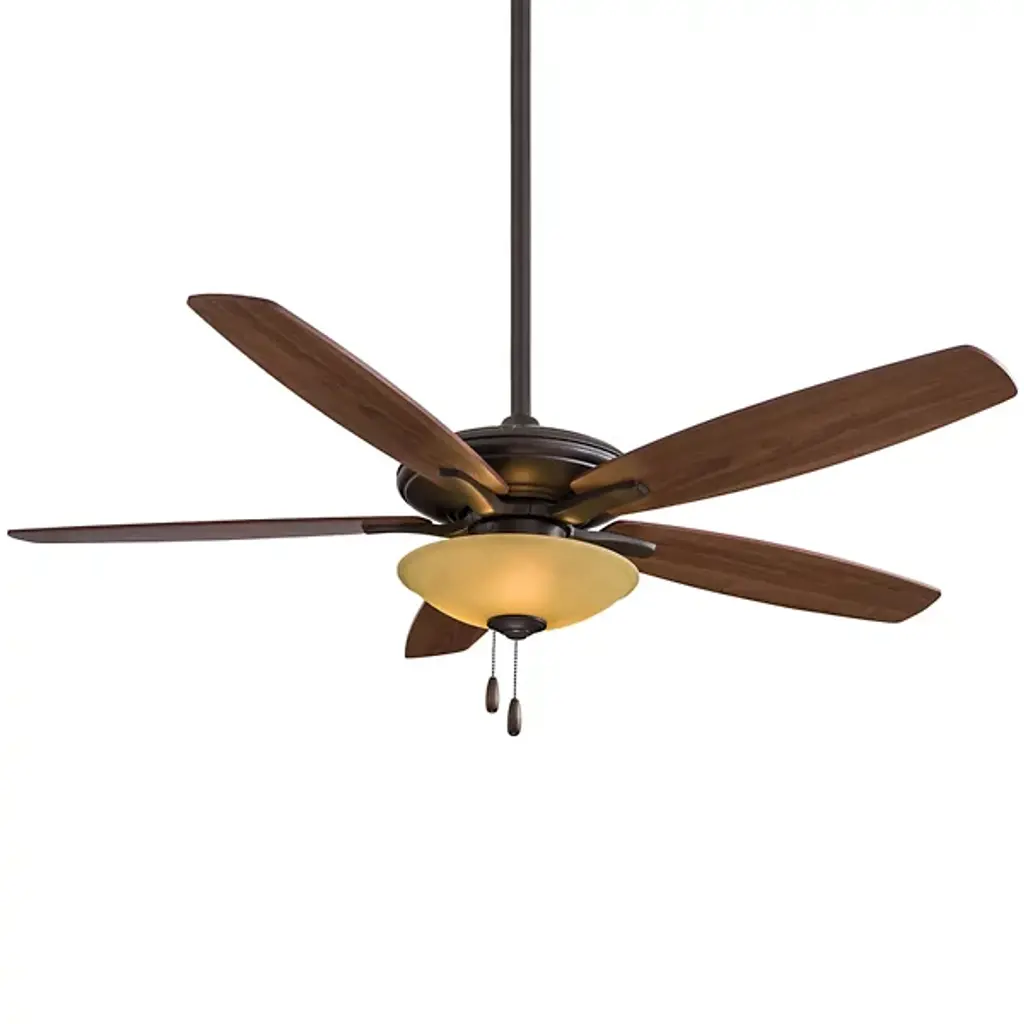 The Minka Aire Mojo Ceiling Fan has the look of a classic fan, updated with smooth, more relaxed lines. Includes 5 reversible blades, a low profile 3-bulb light kit with glass shade and a 6" downrod. Features a 3-speed pull chain control and warp resistant blades.