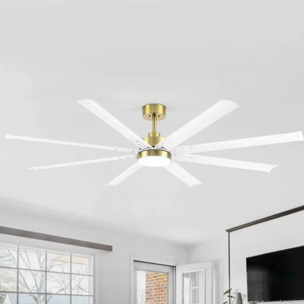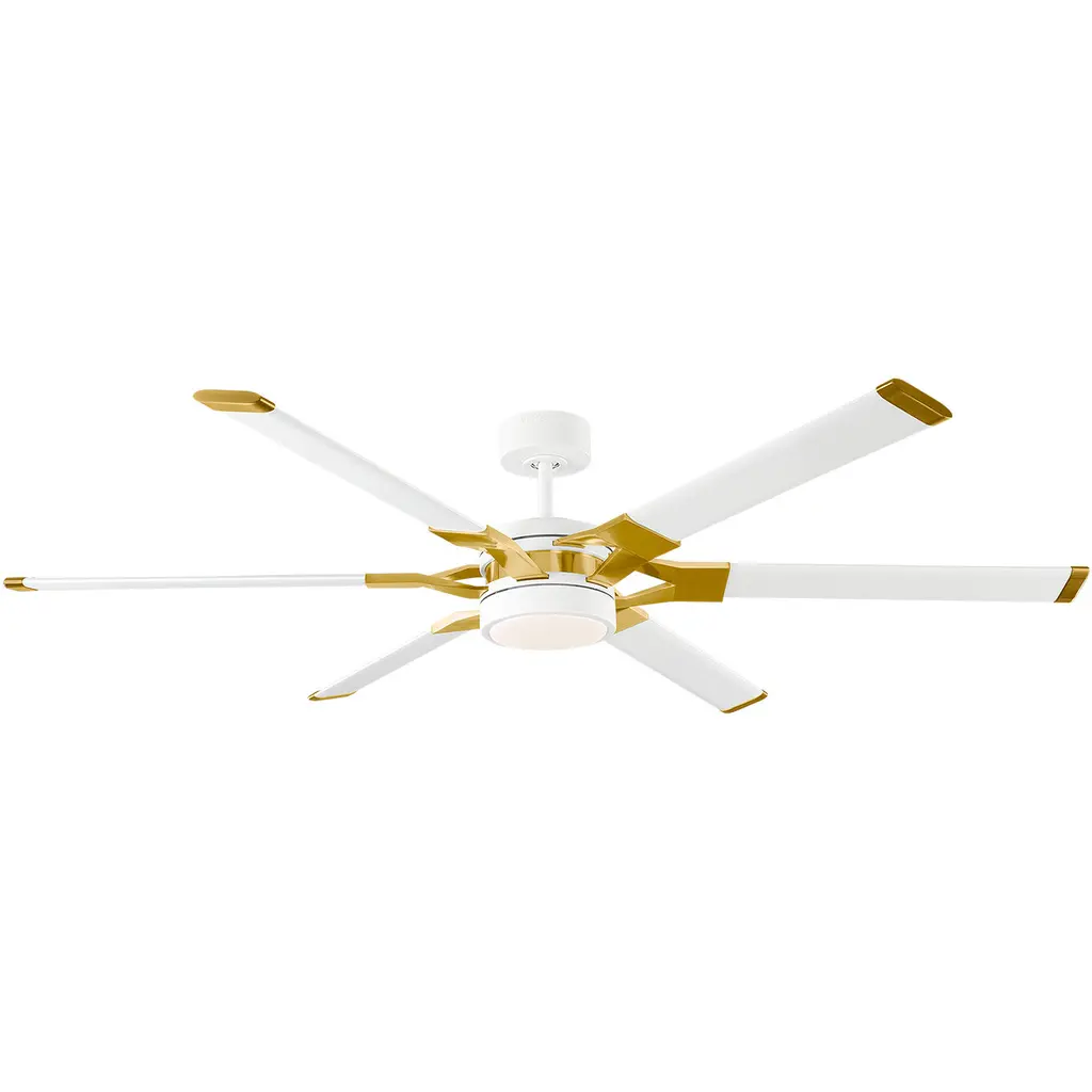 Burnished brass accents add a glam note to this sleek white ceiling fan and light fixture. Suitable for use in enclosed patios and bathrooms as well as in living spaces, this fan has a quiet DC motor and six blades with a 13-degree pitch for optimal airflow. The Energy Star-rated fan has six speeds, and its direction can be reversed, so that you can use it in the winter to recirculate heat and make rooms toastier.
