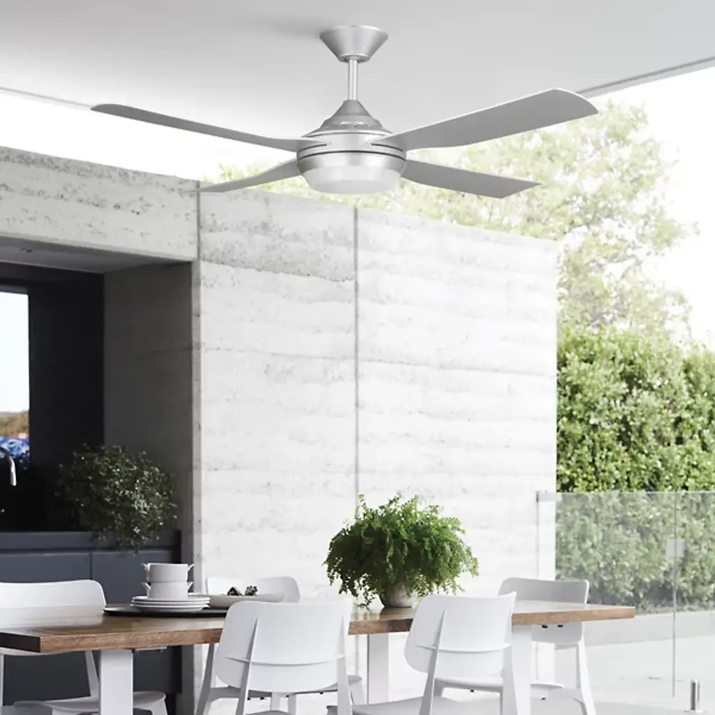 The Moonah LED Lucci Air Ceiling Fan from Beacon Lighting matches smooth style with modern engineering for reliable, year-round comfort. Designed by Lucci Air, it features four high-performance ABS blades precisely angled to maximize airflow while maintaining quiet operation. A durable die-cast motor at the fan's core provides strong service, while an integrated LED light sits at the center. A flat, bevel-edged diffuser creates soft, ambient illumination, controlled by an included handheld remote that allows for easy adjustment between three fan speeds.