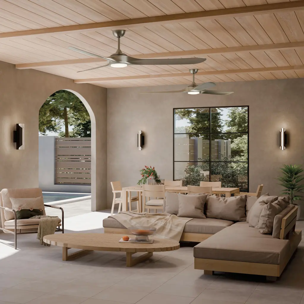 With its soft curves and sculptural form, the Mylo 80" Weather+ ceiling fan offers easy room coordination in an array of modern style environments. As a Weather+ model, it's designed to withstand wet-rated weather conditions plus combat the effects of certain environmental factors such as saltwater spray and the impact from UV rays. Plus, its large diameter size helps circulate a considerable amount of air to create a desirable cooling effect in larger spaces. As versatile as it is functional, Mylo's included light cap provides the option to utilize the fan with or without the light source while its three contoured blades enhance its overall aesthetics.