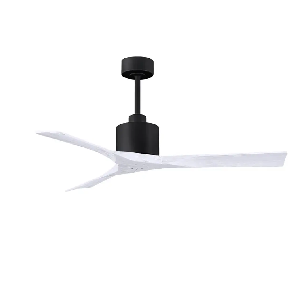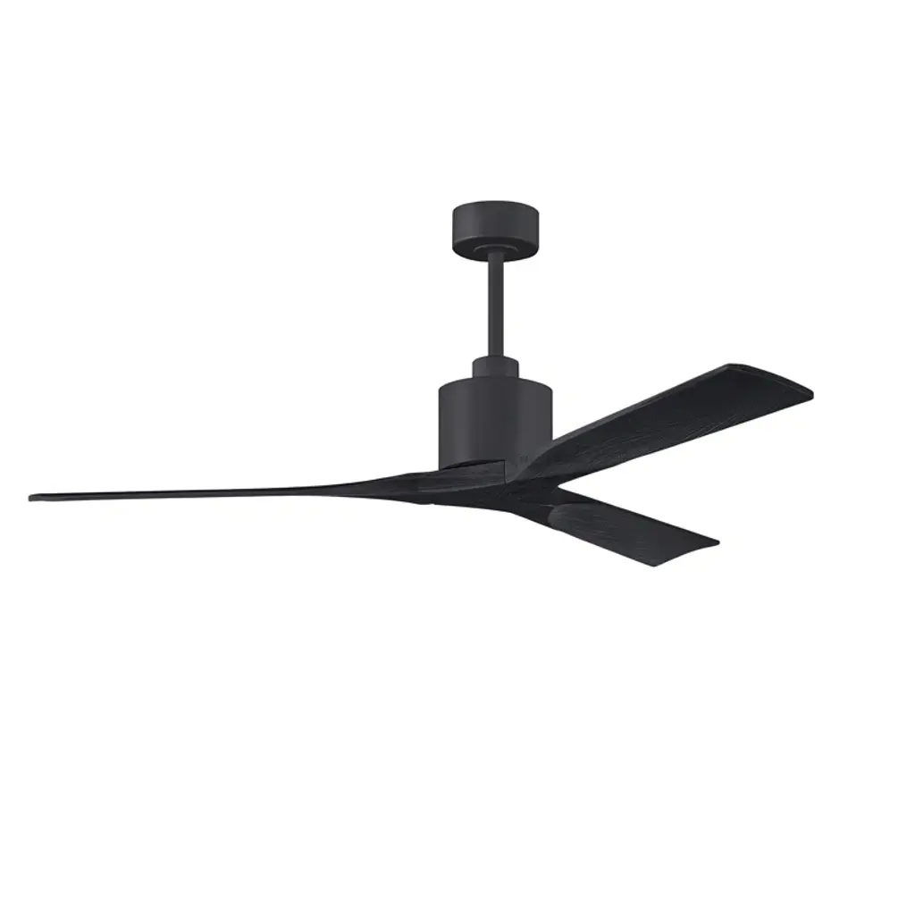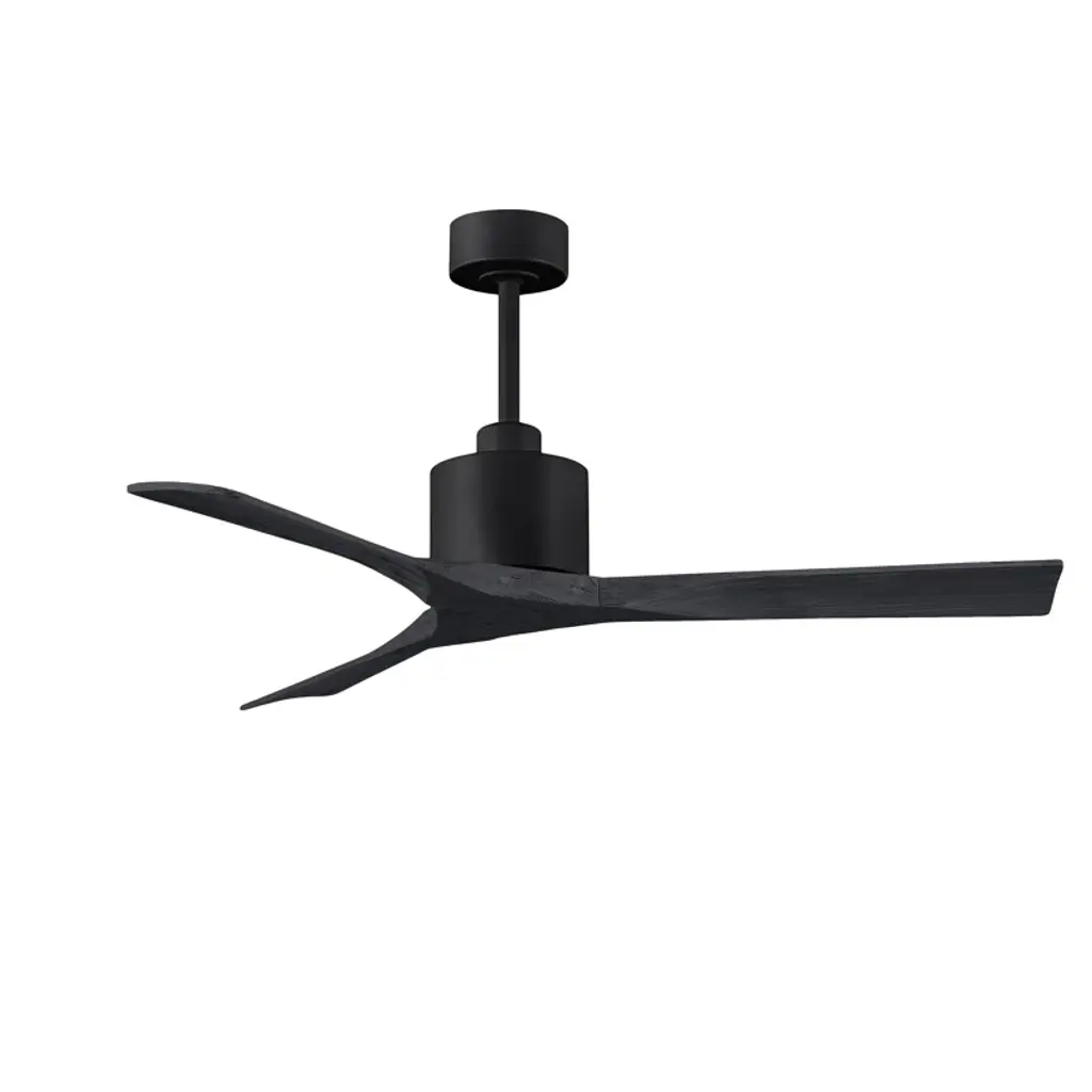 52" minimal damp location ceiling fan designed by Chicago architect Stephen Katz. 6 speed DC motor operated by hand-held remote control and wireless wall control. Solid wood blades in Matte Black