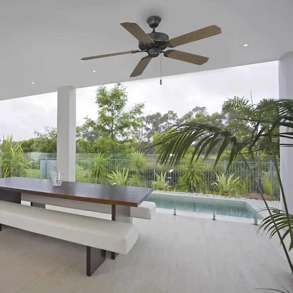 The Savoy House Nomad Outdoor Ceiling Fan is a great choice for casual outdoor living spaces. And since it's rated safe for wet locations, it's suitable even for uncovered porches and pool areas. Features 5 blades with a 52" blade span and 12 degree blade pitch. Compatible with several Savoy House remote controls.