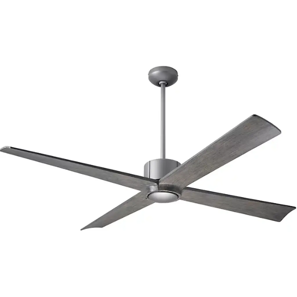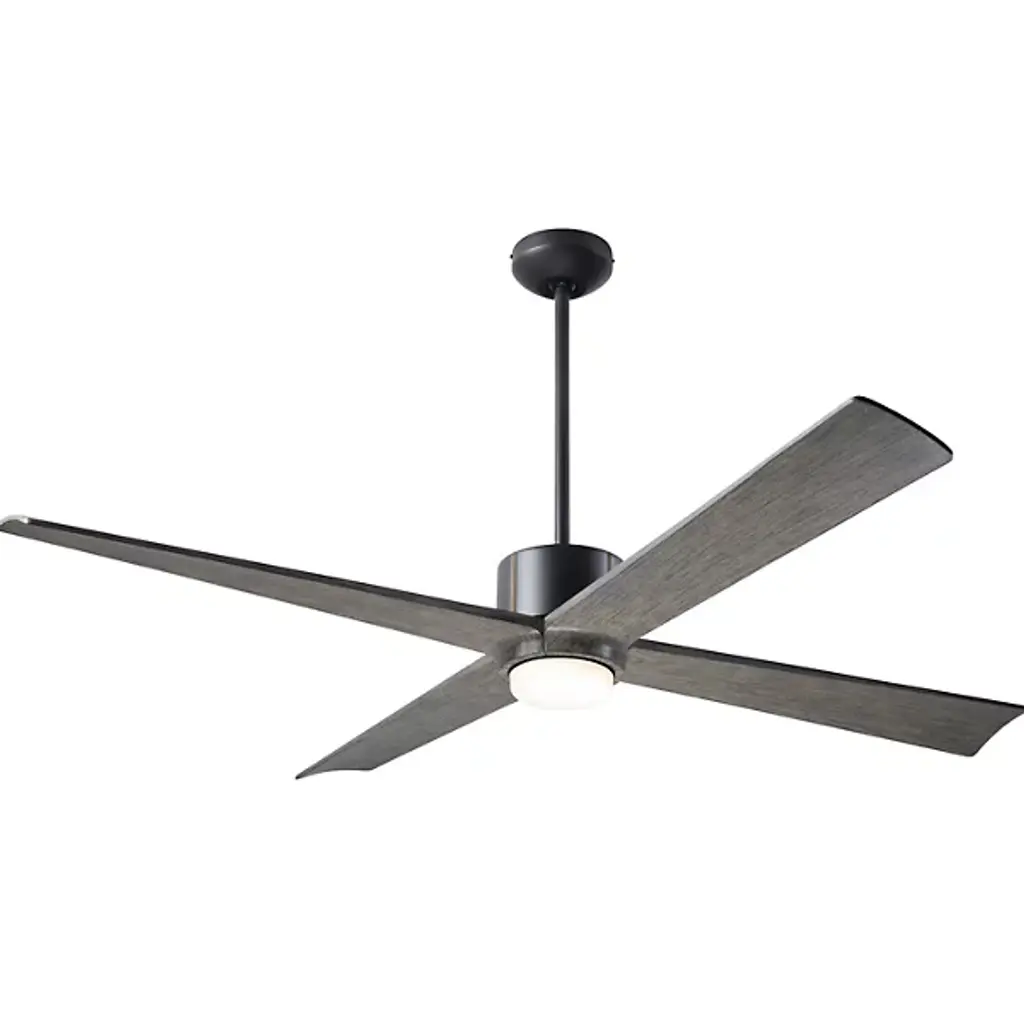 Enhance indoor environments with the Nouveau DC Ceiling Fan from Modern Fan Company. A robust construction with subtle retro lines, it is solidly joined to its mounting surface, dispatching a long stem down to a rounded, die-cast aluminum body featuring slender accent lines. Air is circulated via four precisely milled blades of solid wood etched on a CNC machine, adding a contemporary and clean surfaced edge to the fan fixture. The blades are reversible and whirl around a powerful DC motor, adding a waft of cool breeze and bringing cool comfort to the fan’s surroundings.