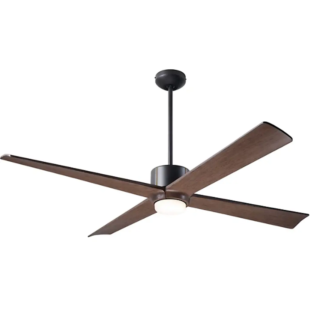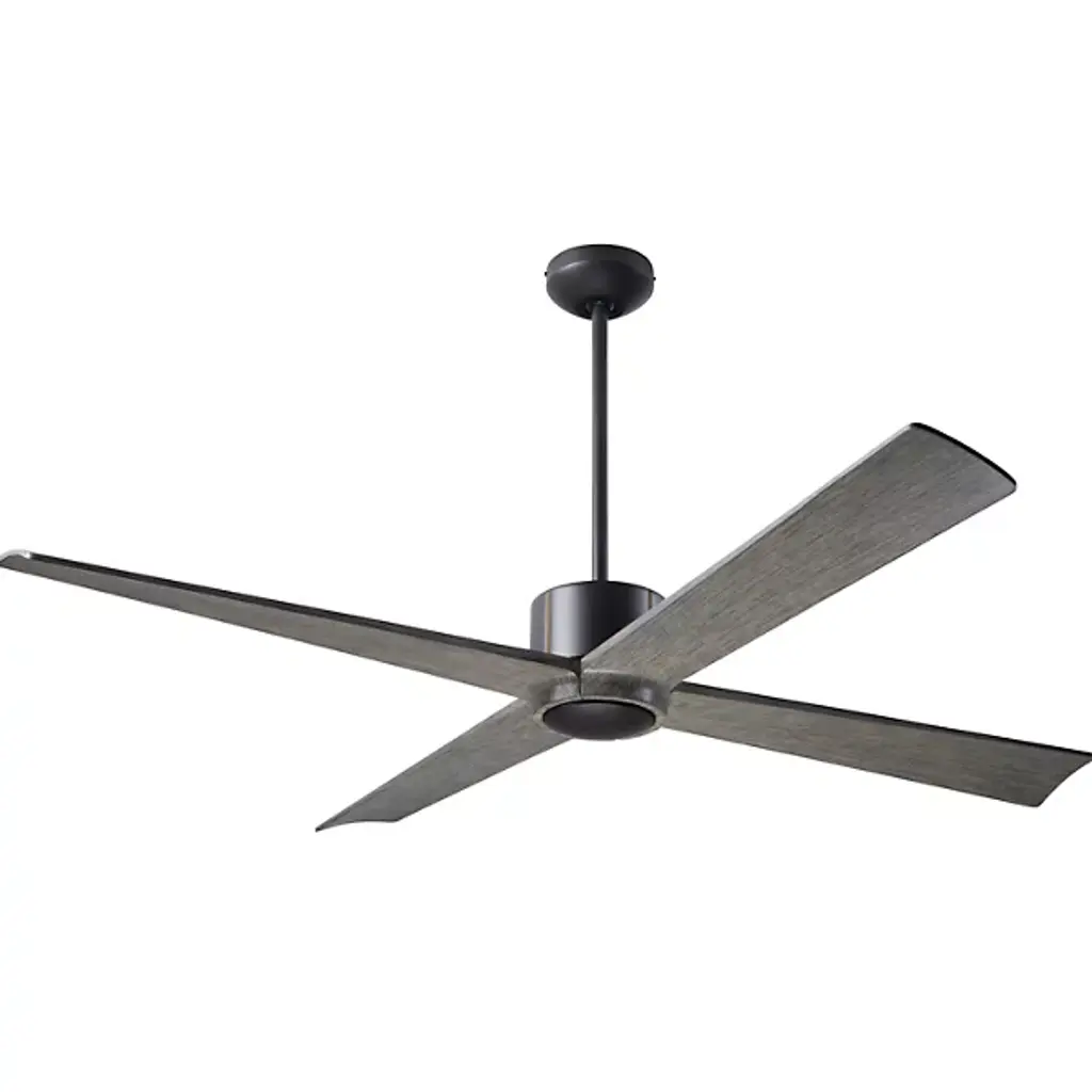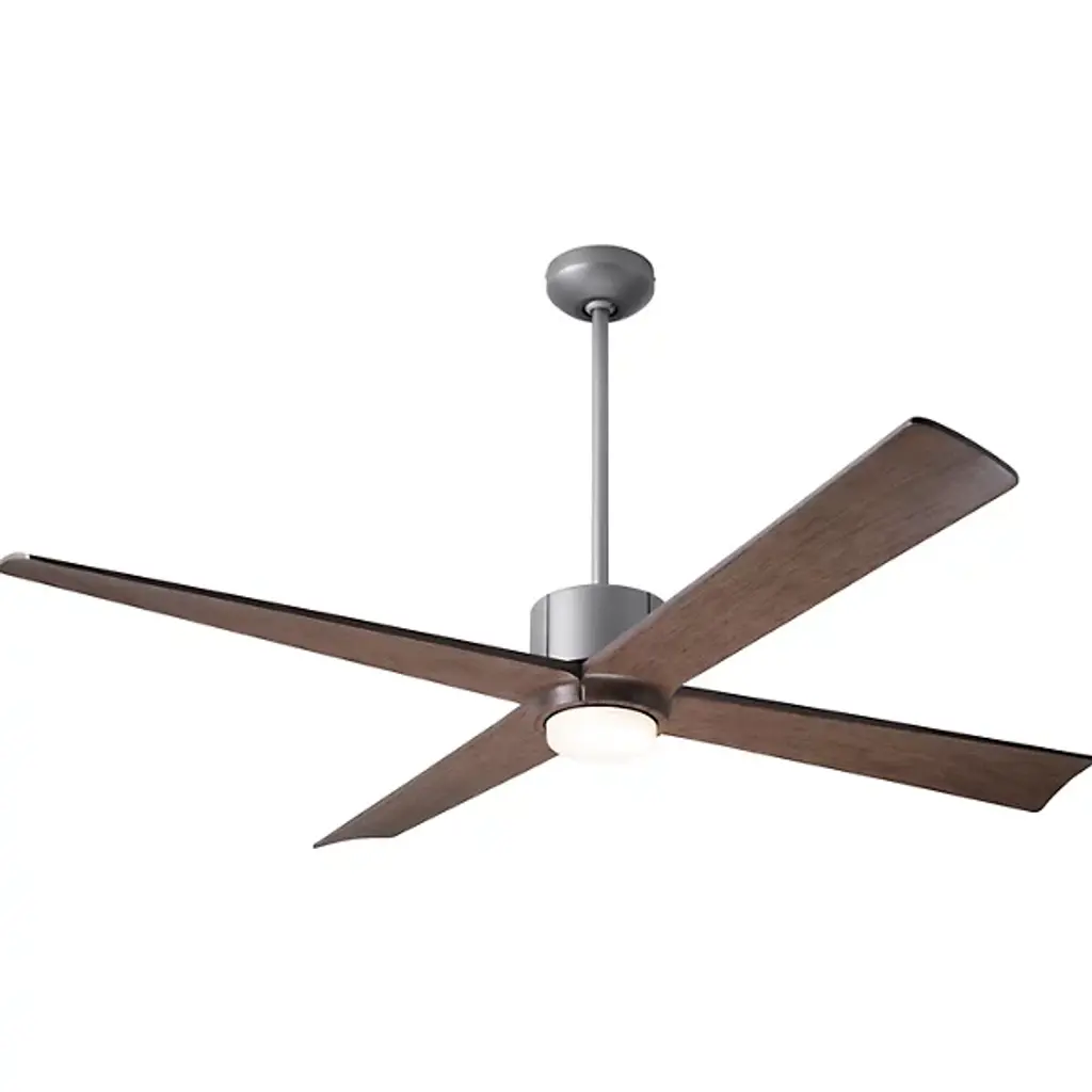 Enhance indoor environments with the Nouveau DC Ceiling Fan from Modern Fan Company. A robust construction with subtle retro lines, it is solidly joined to its mounting surface, dispatching a long stem down to a rounded, die-cast aluminum body featuring slender accent lines. Air is circulated via four precisely milled blades of solid wood etched on a CNC machine, adding a contemporary and clean surfaced edge to the fan fixture. The blades are reversible and whirl around a powerful DC motor, adding a waft of cool breeze and bringing cool comfort to the fan’s surroundings.