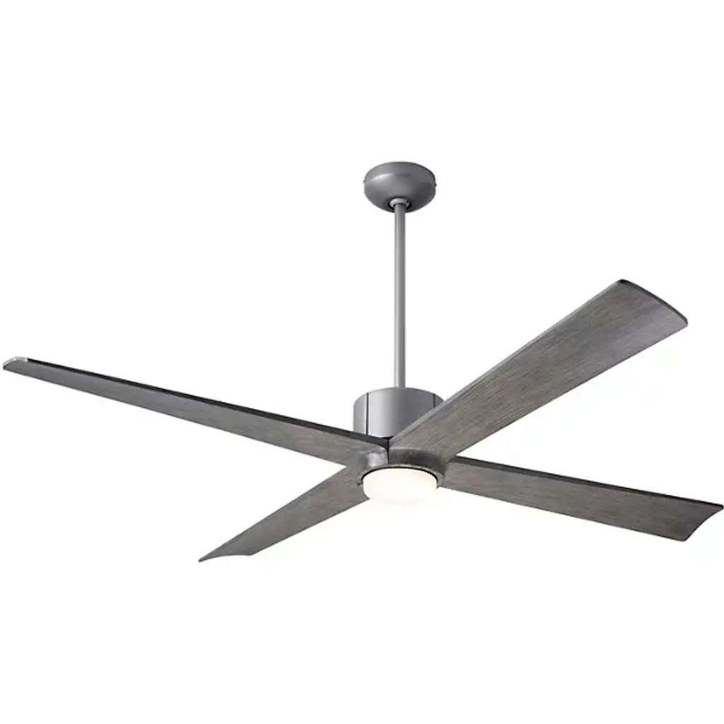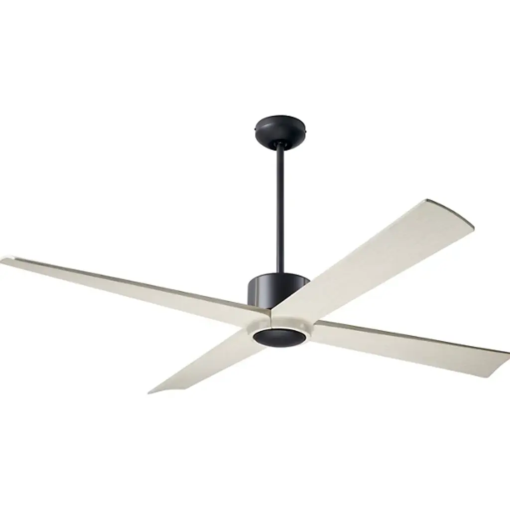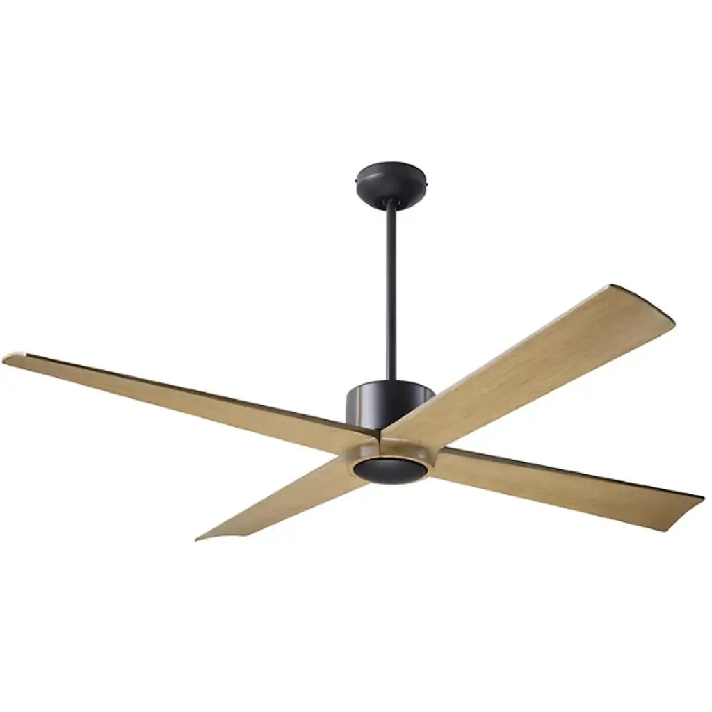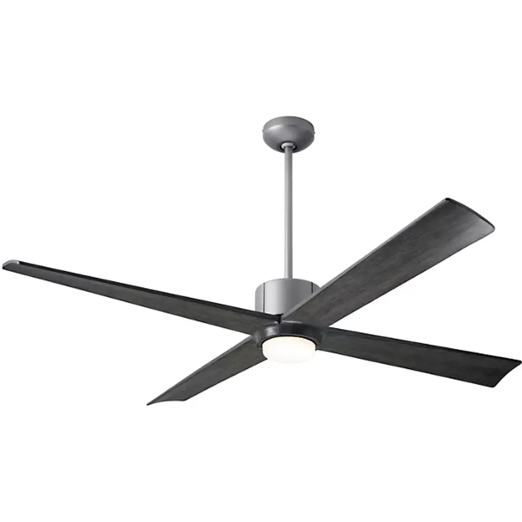 Enhance indoor environments with the Nouveau DC Ceiling Fan from Modern Fan Company. A robust construction with subtle retro lines, it is solidly joined to its mounting surface, dispatching a long stem down to a rounded, die-cast aluminum body featuring slender accent lines. Air is circulated via four precisely milled blades of solid wood etched on a CNC machine, adding a contemporary and clean surfaced edge to the fan fixture. The blades are reversible and whirl around a powerful DC motor, adding a waft of cool breeze and bringing cool comfort to the fan’s surroundings.