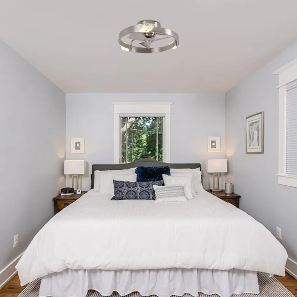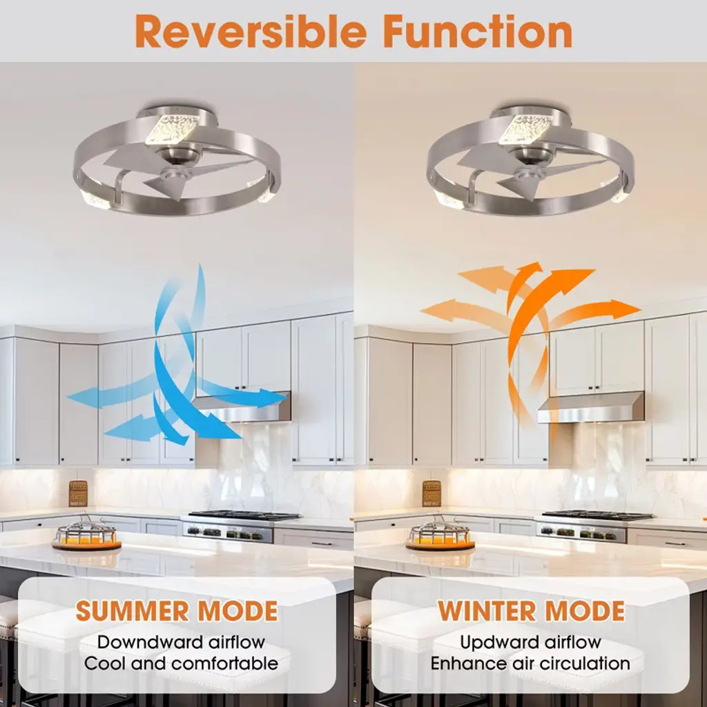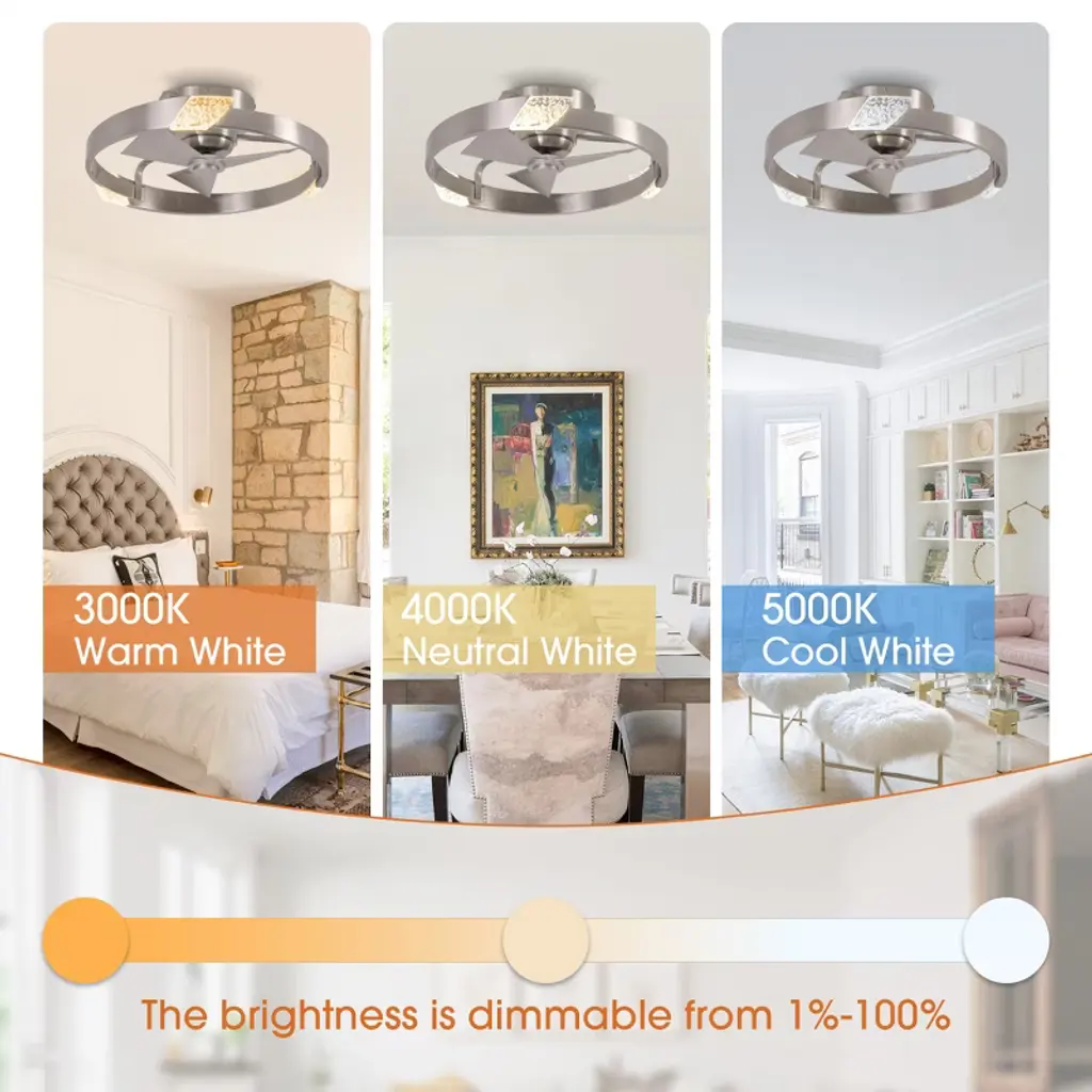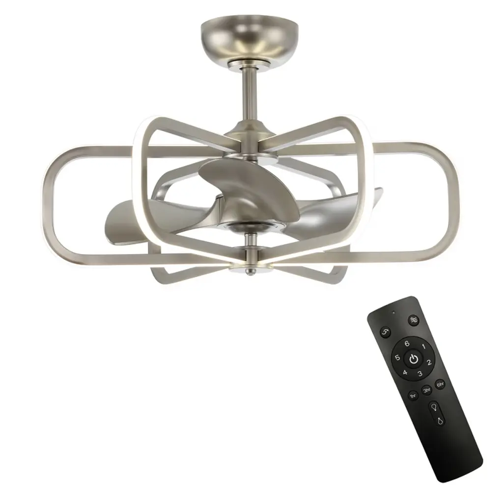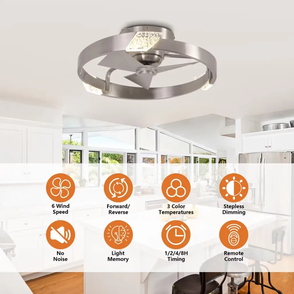 This 20-inch Bladeless Ceiling Fan features a ceiling-mounted design with three integrated fan blades for easy installation and space saving. The surface of the Cage Ceiling Fans is embedded with an integrated LED light source that supports three color temperature adjustments to meet the needs of different scenarios, and comes with a remote control for easy operation. The simple and modern appearance is suitable for small rooms, taking into account the functions of lighting and ventilation, and is highly practical.