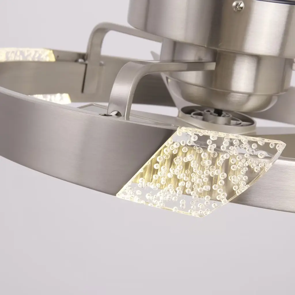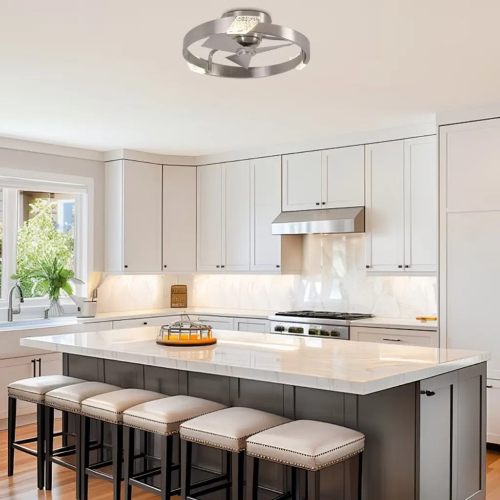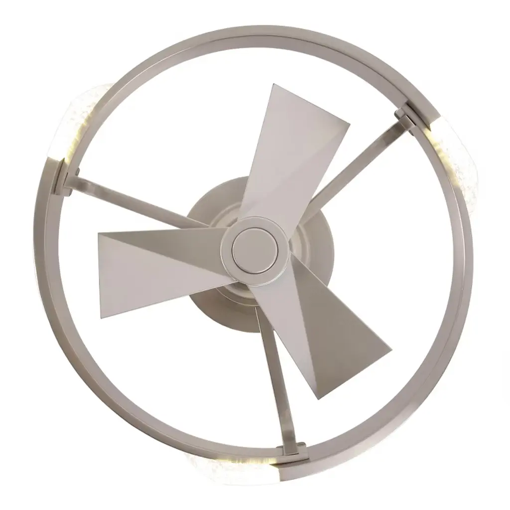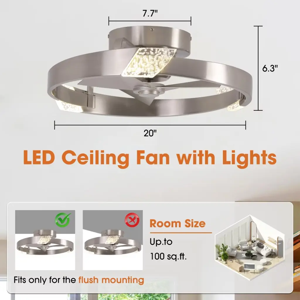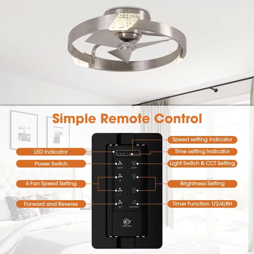 This 20-inch Bladeless Ceiling Fan features a ceiling-mounted design with three integrated fan blades for easy installation and space saving. The surface of the Cage Ceiling Fans is embedded with an integrated LED light source that supports three color temperature adjustments to meet the needs of different scenarios, and comes with a remote control for easy operation. The simple and modern appearance is suitable for small rooms, taking into account the functions of lighting and ventilation, and is highly practical.