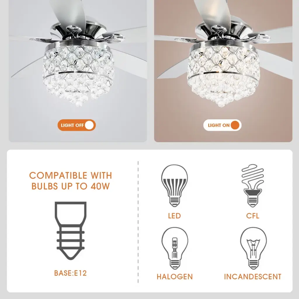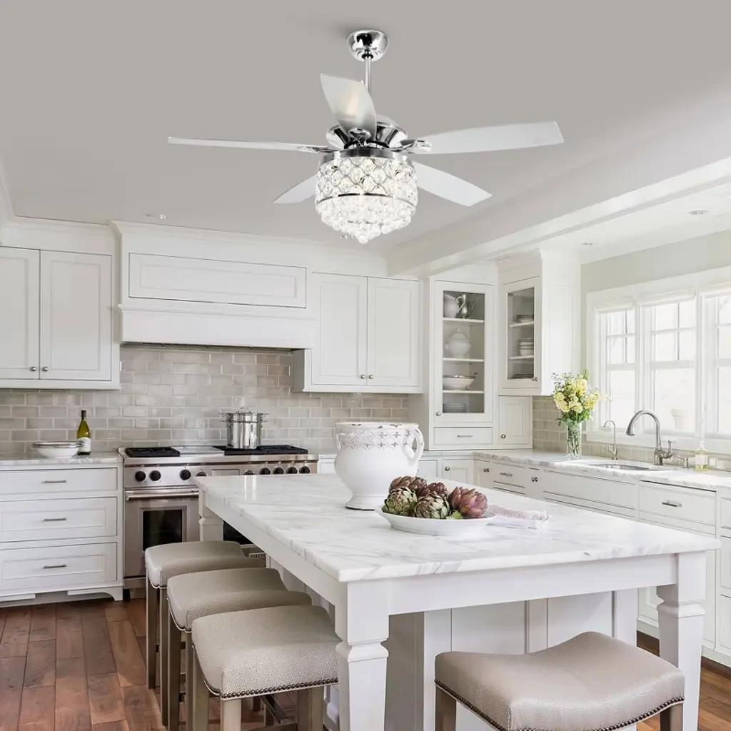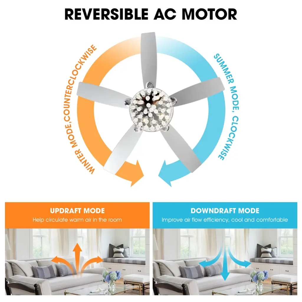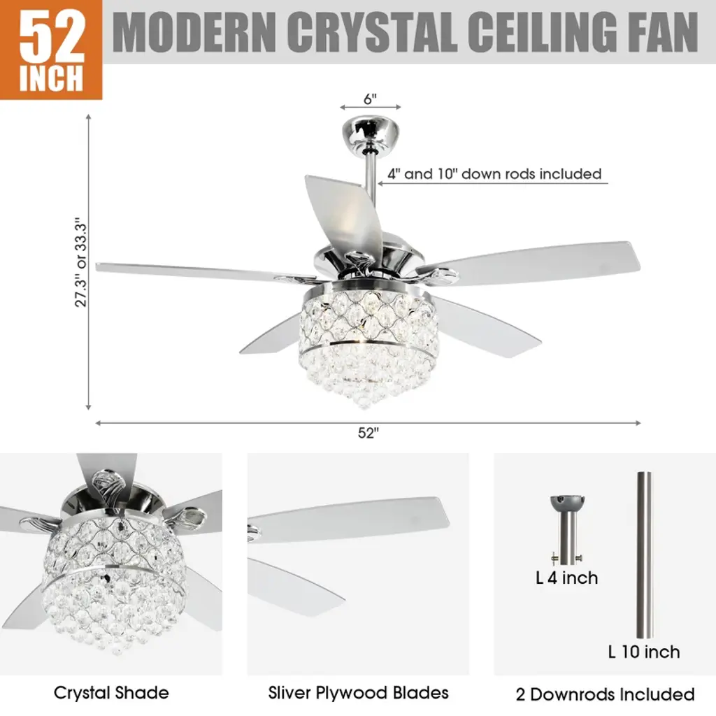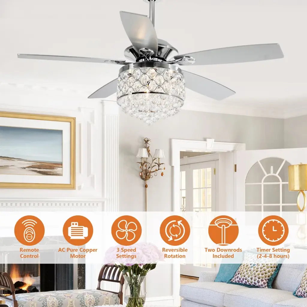 This 52-inch modern ceiling fan with light combines practical functionality with exquisite aesthetics, bringing refreshing comfort and stylish atmosphere to your home space. Its classic white crystal lampshade design, transmits light softly and with a sense of hierarchy, refracting a dazzling effect. Equipped with a high-performance reversible motor, it opens the forward air supply mode in summer, with three adjustable wind speeds (low/medium/high), quickly dispersing the stifling heat; and switches to reverse rotation in winter, promoting warm air circulation and helping to equalize the room temperature, which is both energy-saving and practical. Thoughtfully equipped with two different lengths of the lower rod, the installation height is freely adjustable to meet the needs of different scenes in the living room, bedroom, dining room and so on. With intelligent remote control, you can control the whole house comfort without getting up.