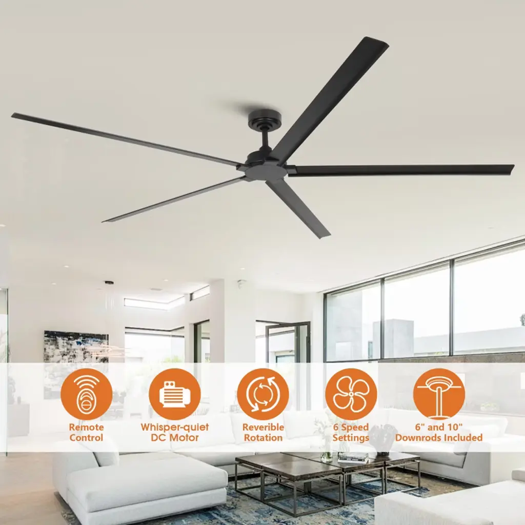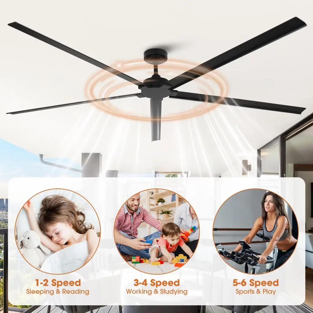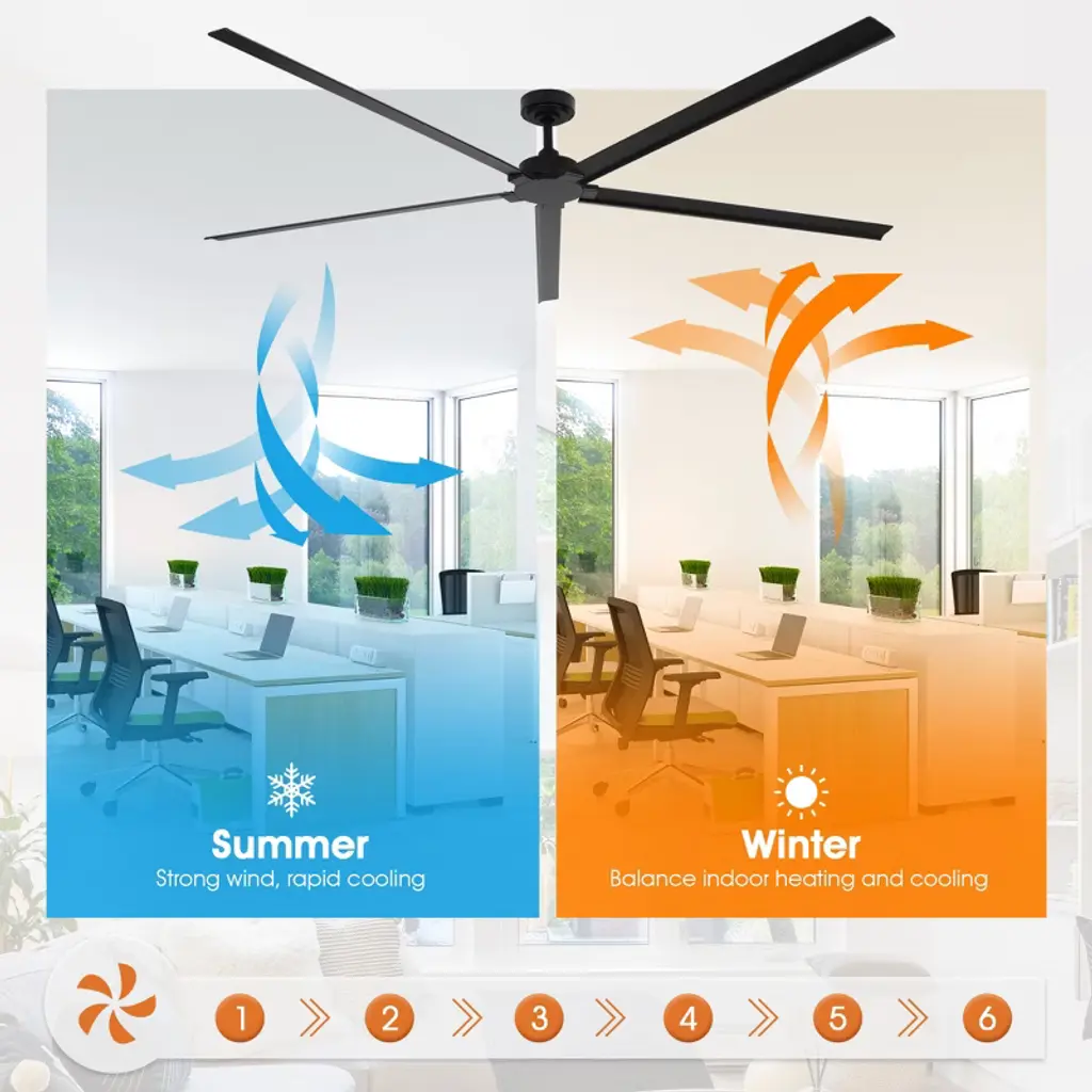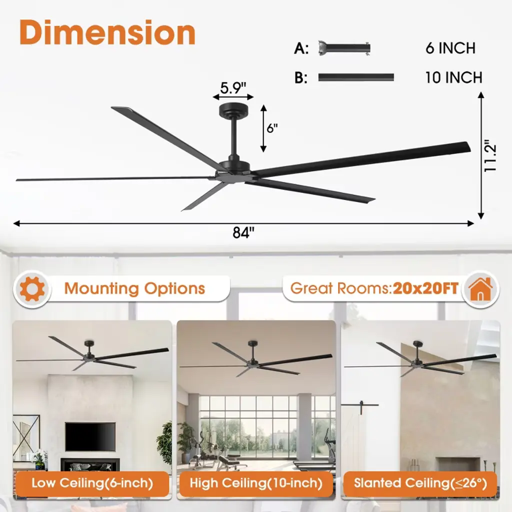 This 84-inch industrial lightless ceiling fan is centered on a minimalist, ultra-thin shape, with an all-aluminum metal body that not only has an outstanding texture, but also has excellent rust and corrosion resistance, making it suitable for high humidity environments. Designed for indoor and outdoor multi-scenarios, it passes the stringent waterproof test (IP55 rating) and can also operate stably in rainy days, making it an ideal choice for semi-open spaces such as courtyards, garages, factories, and so on. Functionally, it supports 6 precise wind speed remote control adjustments to meet different wind requirements; timer switch function can be preset to automatically turn off in 1/2/4/8 hours, energy saving and power saving. The motor adopts pure copper core technology, strong power while maintaining low noise, with aerodynamic fan blades, even and soft wind. Simple installation, suitable for standard ceiling structure, without additional wiring, taking into account the practicality and aesthetics, is to enhance the comfort of the space cost-effective choice.