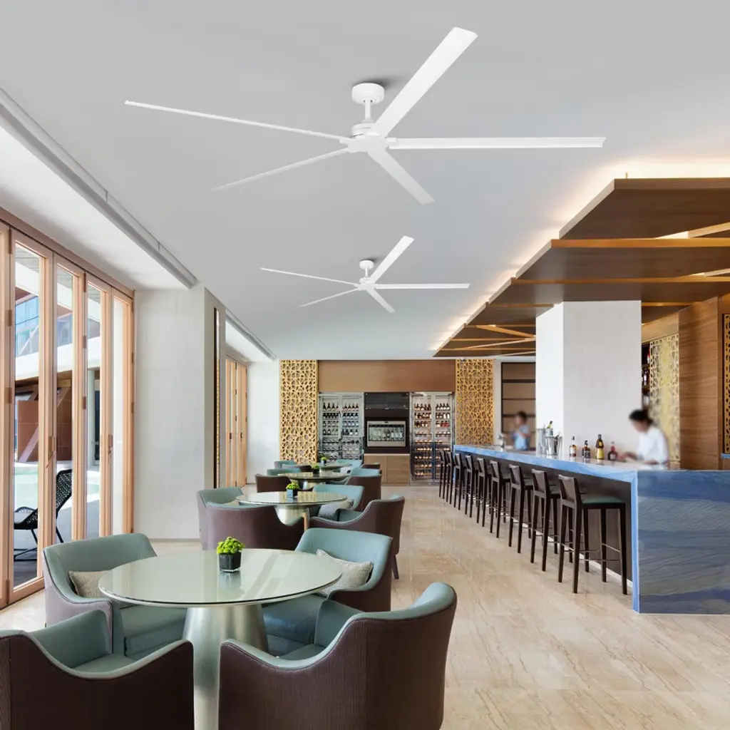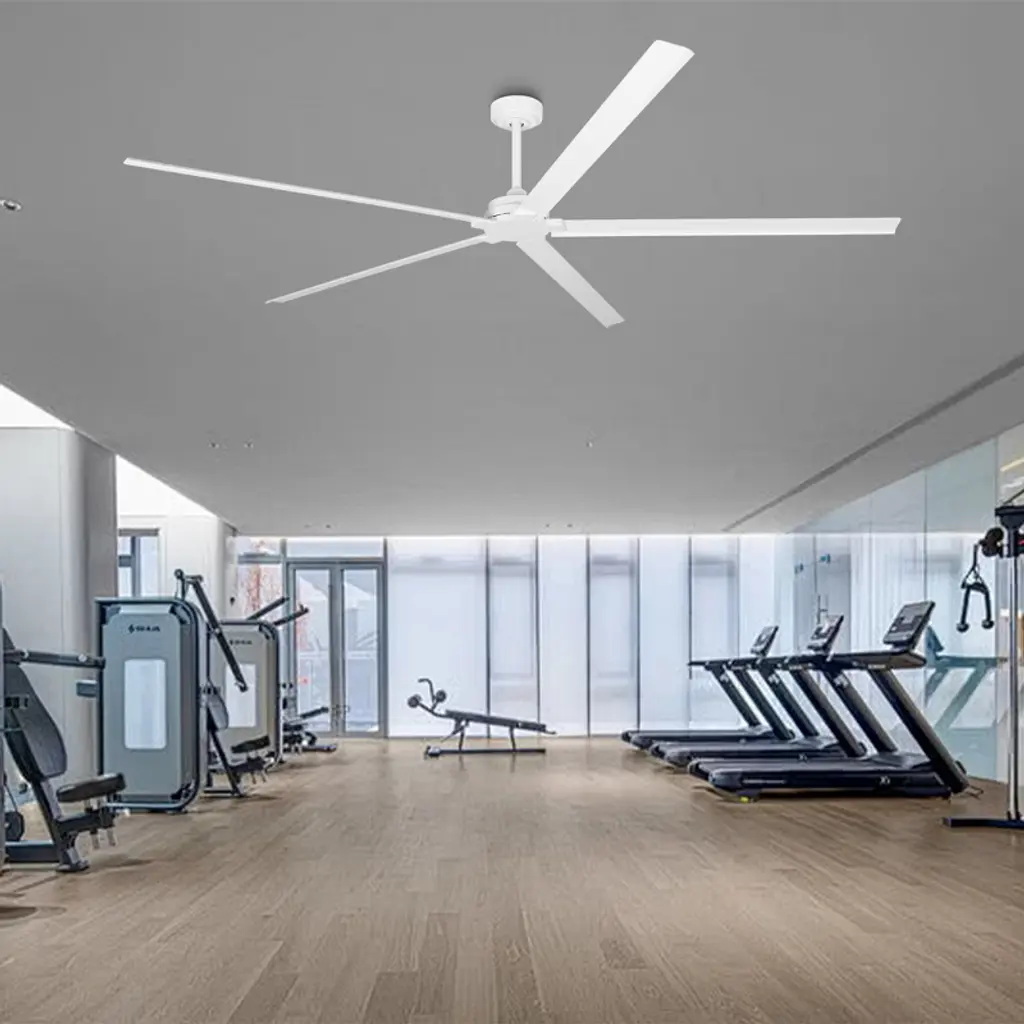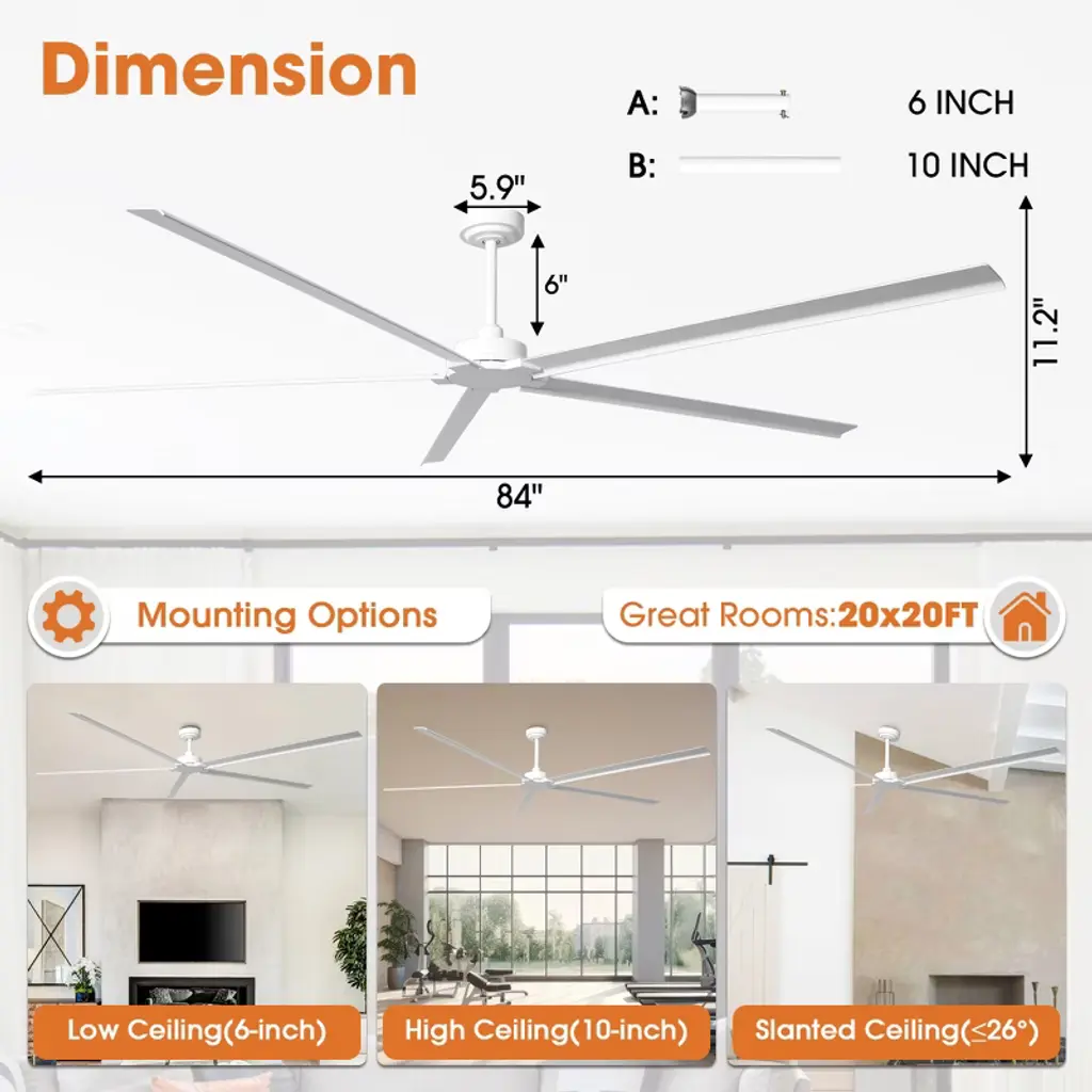 This 84-inch industrial lightless ceiling fan is centered on a minimalist, ultra-thin shape, with an all-aluminum metal body that not only has an outstanding texture, but also has excellent rust and corrosion resistance, making it suitable for high humidity environments. Designed for indoor and outdoor multi-scenarios, it passes the stringent waterproof test (IP55 rating) and can also operate stably in rainy days, making it an ideal choice for semi-open spaces such as courtyards, garages, factories, and so on. Functionally, it supports 6 precise wind speed remote control adjustments to meet different wind requirements; timer switch function can be preset to automatically turn off in 1/2/4/8 hours, energy saving and power saving. The motor adopts pure copper core technology, strong power while maintaining low noise, with aerodynamic fan blades, even and soft wind. Simple installation, suitable for standard ceiling structure, without additional wiring, taking into account the practicality and aesthetics, is to enhance the comfort of the space cost-effective choice.