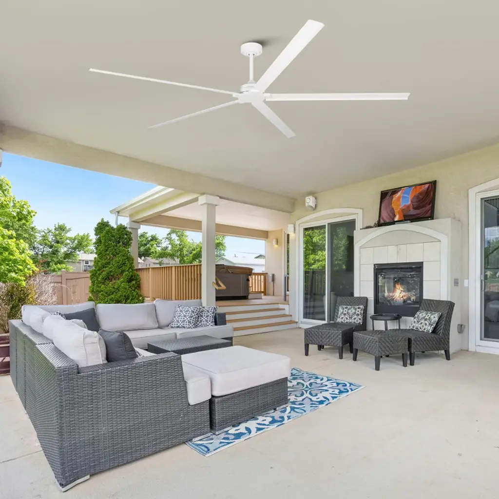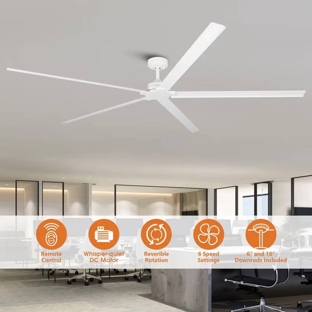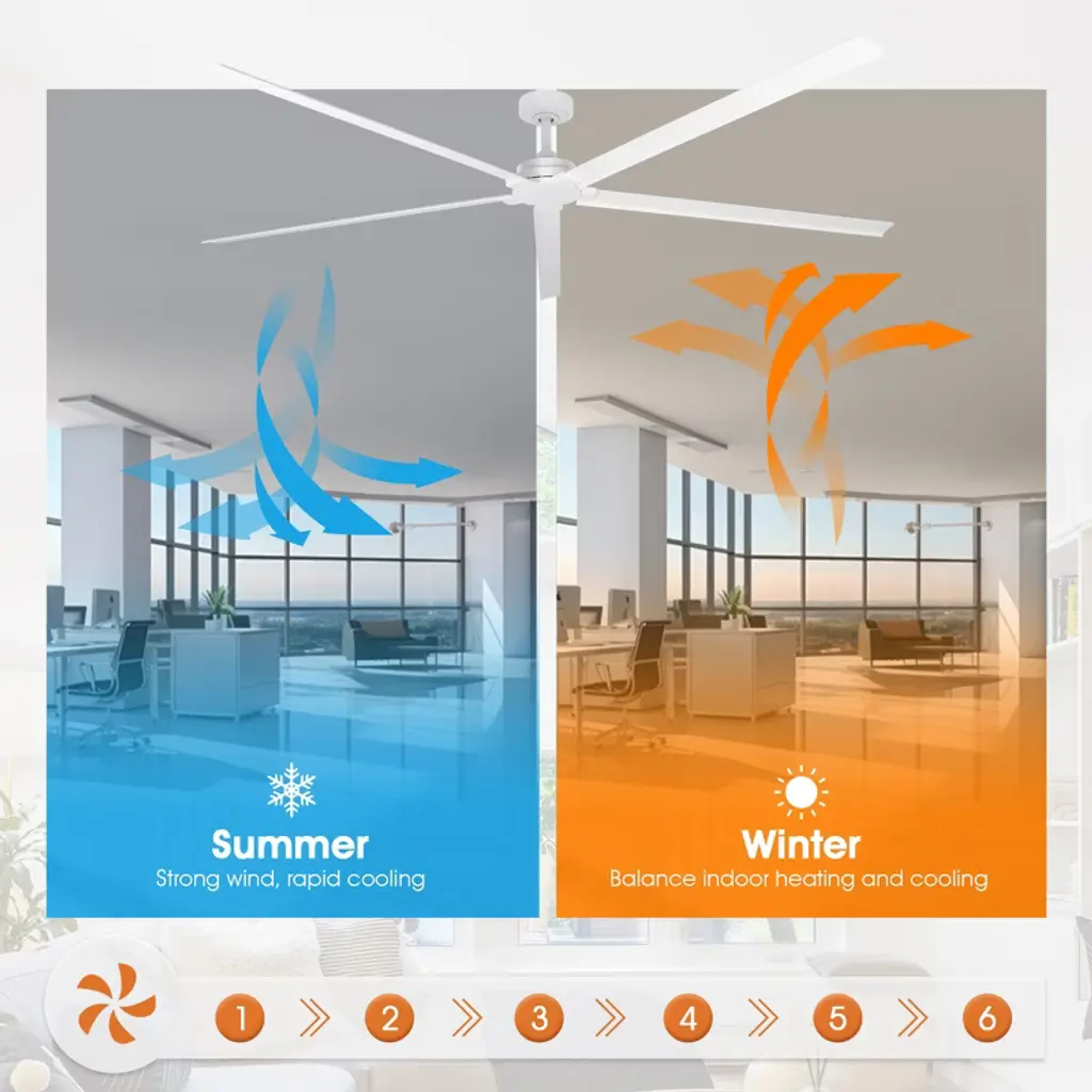 This 84-inch industrial lightless ceiling fan is centered on a minimalist, ultra-thin shape, with an all-aluminum metal body that not only has an outstanding texture, but also has excellent rust and corrosion resistance, making it suitable for high humidity environments. Designed for indoor and outdoor multi-scenarios, it passes the stringent waterproof test (IP55 rating) and can also operate stably in rainy days, making it an ideal choice for semi-open spaces such as courtyards, garages, factories, and so on. Functionally, it supports 6 precise wind speed remote control adjustments to meet different wind requirements; timer switch function can be preset to automatically turn off in 1/2/4/8 hours, energy saving and power saving. The motor adopts pure copper core technology, strong power while maintaining low noise, with aerodynamic fan blades, even and soft wind. Simple installation, suitable for standard ceiling structure, without additional wiring, taking into account the practicality and aesthetics, is to enhance the comfort of the space cost-effective choice.