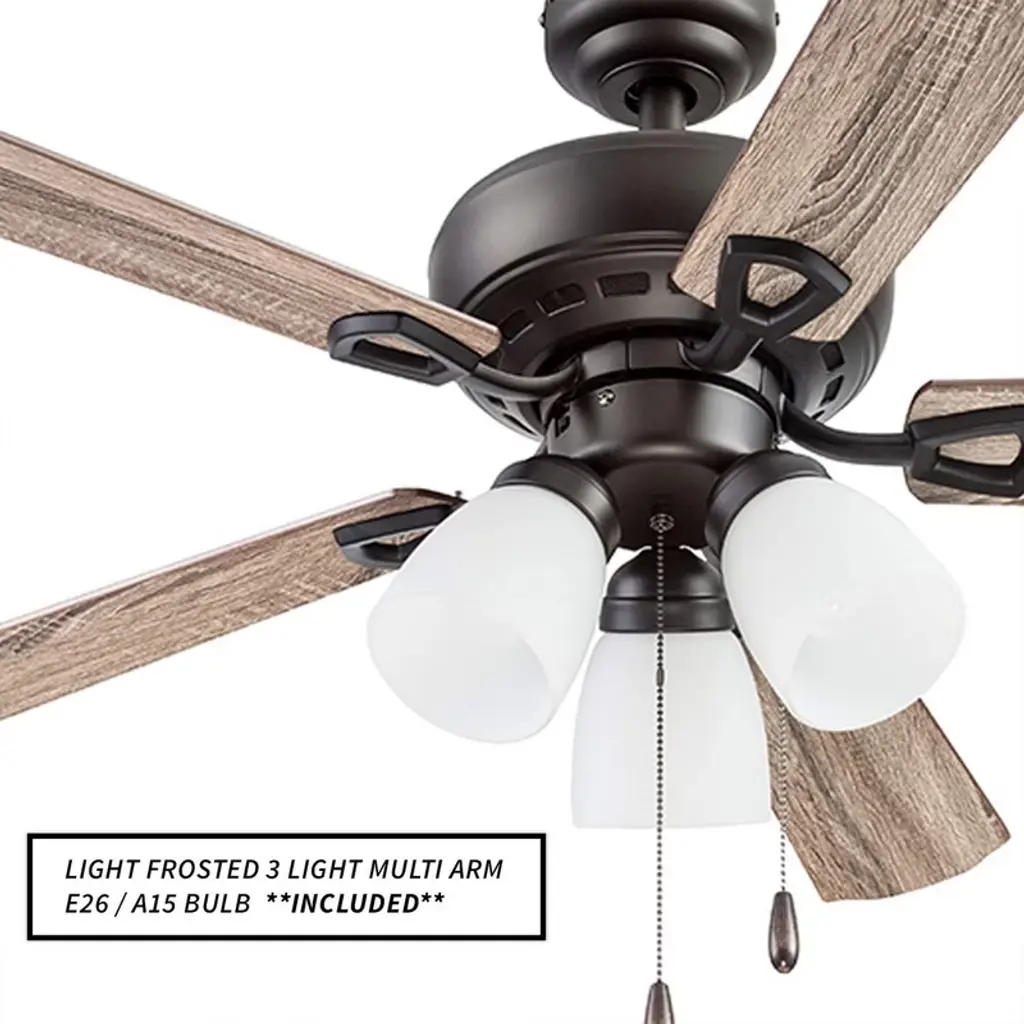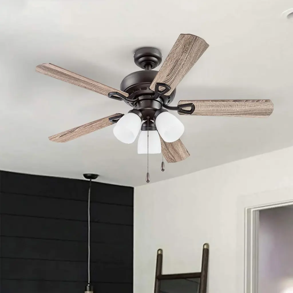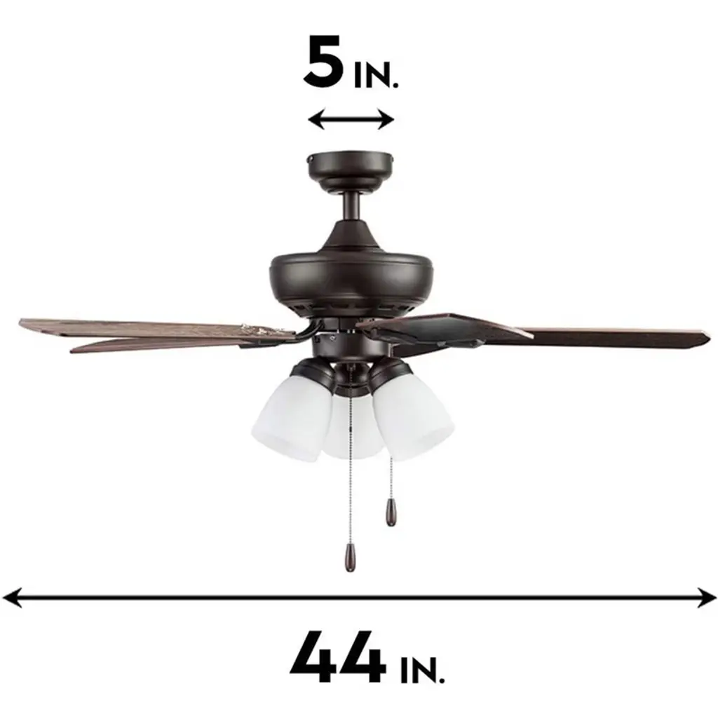 This 44-Inch Miller Park Ceiling Fan with a quiet, reversible motor is the perfect addition to any room, providing a peaceful indoor environment year-round. The 3-speed reversible motor offers versatile performance, keeping you cool in the summer and circulating warm air in the winter to help reduce energy costs. Ideal for spaces up to 350 square feet, it’s perfect for living rooms, bedrooms, dining rooms, and family rooms. Included with the fan are energy-efficient LED bulbs to brighten up any room in the home or office space while offering long-lasting illumination. The fan is perfect for medium-sized rooms, ensuring optimal air circulation without taking up valuable space. It also features reversible blades in Walnut and Chocolate Maple, allowing the fan to seamlessly blend with your existing decor. With a pull chain control for easy operation, this fan is crafted from a combination of wood, glass, and metal in a sleek bronze finish. The fan measures 44 inches long, making it a compact and stylish solution for medium-sized rooms. Installation can be completed in 45 to 60 minutes. Enjoy comfort, energy savings, and stylish, sleek design all in one with this Renton Indoor Ceiling Fan with quiet, reversible motor from Portage Bay, designed to fit your space and enhance your home's decor.