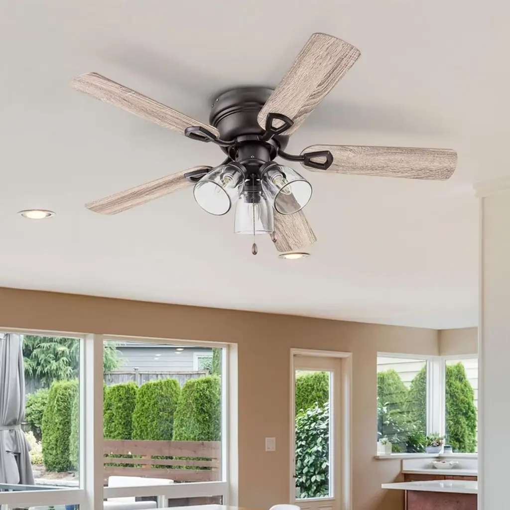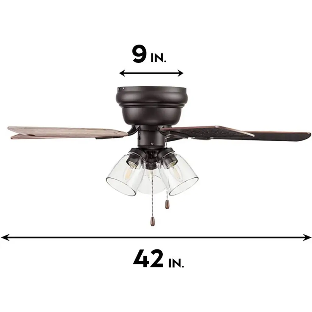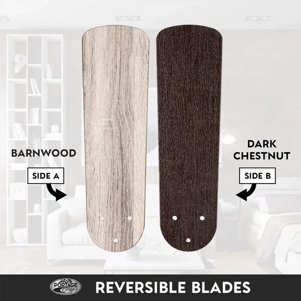 This 42-Inch Renton Ceiling Fan with a quiet, reversible motor is the perfect addition to any room, providing a peaceful indoor environment year-round. The 3-speed reversible motor offers versatile performance, keeping you cool in the summer and circulating warm air in the winter to help reduce energy costs. Ideal for spaces up to 350 square feet, it’s perfect for living rooms, bedrooms, dining rooms, and family rooms. Included with the fan are energy-efficient LED bulbs to brighten up any room in the home or office space while offering long-lasting illumination. The fan is perfect for medium-sized rooms, ensuring optimal air circulation without taking up valuable space. It also features reversible blades in Barnwood and Dark Chestnut, allowing the fan to seamlessly blend with your existing decor. With a pull chain control for easy operation, this fan is crafted from a combination of wood, glass, and metal in a sleek bronze finish. The fan measures 42 inches long, making it a compact and stylish solution for medium-sized rooms. Installation can be completed in 45 to 60 minutes. Enjoy comfort, energy savings, and stylish, sleek design all in one with this Renton Indoor Ceiling Fan with quiet, reversible motor from Portage Bay, designed to fit your space and enhance your home's decor.