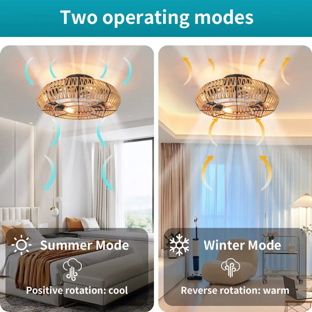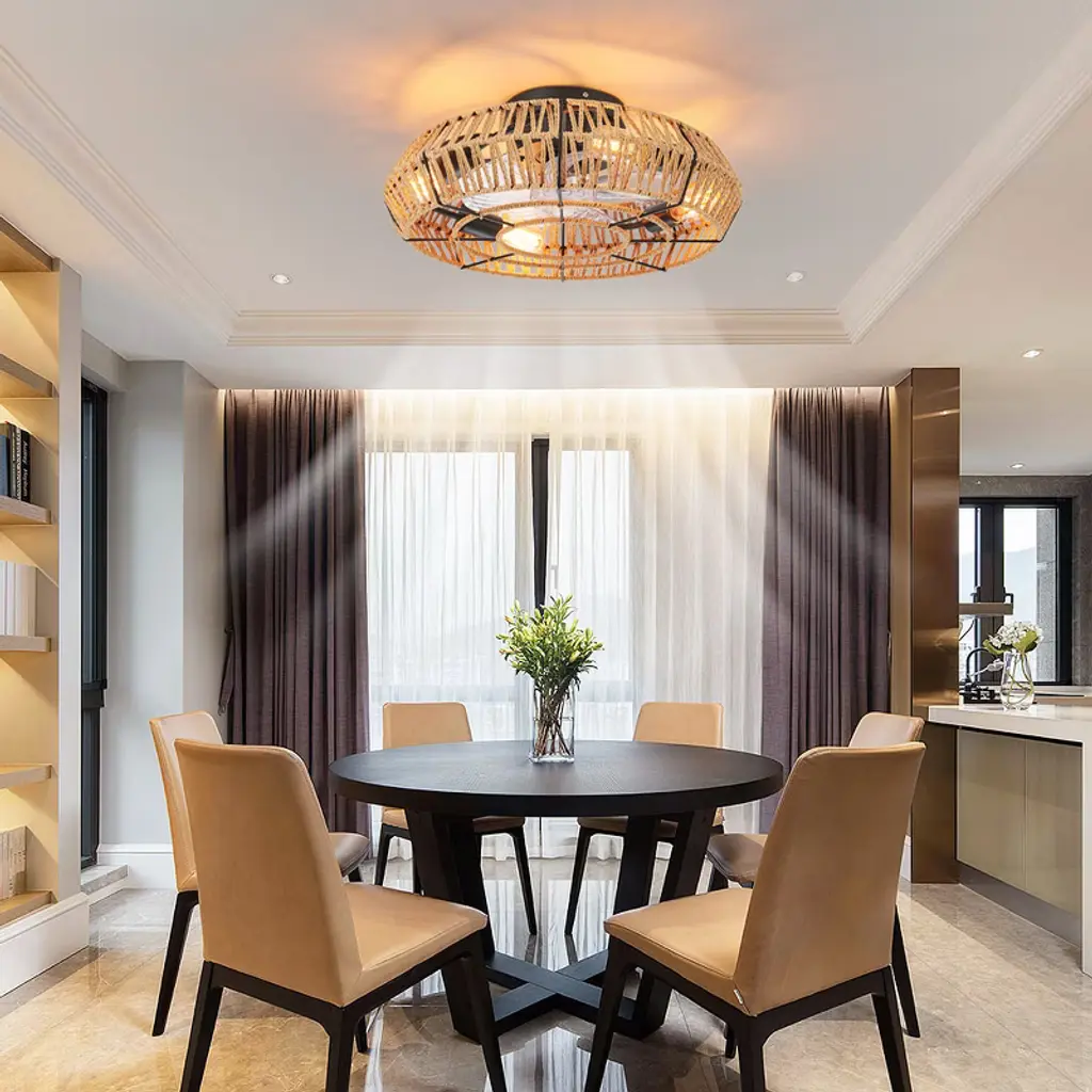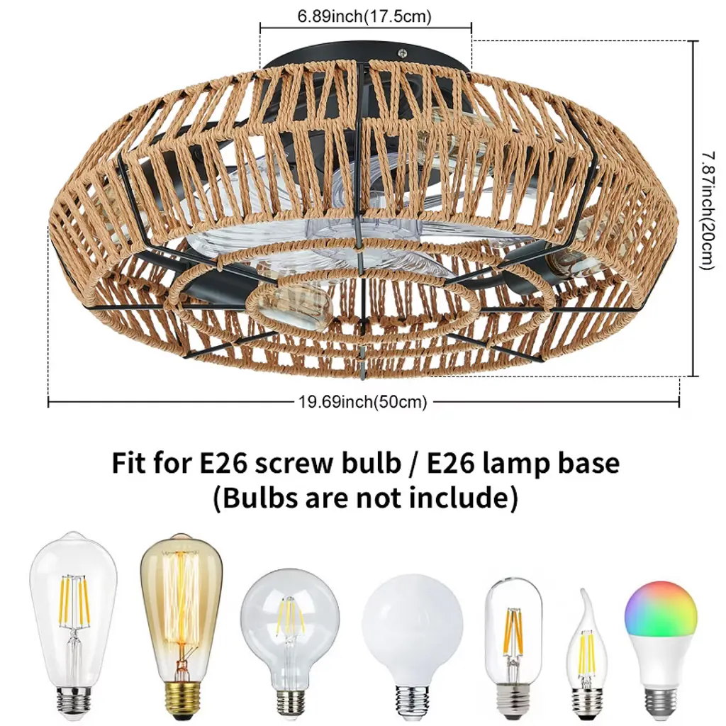 This unique ceiling fan light blends rustic aesthetics with modern functionality, featuring a matte black iron mesh cage and hand-wound hemp rope accents for a vintage-industrial look. The sturdy metal frame and ABS-coated transparent fan blades ensure durability while maintaining a quiet, noiseless operation—perfect for bedrooms or living spaces. Enjoy customizable comfort with 6-speed airflow control and a convenient 1/2/4/8/12-hour timer, all easily managed via the included remote control. The metal safety cage provides added protection, while the E26 bulb sockets (bulbs not included) offer warm, dispersed lighting. Whether your style leans toward urban loft or cozy countryside, this fan light combines industrial durability and bohemian elegance, making it both a striking decor piece and a practical addition to any room.