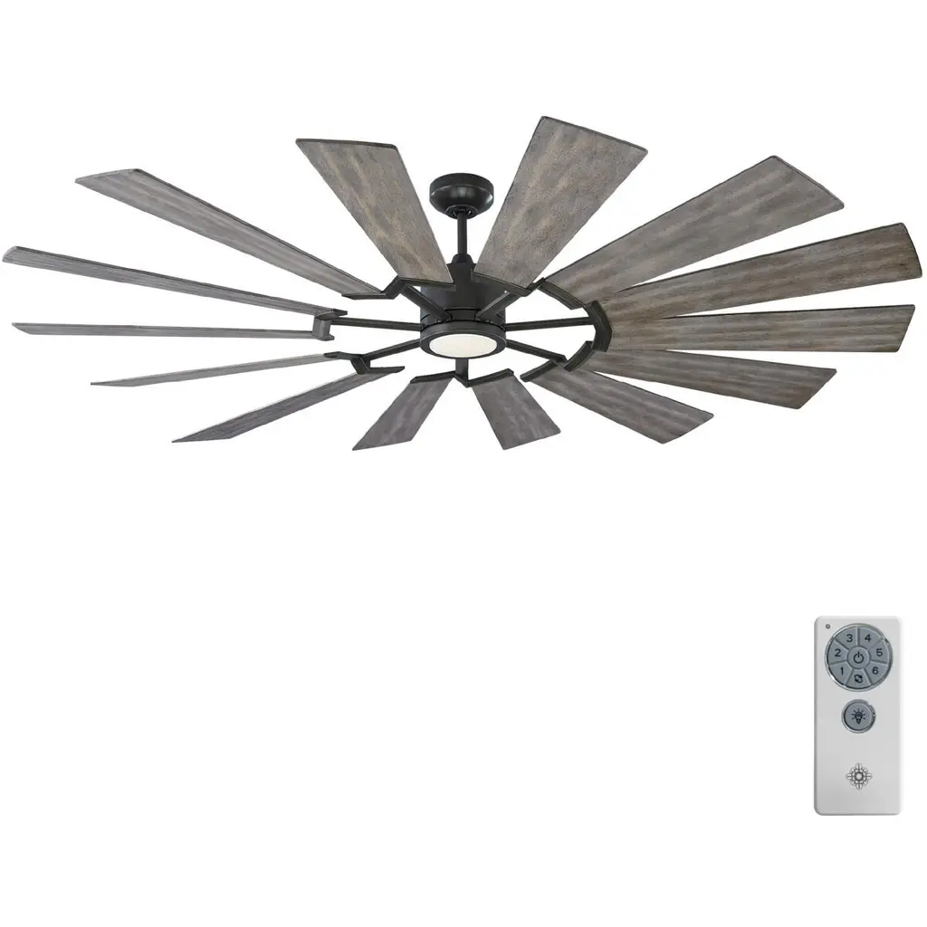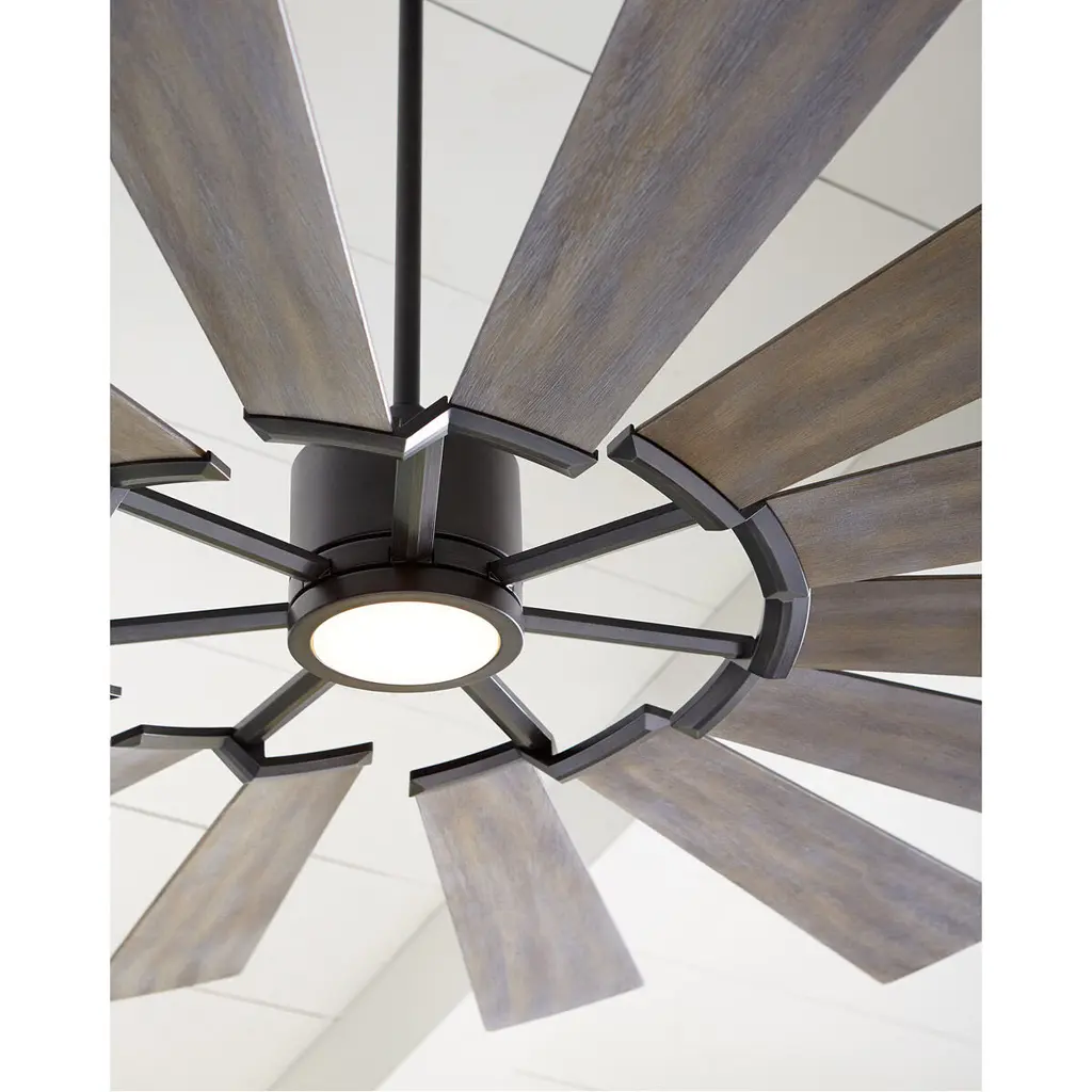 The Prairie 72 LED in Aged Pewter features a 125.0 X 25.0 6-speed motor with a Fourteen-degree blade pitch. A stunning windmill-inspired aesthetic with 14 blades and a stately 72" blade sweep makes the Prairie Grand ceiling fan bold and beautiful design. Two distinct finish options are Aged Pewter with Light Grey Weathered Oak blades and Brushed Steel with Washed Grey/Silver reversible blades. An integrated 15W LED downlight with 740 net lumens is covered with a frosted Lexan shade. An included 6-speed remote control adds to the functionality of this fan. All Prairie Grand fans come with a finishing cap without a light kit.