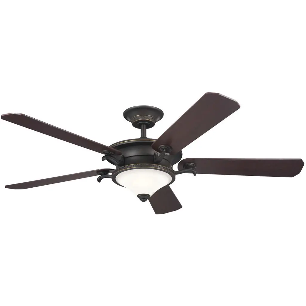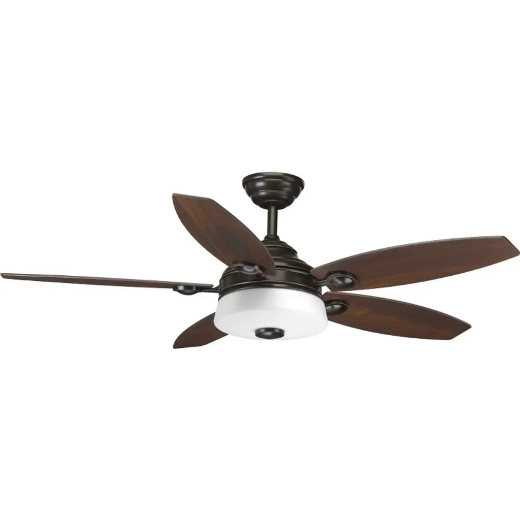 Introducing the Graceful 54-inch ceiling fan from Progress Lighting. Made of durable steel with an elegant Antique Bronze finish, this fan features five American Walnut/Medium Cherry reversible blades, adding a touch of sophistication to any room. The integrated LED light kit with a 90 CRI and 3000 Kelvin color temperature provides energy-efficient illumination. The fan is dry rated and comes with a remote for convenient control of dimming and fan speed. With a reversible motor and a stylish white opal glass shade, the Graceful fan is a perfect blend of style and functionality. Canopy and shade included. Refresh your living space with the Graceful fan's crisp, clean design and energy-saving benefits.
