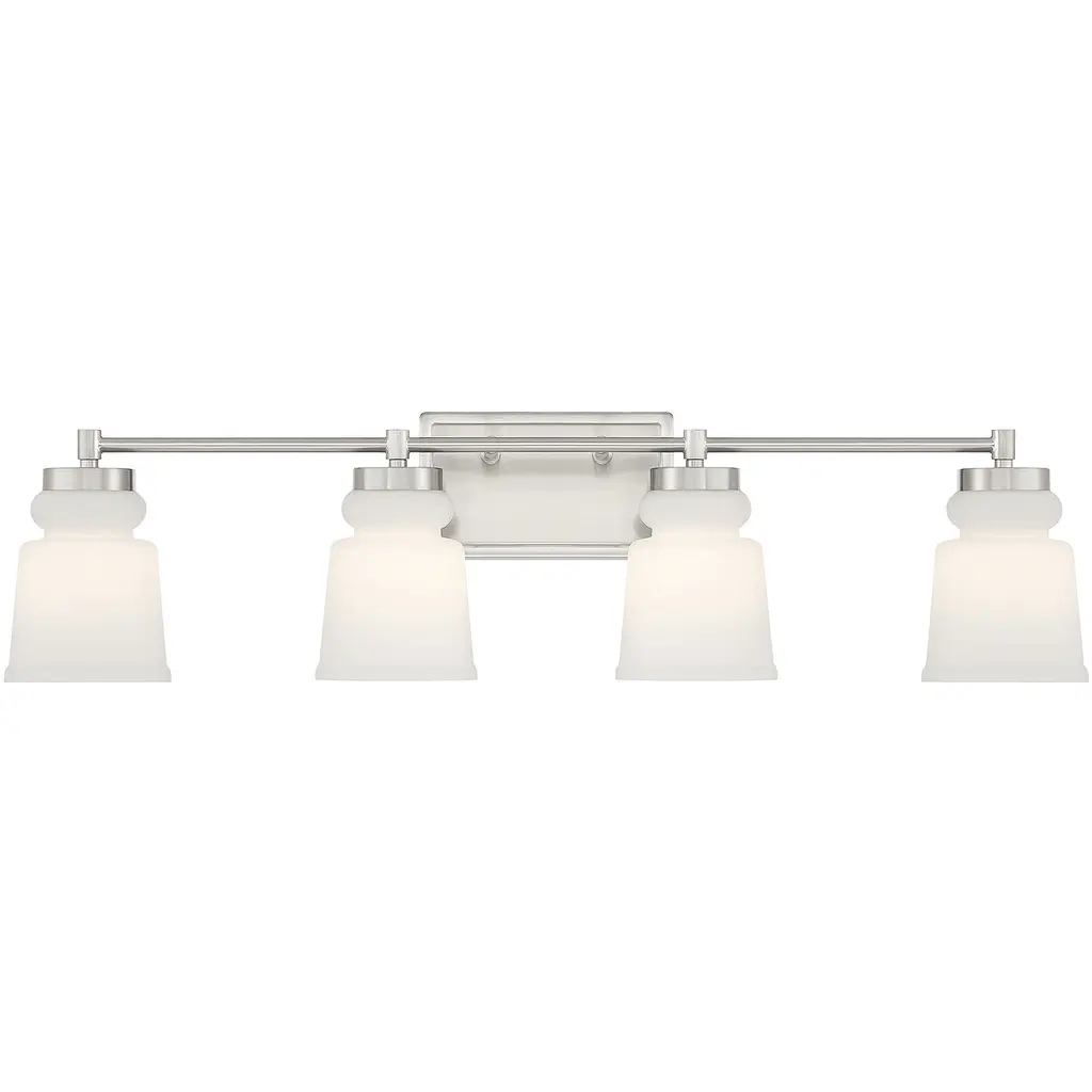 Introducing the Enclave Collection by Quorum Lighting. Crafted with high-quality glass and finished in a sleek satin nickel color, this stunning fixture adds a touch of elegance to any space. With a width of 26.5", height of 8.5", and depth of 7", it is the perfect size for both large and small rooms. Featuring four bulbs with a wattage of 100 watts each, this fixture provides ample lighting. Although not dimmable, it is damp rated, making it suitable for use in bathrooms or other moisture-prone areas. The shade is included, completing the sophisticated look of this Enclave Collection piece. Trust Quorum Lighting for exceptional quality and style.