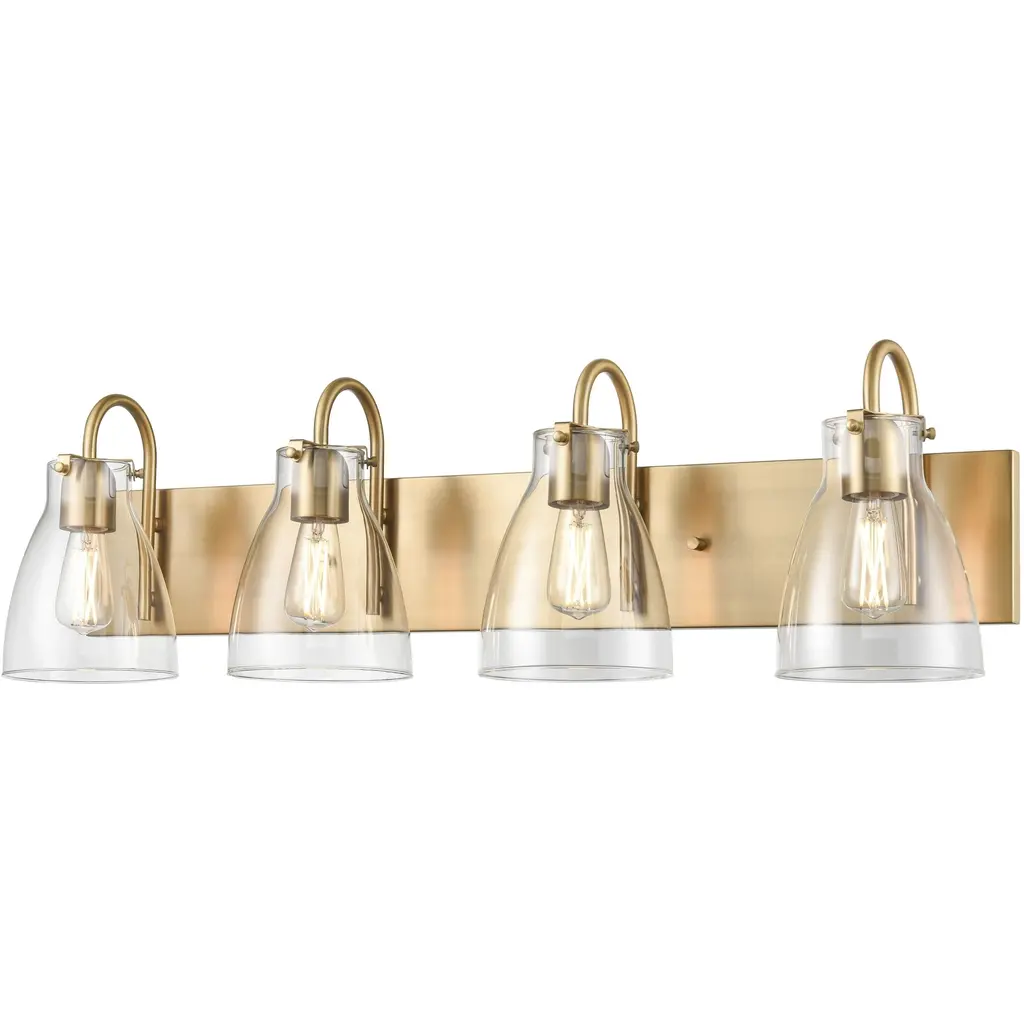 Introducing the Rossington Collection by Quorum Lighting. Crafted with exquisite attention to detail, this stunning fixture is made of high-quality glass and features an elegant aged brass finish. With a width of 30 inches, height of 9 inches, and depth of 6 inches, it is the perfect size to make a statement in any room. The Rossington Collection includes four bulbs with a wattage of 100 watts each, providing ample illumination. While not dimmable, this fixture is damp rated, making it suitable for use in bathrooms or other moisture-prone areas. The shade is included, adding an extra touch of sophistication. Elevate your space with the Rossington Collection from Quorum Lighting.