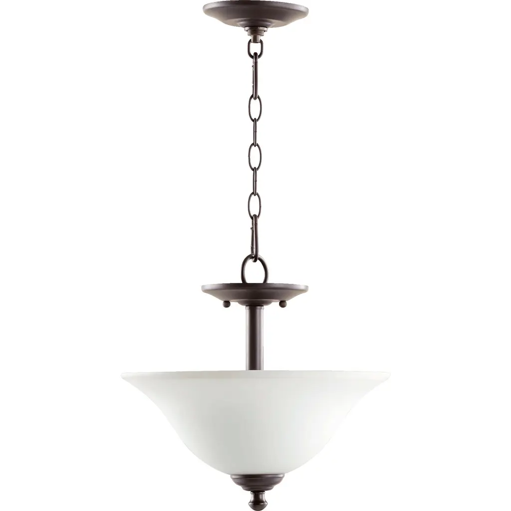 Introducing the Spencer Collection by Quorum Lighting. This beautifully designed product features an oiled bronze finish, adding a touch of elegance to any space. With a width of 13" and a height of 10.5", this fixture is the perfect size for a variety of rooms. It includes two bulbs with a wattage of 75 watts, providing ample lighting for your needs. While not dimmable, this dry rated fixture is suitable for most indoor spaces. The Spencer Collection offers a versatile design that can complement a range of interior styles. The diamond metal tubing of the frames and pendants is available in three finishes: Toasted Sienna, Mystic Silver, and Old World. The bell-shaped shades are crafted from Amber Scavo, adding a warm and inviting glow to your space. With its combination of traditional details and simplified lines, this collection is sure to appeal to a variety of tastes. Upgrade your home with the Spencer Collection from Quorum Lighting.