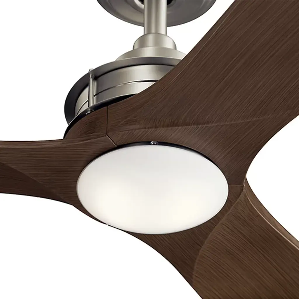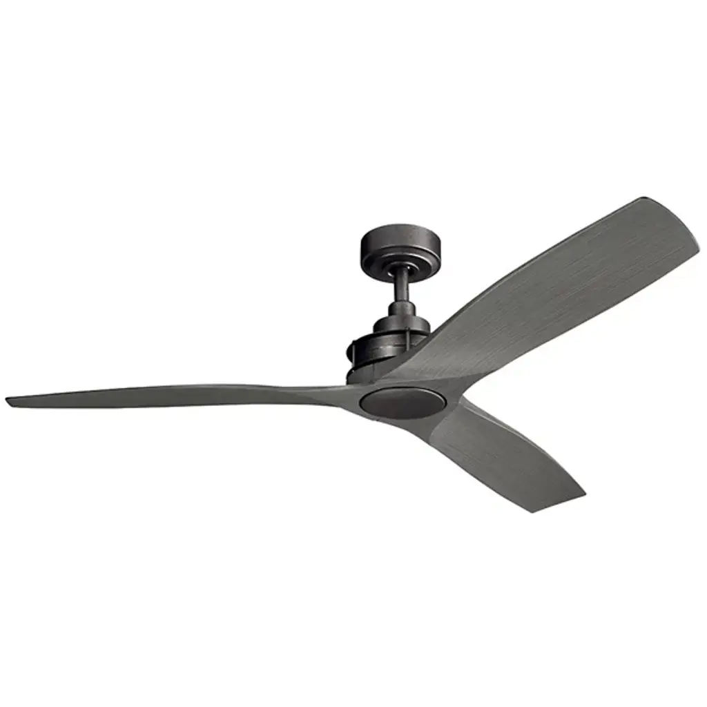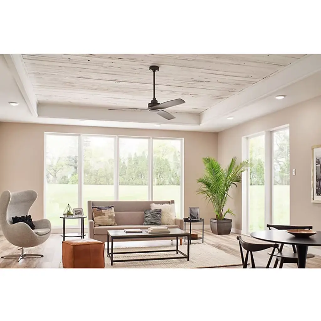 Sporting wooden tones that call to mind a very chic and rustic aesthetic, the Ried 56" Ceiling Fan by Kichler provides sweeping airflow while retaining a minimal form factor. The fan utilizes 3 blades, decked out in a wooden-tone, at a blade pitch of 12 degrees, to reach a humble 56-inch diameter. The blades are powered by an AC motor, allowing the fan to have 3 different set speeds which can be toggled through with the system’s wall control system. The fan is perfectly adequate for use in kitchens, living rooms, and bedrooms.