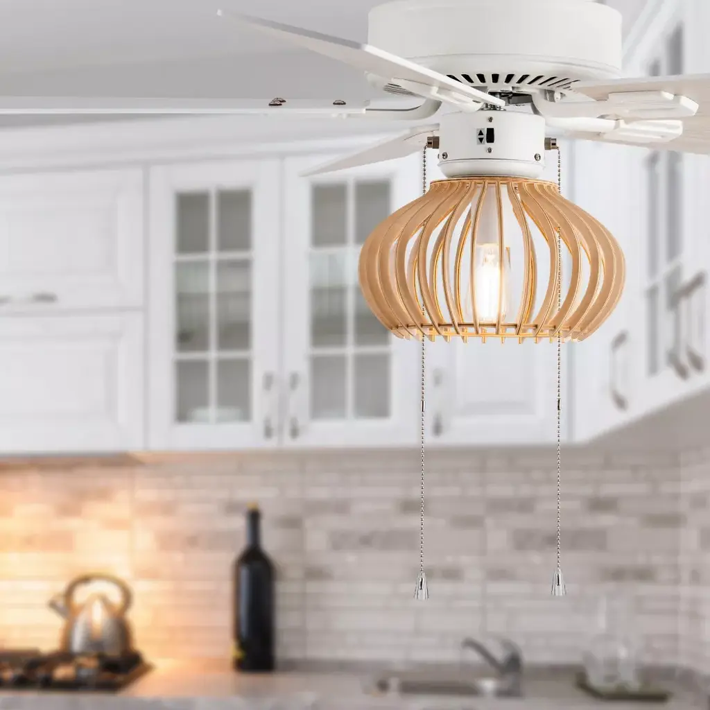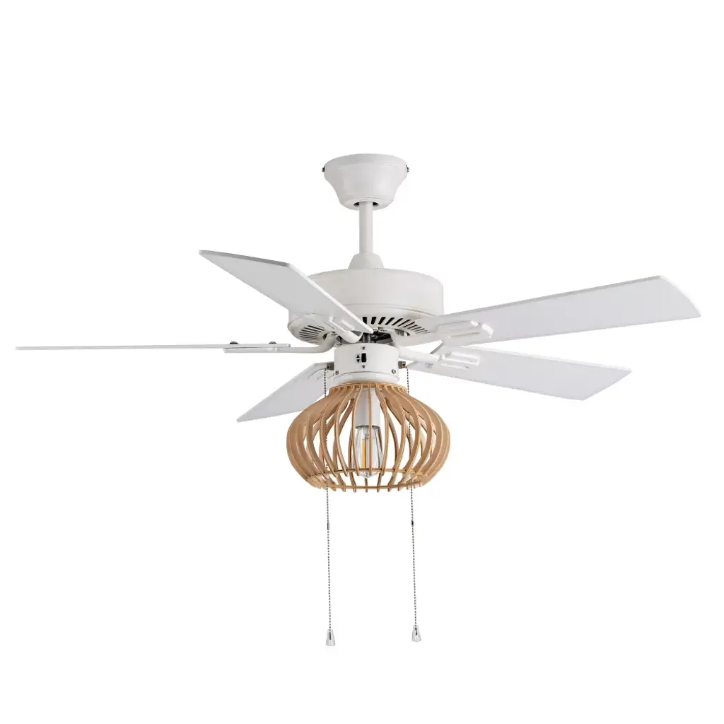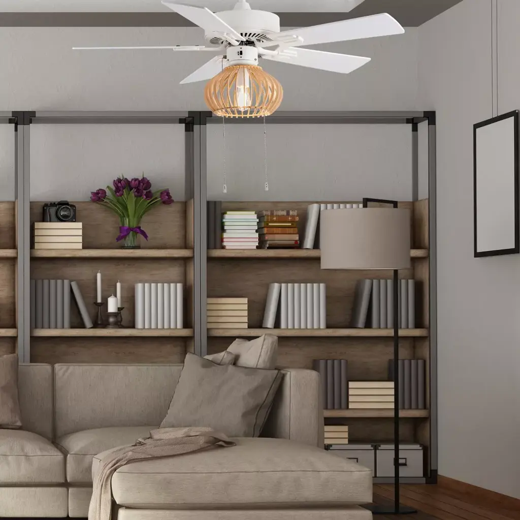 With the Adelaide White & Tan Caged Shade 42-Inch Ceiling Fan With Light from River of Goods, you can upgrade the overhead lighting in a room while also improving airflow. This five-blade ceiling fan boasts a bohemian mid-century modern inspired design, combining a rounded tan cage shade with reversible woodgrain blades that can be installed so either the painted white or light oak finish side faces the room. The fixture uses one 8-watt E26 light bulb (included) to cast down a warm, welcoming lighting effect, while two 12-inch pull chains offer easy operation.