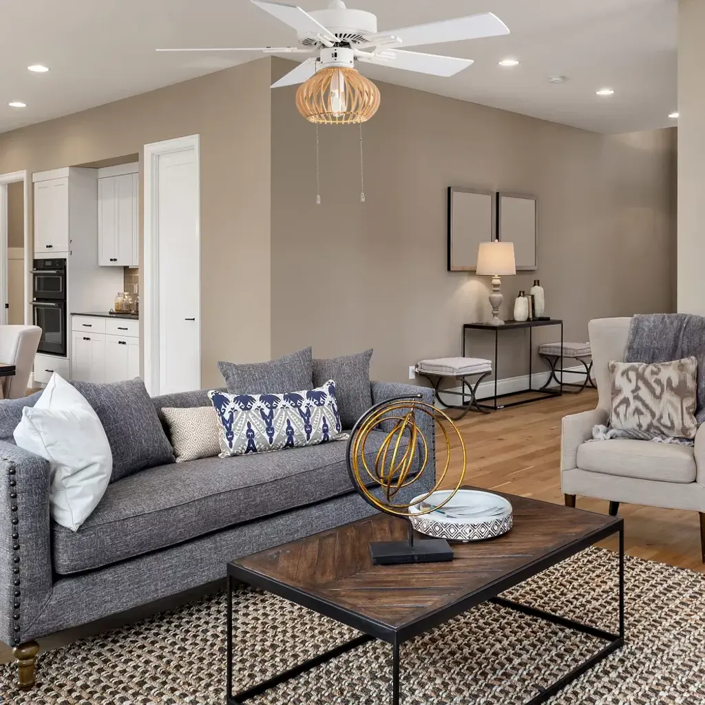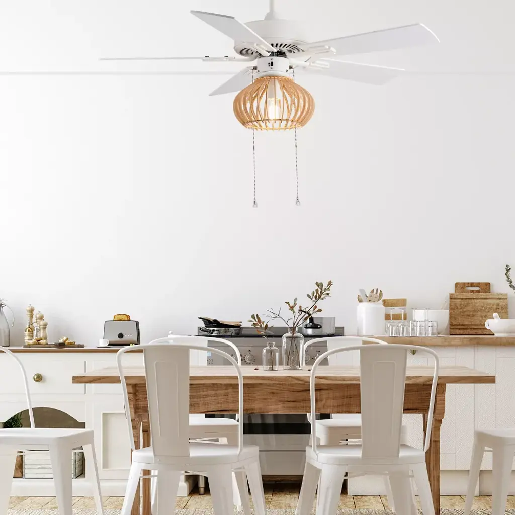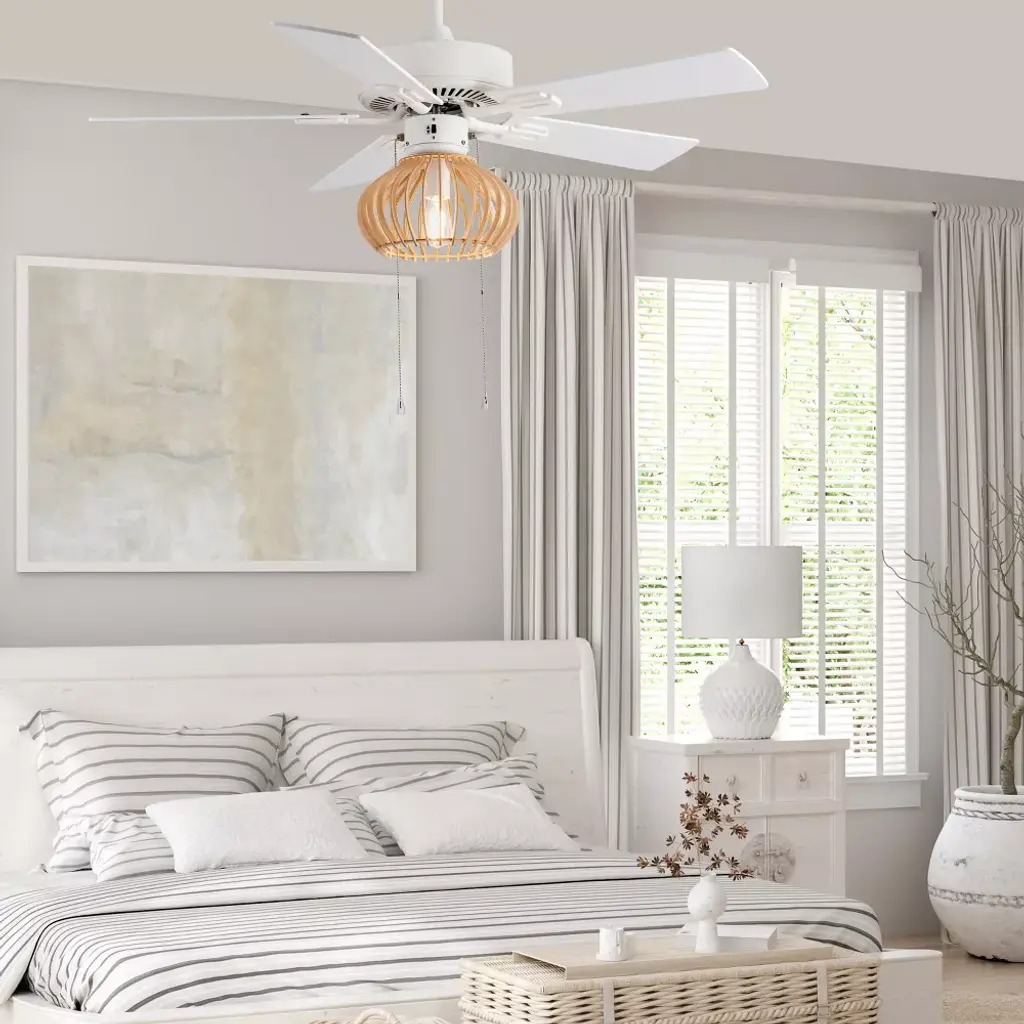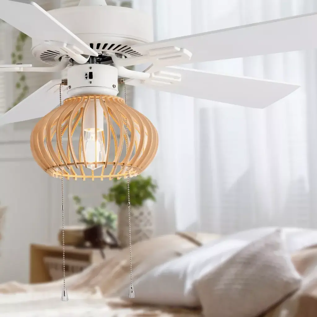 With the Adelaide White & Tan Caged Shade 42-Inch Ceiling Fan With Light from River of Goods, you can upgrade the overhead lighting in a room while also improving airflow. This five-blade ceiling fan boasts a bohemian mid-century modern inspired design, combining a rounded tan cage shade with reversible woodgrain blades that can be installed so either the painted white or light oak finish side faces the room. The fixture uses one 8-watt E26 light bulb (included) to cast down a warm, welcoming lighting effect, while two 12-inch pull chains offer easy operation.