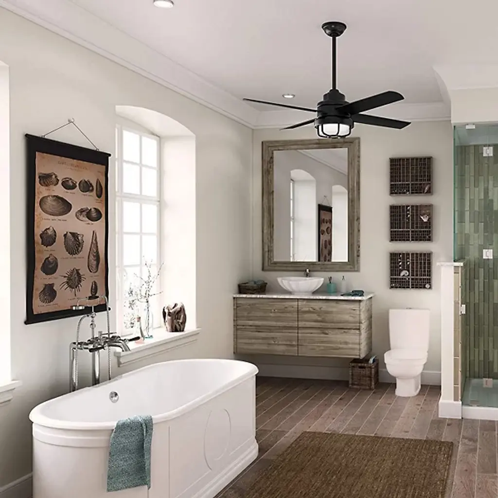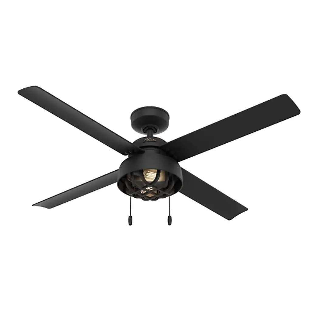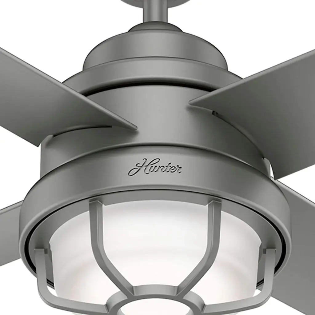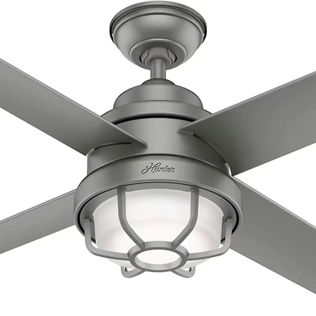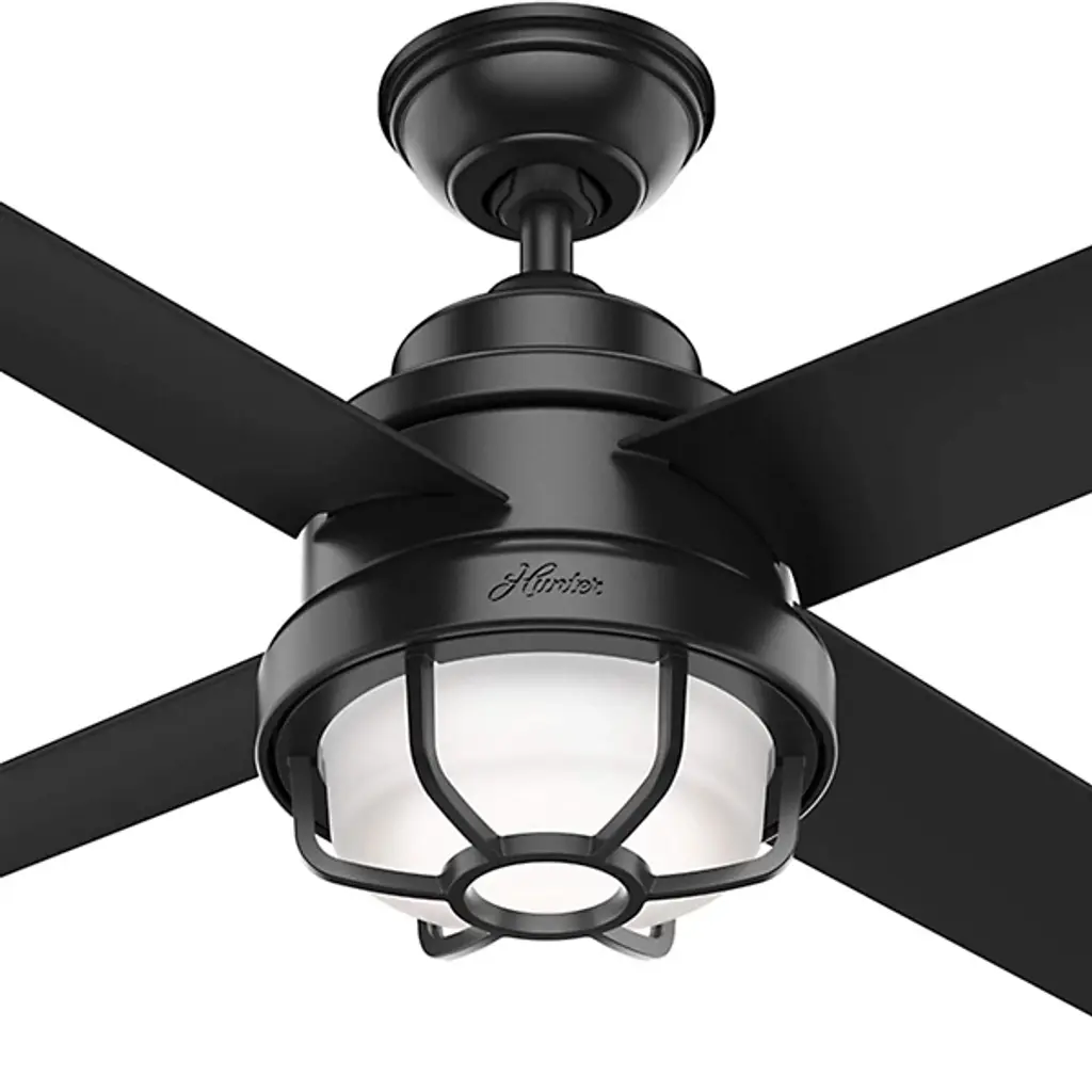 The Searow 54 Inch LED Outdoor Ceiling Fan by Hunter Fans completes and creates comfortable spaces with a lantern inspired look. Engineered for the elements, this fan from the WeatherMax® Collection withstands rusting and corrosion from salt-air and rain, working in a variety of outdoor locations and standing strong through the test of time. An included remote controls the integrated, energy-efficient light kit, adjustable speeds, and reversible options of this four-blade fan as a WhisperWind® motor provides quiet performance power.