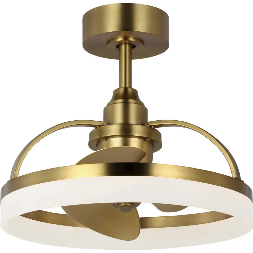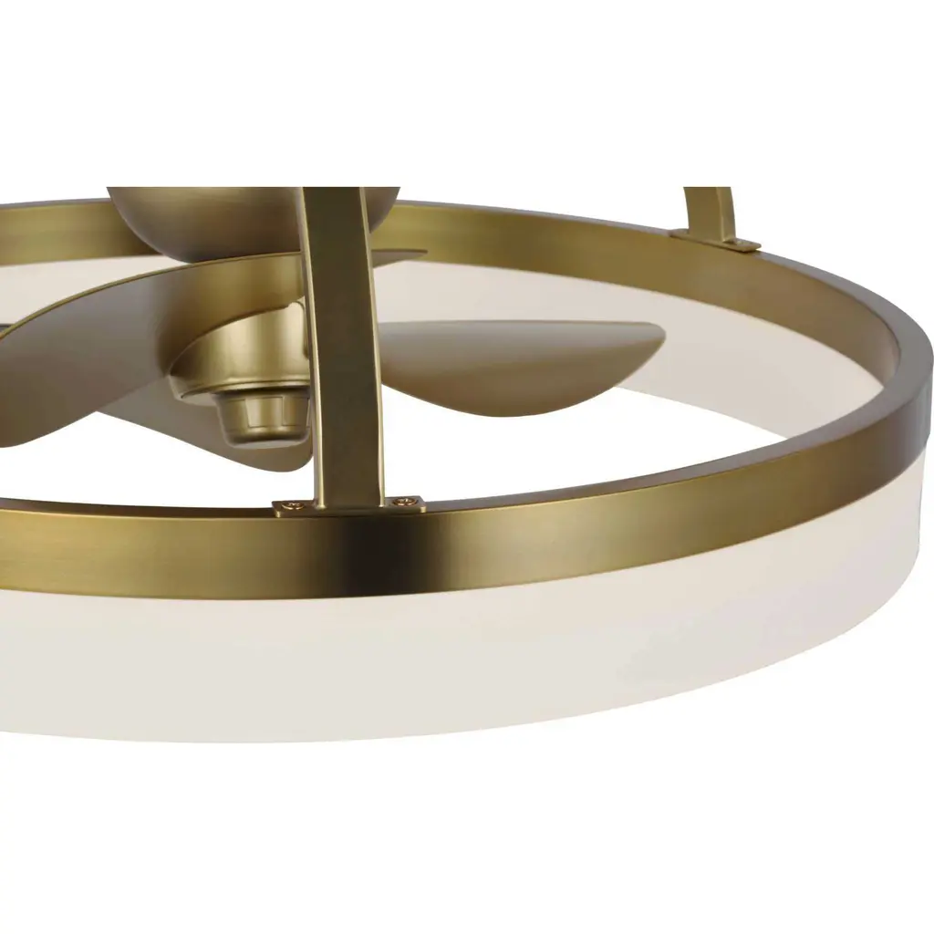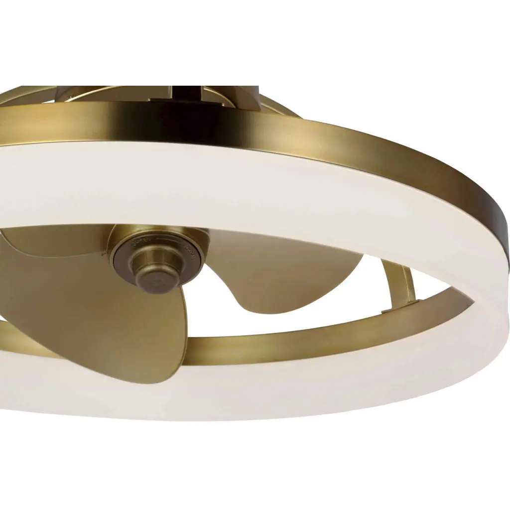 Crafted from swirling bands of brushed bronze and creamy polished acrylic, the 19.56-inch Shear LED fandelier is a masterpiece that elevates both form and function to new heights. A trio of Gold fan blades are powered by a quiet, oscillating DC motor that effortlessly distributes air in a 36-degree rotation throughout indoor and covered outdoor rooms. Innovative, linear dimmable LEDs softly illuminate the surrounding space. A full-function remote control and wall bracket are included. This fan is part of the new Oscillar™ Collection of ceiling fandeliers, featuring rings of integrated LED illumination and a trio of blades powered by a silent oscillating DC motor that features a 360-degree rotation and six speeds, delivering maximum air distribution in every direction throughout a room.