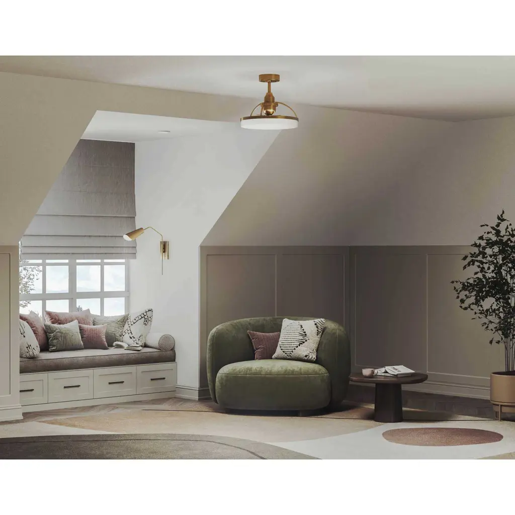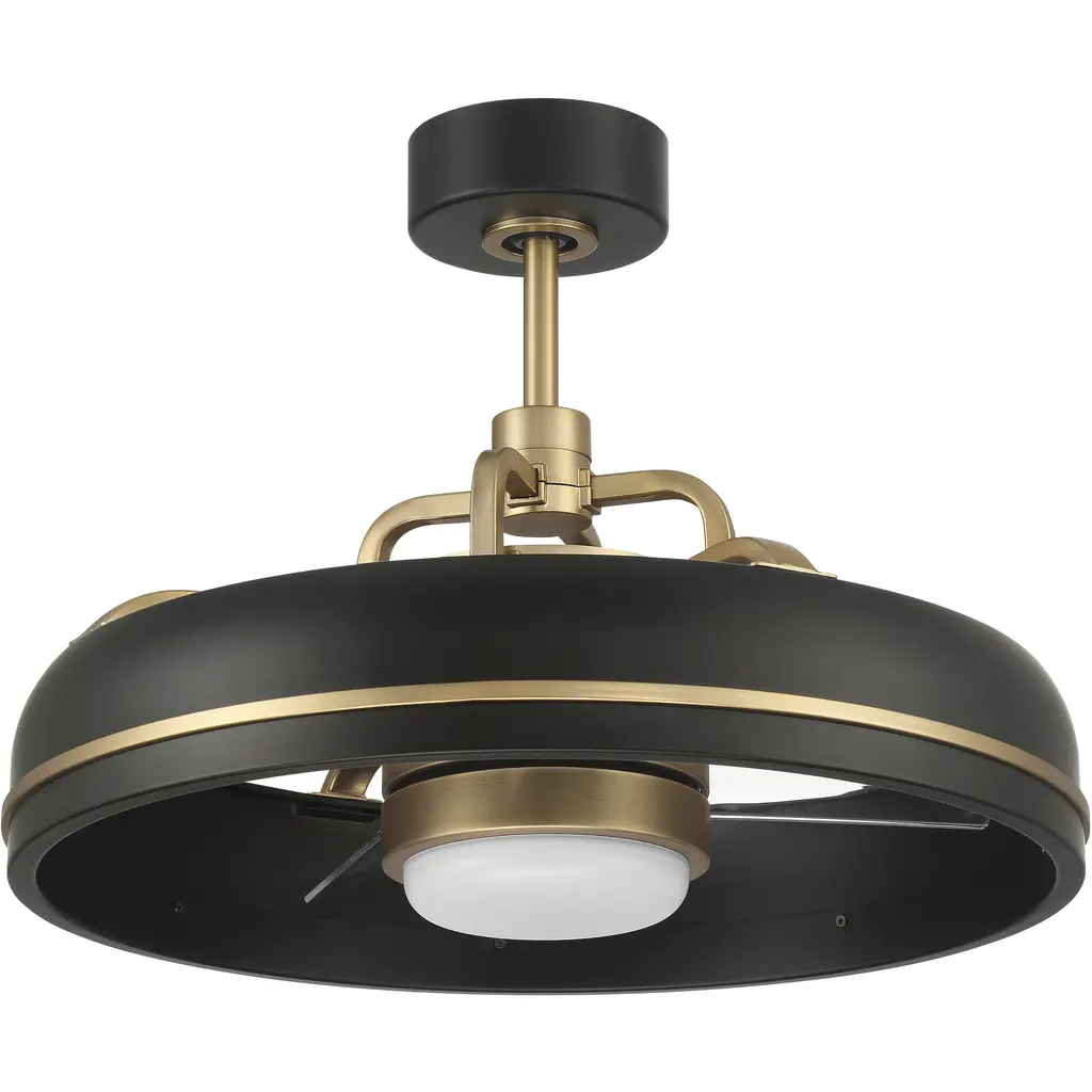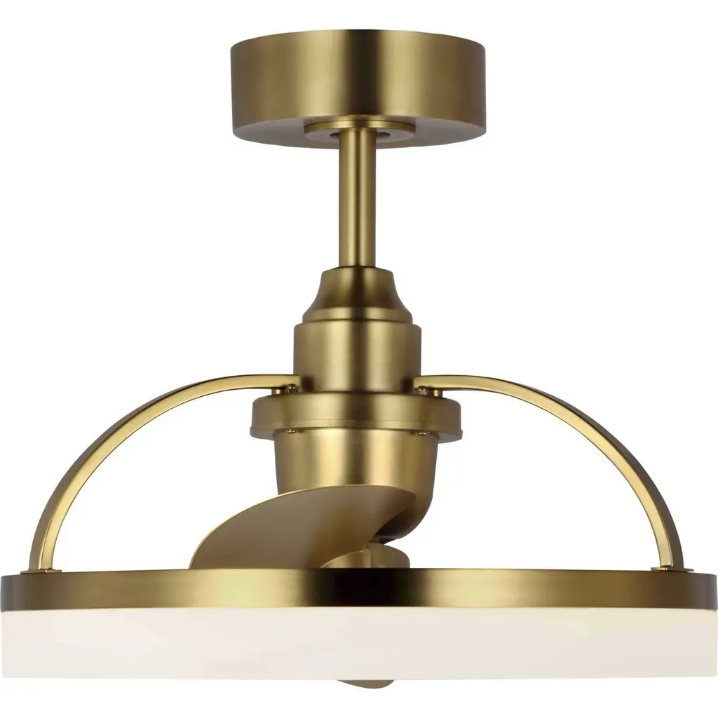 Crafted from swirling bands of brushed bronze and creamy polished acrylic, the 19.56-inch Shear LED fandelier is a masterpiece that elevates both form and function to new heights. A trio of Gold fan blades are powered by a quiet, oscillating DC motor that effortlessly distributes air in a 36-degree rotation throughout indoor and covered outdoor rooms. Innovative, linear dimmable LEDs softly illuminate the surrounding space. A full-function remote control and wall bracket are included. This fan is part of the new Oscillar™ Collection of ceiling fandeliers, featuring rings of integrated LED illumination and a trio of blades powered by a silent oscillating DC motor that features a 360-degree rotation and six speeds, delivering maximum air distribution in every direction throughout a room.