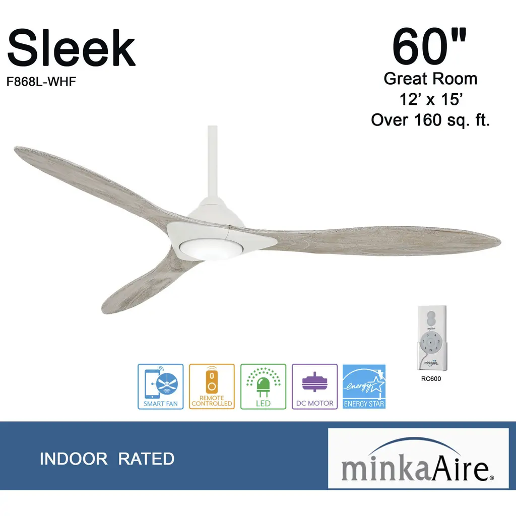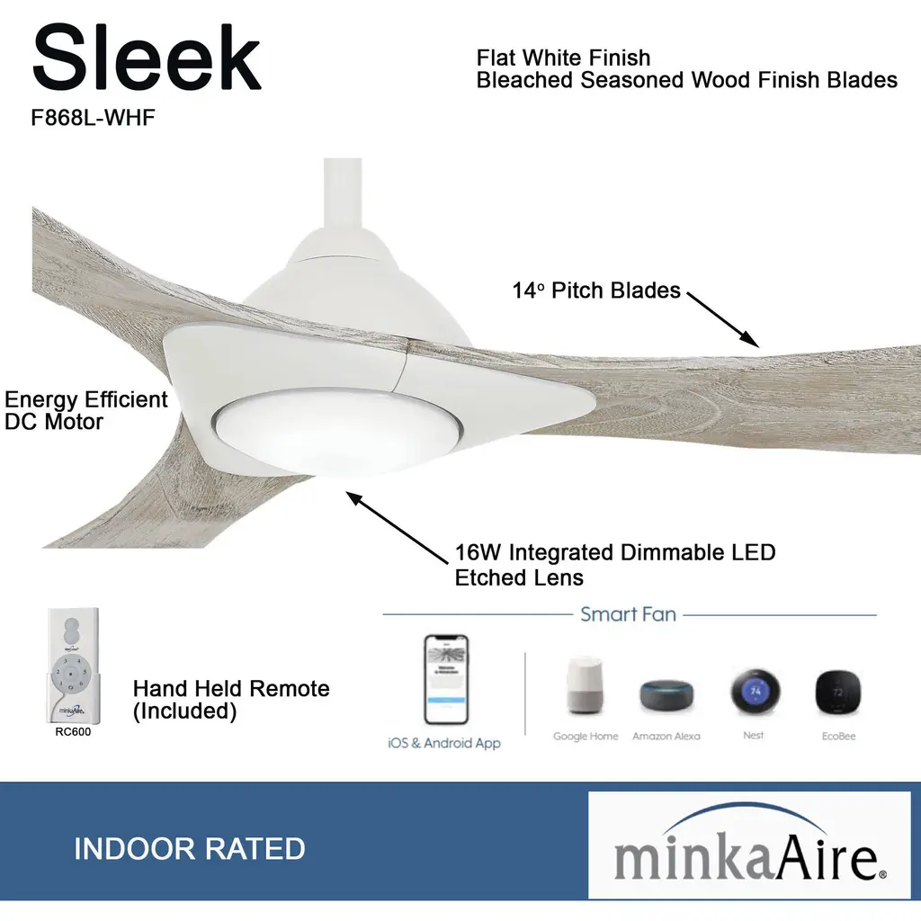 Sleek 60 Inch Flat White With Bleached Seasoned Wood Blades Ceiling Fan