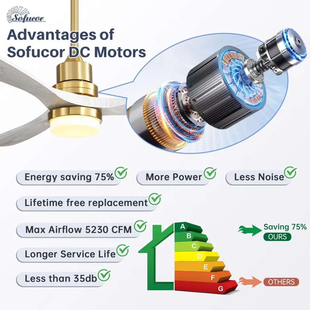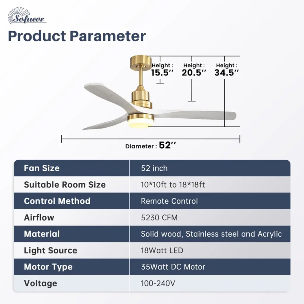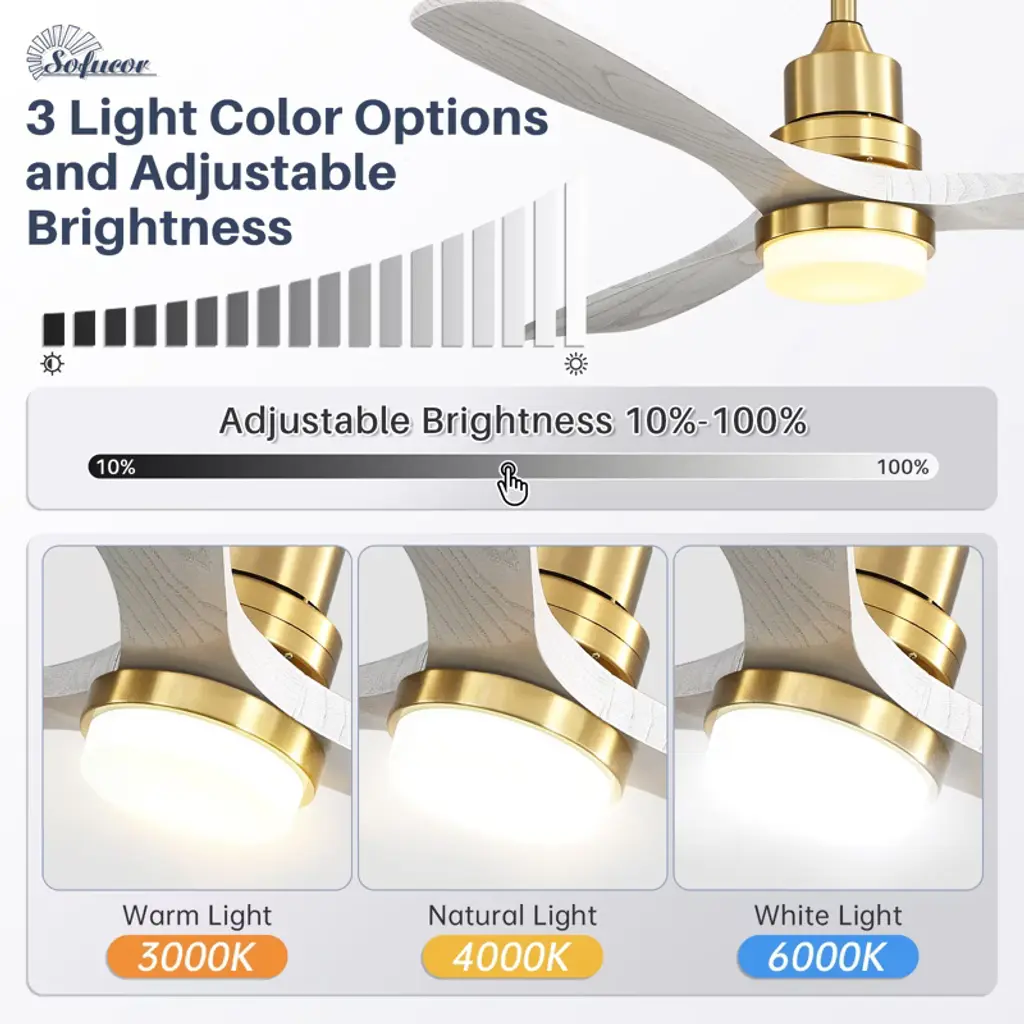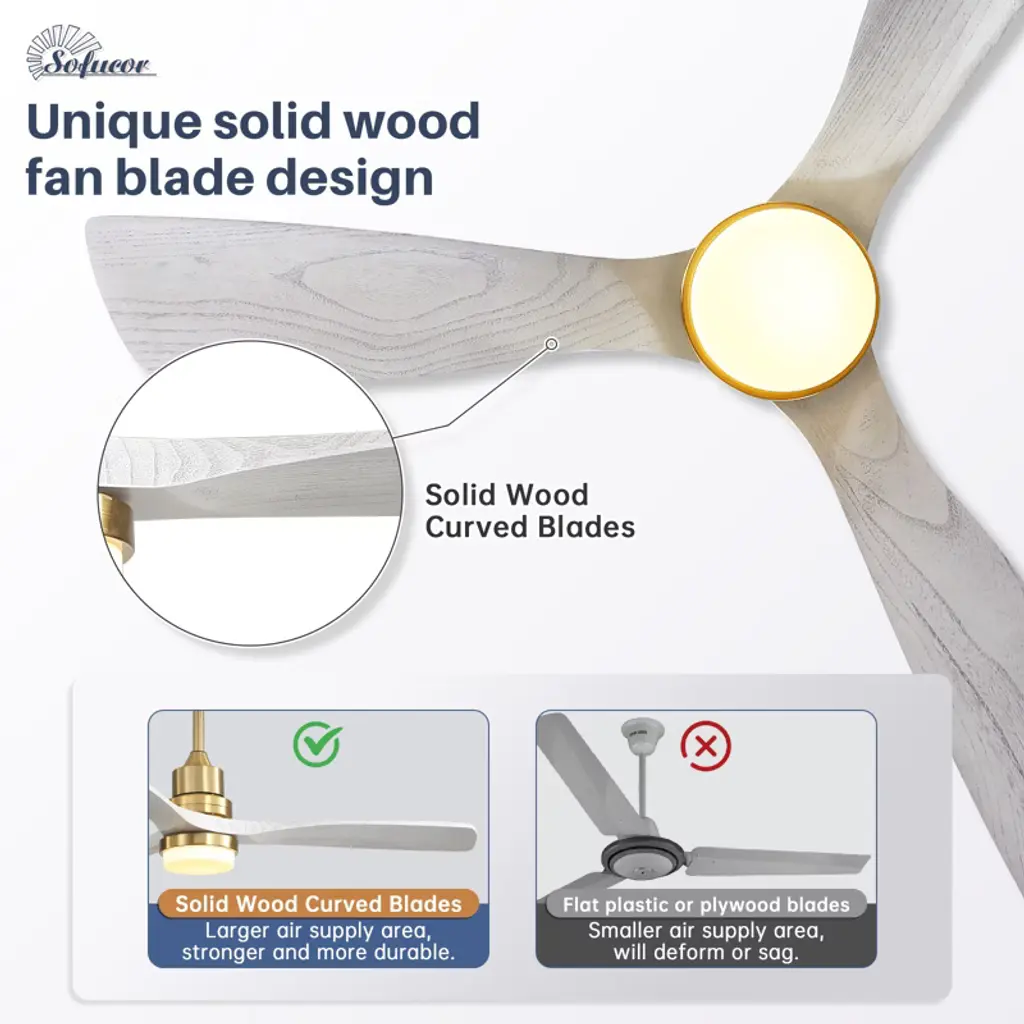 Sofucor 52 Inch Solid Wood Ceiling Fans With Lights And Remote Dimmable 6-speed Outdoor Indoor Bedroom Ceiling Fan Timer Reversible Dc Motor Gold