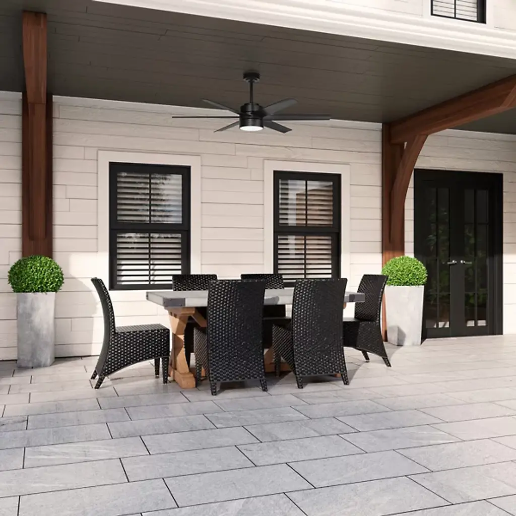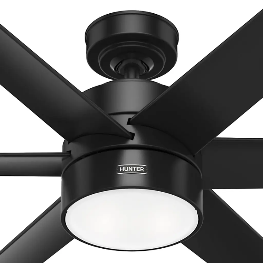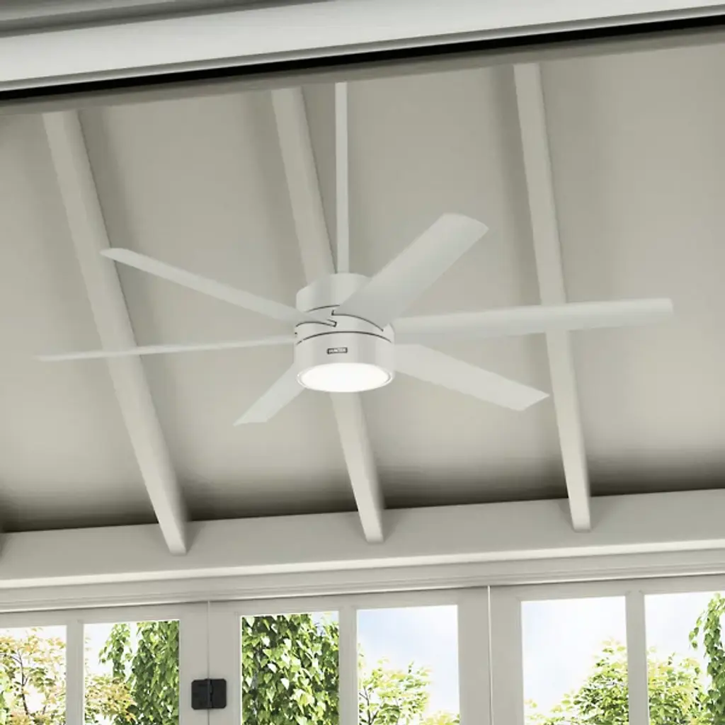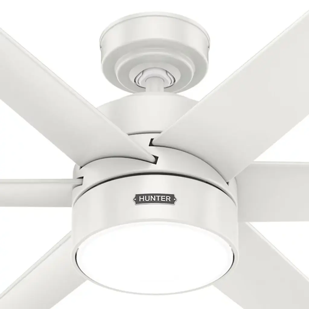 The Solaria Outdoor LED Ceiling Fan from Hunter Fans combines modern design with high-efficiency performance, perfect for large indoor spaces and covered patios. Featuring six durable, droop-resistant blades with extensive reach, it delivers quiet, steady airflow controlled by a WhisperWind® DC motor. At the same time, a central LED light beneath a glass disc diffuser provides warm ambiance. Energy Star-certified and damp-rated, Solaria is 64% more efficient on average than conventional fans. It includes a remote for easy control and is backed by an exclusive SureSpeed® Guarantee for powerful, energy-conscious cooling.