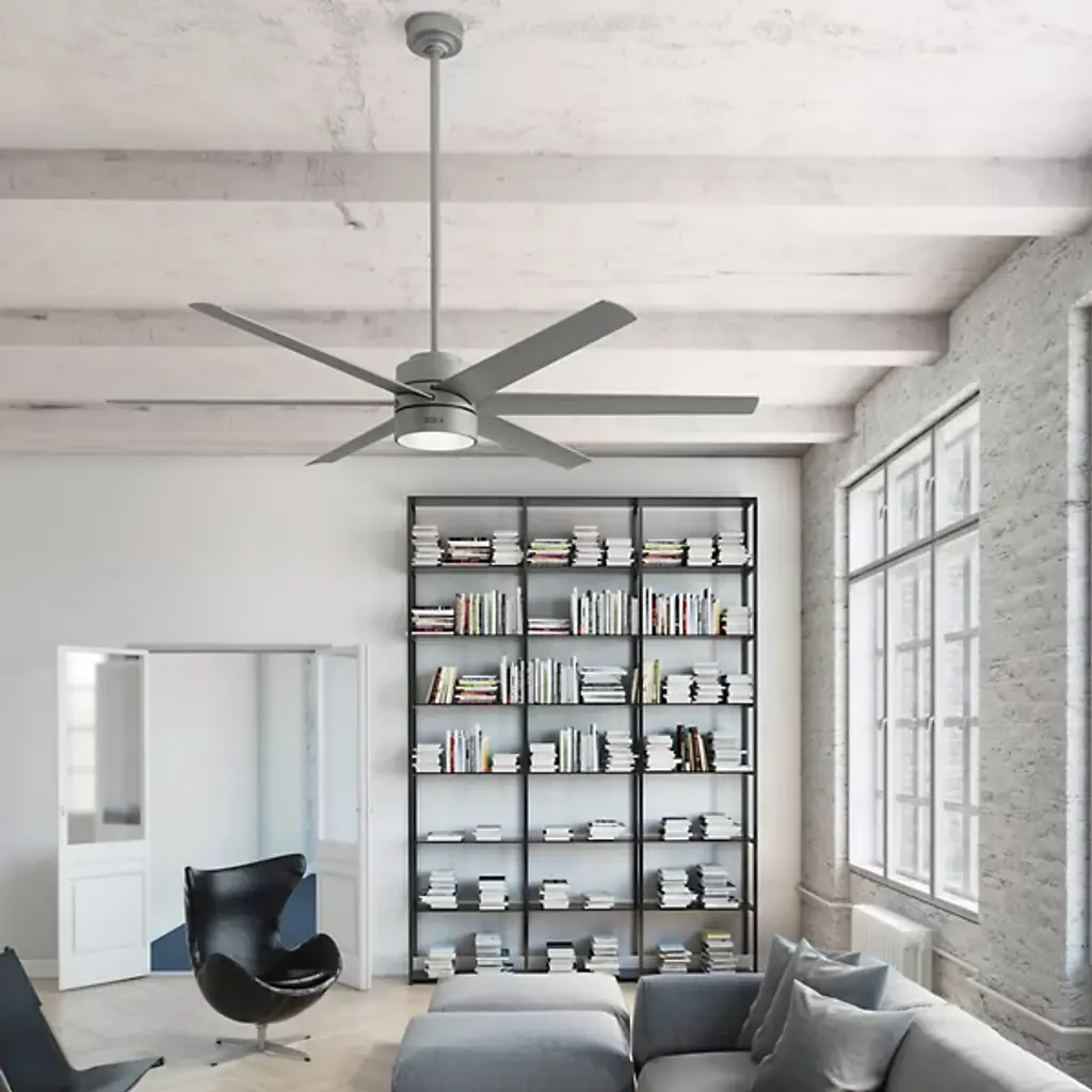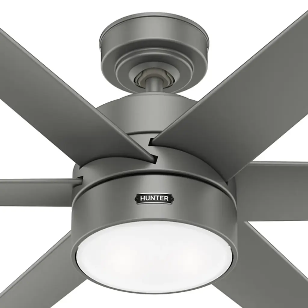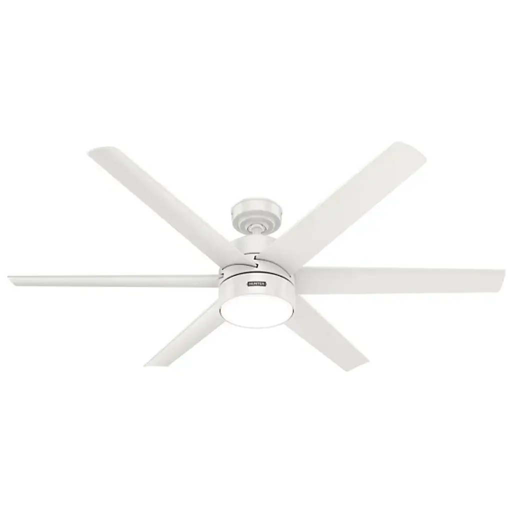 The Solaria Outdoor LED Ceiling Fan from Hunter Fans combines modern design with high-efficiency performance, perfect for large indoor spaces and covered patios. Featuring six durable, droop-resistant blades with extensive reach, it delivers quiet, steady airflow controlled by a WhisperWind® DC motor. At the same time, a central LED light beneath a glass disc diffuser provides warm ambiance. Energy Star-certified and damp-rated, Solaria is 64% more efficient on average than conventional fans. It includes a remote for easy control and is backed by an exclusive SureSpeed® Guarantee for powerful, energy-conscious cooling.