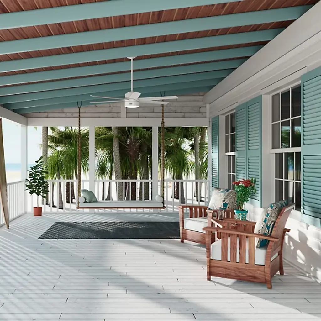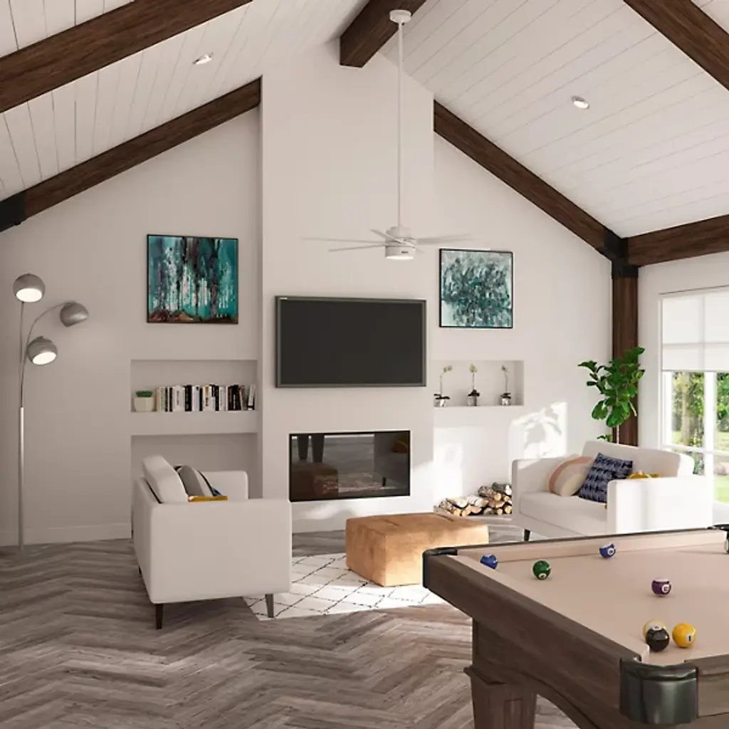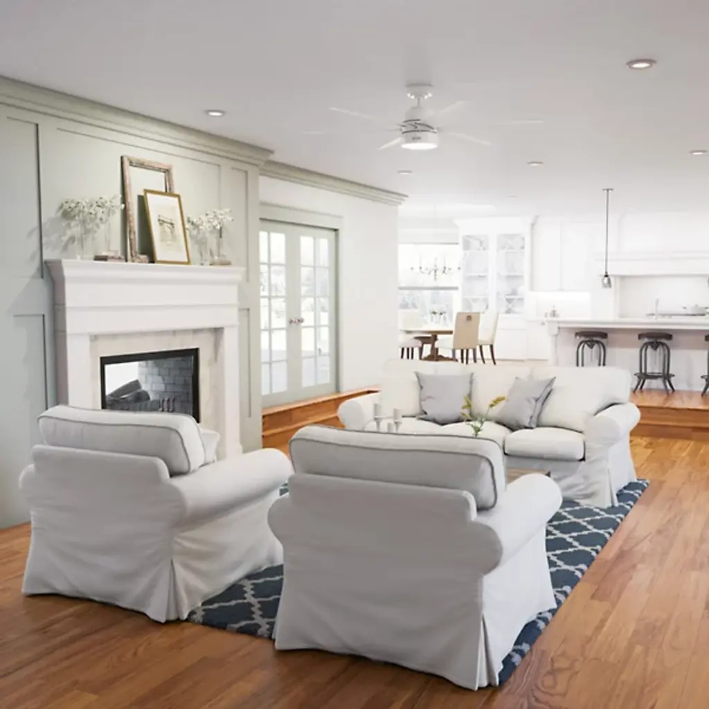 The Solaria Outdoor LED Ceiling Fan from Hunter Fans combines modern design with high-efficiency performance, perfect for large indoor spaces and covered patios. Featuring six durable, droop-resistant blades with extensive reach, it delivers quiet, steady airflow controlled by a WhisperWind® DC motor. At the same time, a central LED light beneath a glass disc diffuser provides warm ambiance. Energy Star-certified and damp-rated, Solaria is 64% more efficient on average than conventional fans. It includes a remote for easy control and is backed by an exclusive SureSpeed® Guarantee for powerful, energy-conscious cooling.