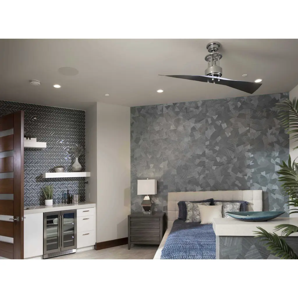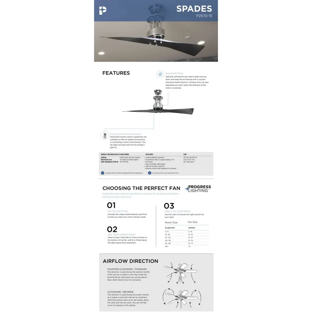 The 56 inch Spades ceiling fan features a sleek contemporary two-blade design that is finished in Polished Chrome with graphite blades. Spades features a dual mount system, an energy saving DC motor and ABS composite blades. A full function remote control with batteries is included.