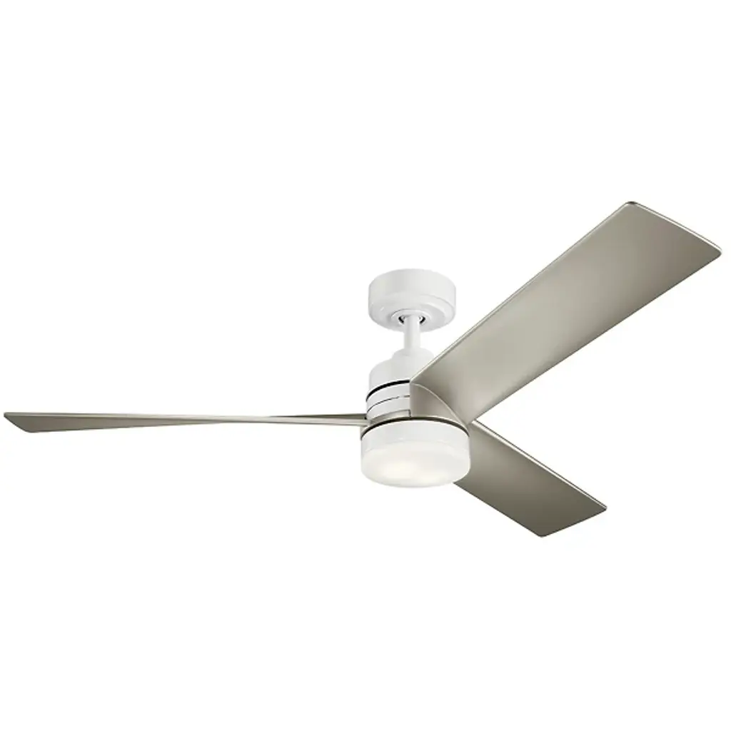 The Spyn 52" LED Ceiling Fan by Kichler provides easy, cooling airflow to contemporary living spaces. The fixture utilizes 3 blades built at a distinct twisting shape and a 13-degree pitch to enhance both its airflow and visual appeal. Integrated and energy-efficient LEDs supply a warm, ambient aura of lighting with the help of a cased etched opal glass shade, which can be controlled via a 3-speed wall control (available separately).