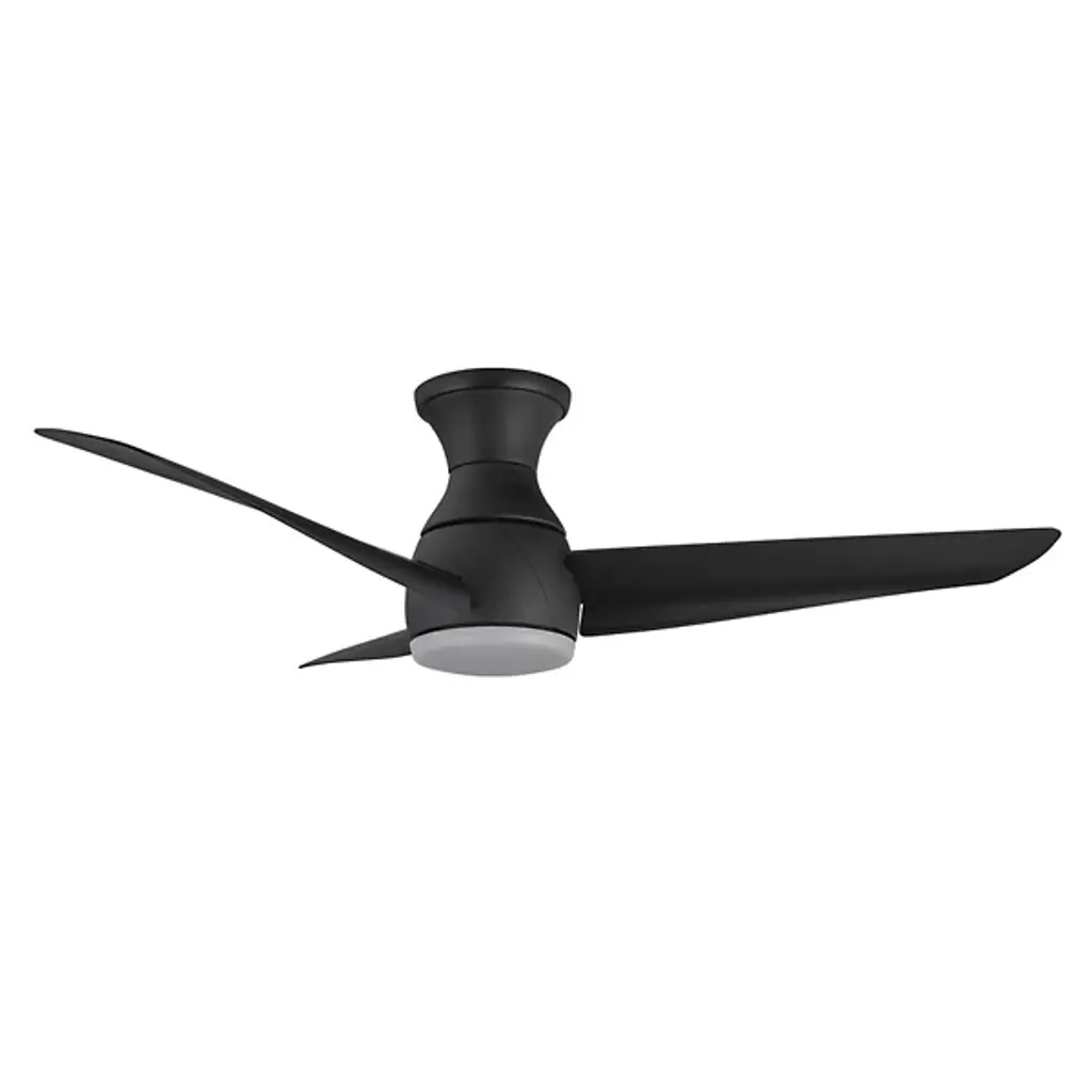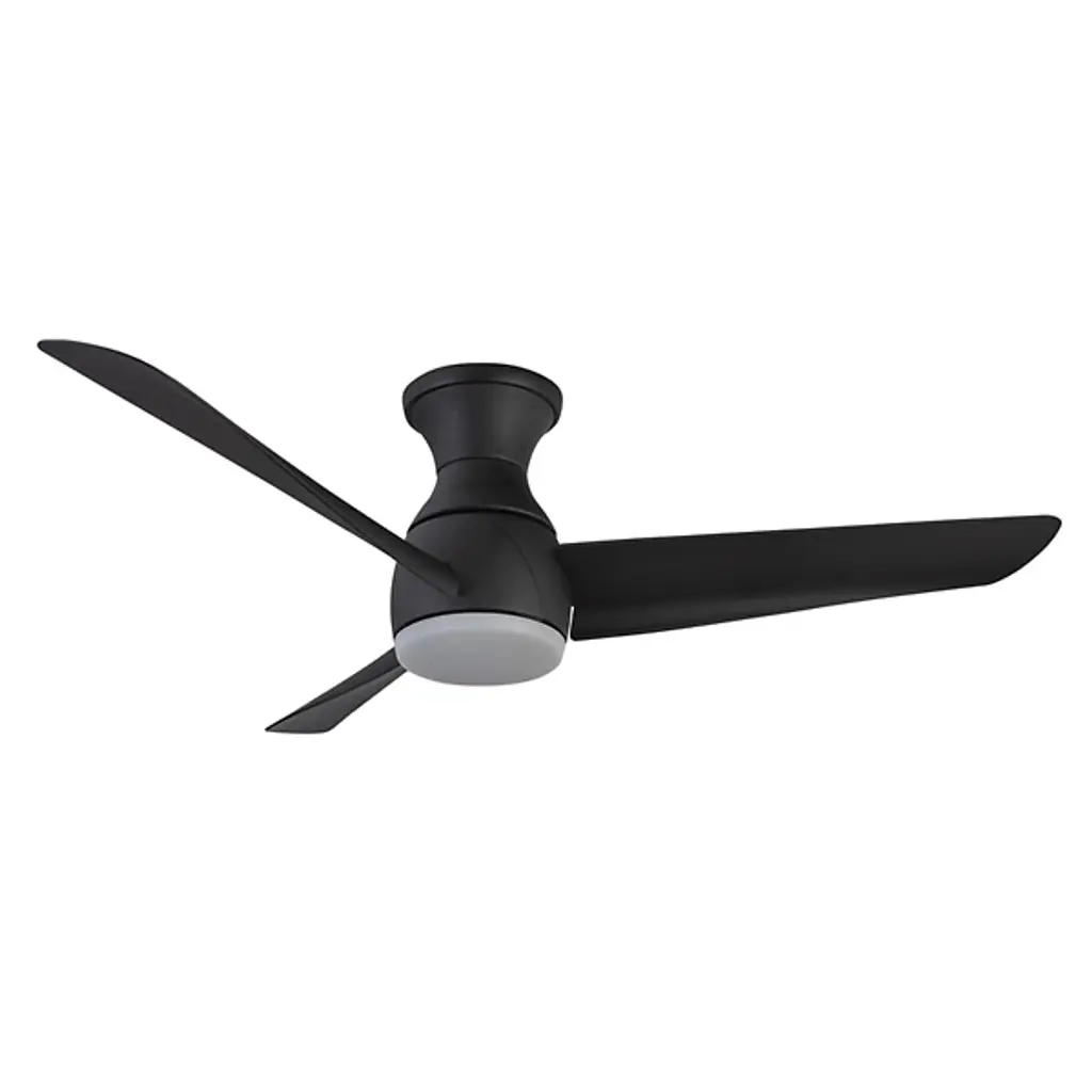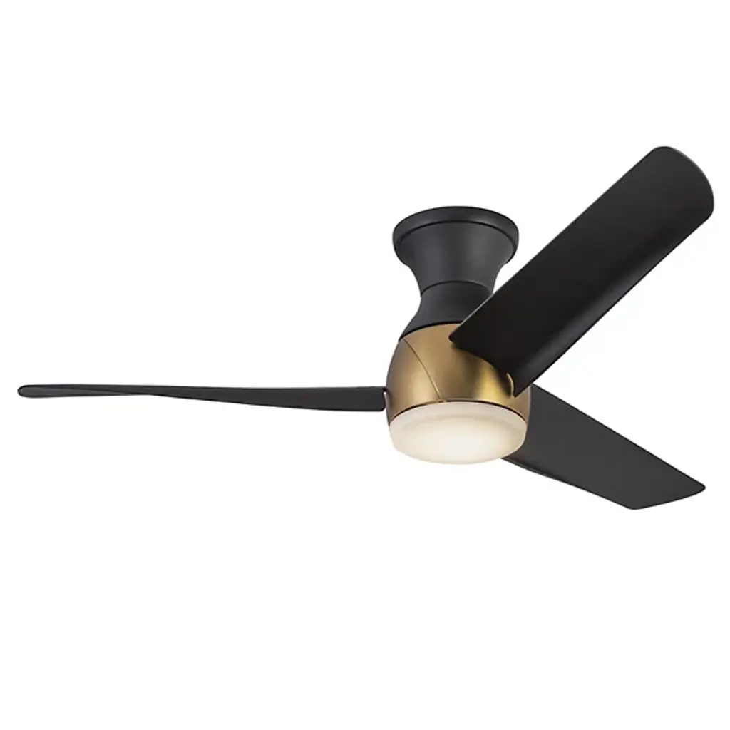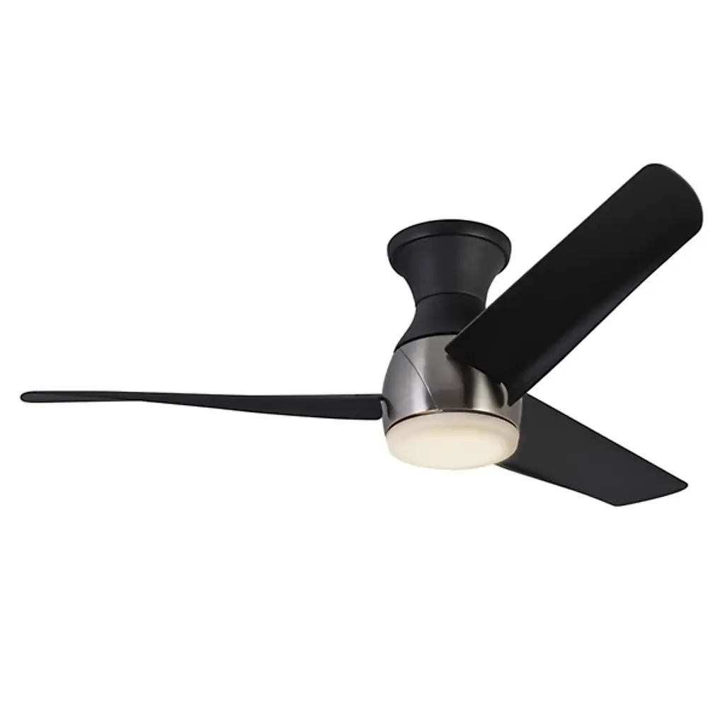 Give light and breeze to compact ceiling spaces with the Thalia LED Smart Hugger Ceiling Fan from Kuzco Lighting. Intersecting the employment of modern sophistication and thoughtful design, the metallic frame, housing, and durable, matte blades contribute to its cutting-edge aesthetic. This adaptable fan features a ceiling-hugging mount, flaring slightly from its mounting surface while holding a central light housing at its center. A steel construction and ABS blades support a frosted polymeric lens shade, encompassing damp-listed lighting that can be customized on command, able to dim the lamp to 10% light emission. Its strong functionality coordinates well with distinctive style elements, and it can be commanded by the Smart by Bond app, or the included handheld remote, controlling the smart fan technology and whirling the fan through six adjustable speeds and a convenient reverse function.