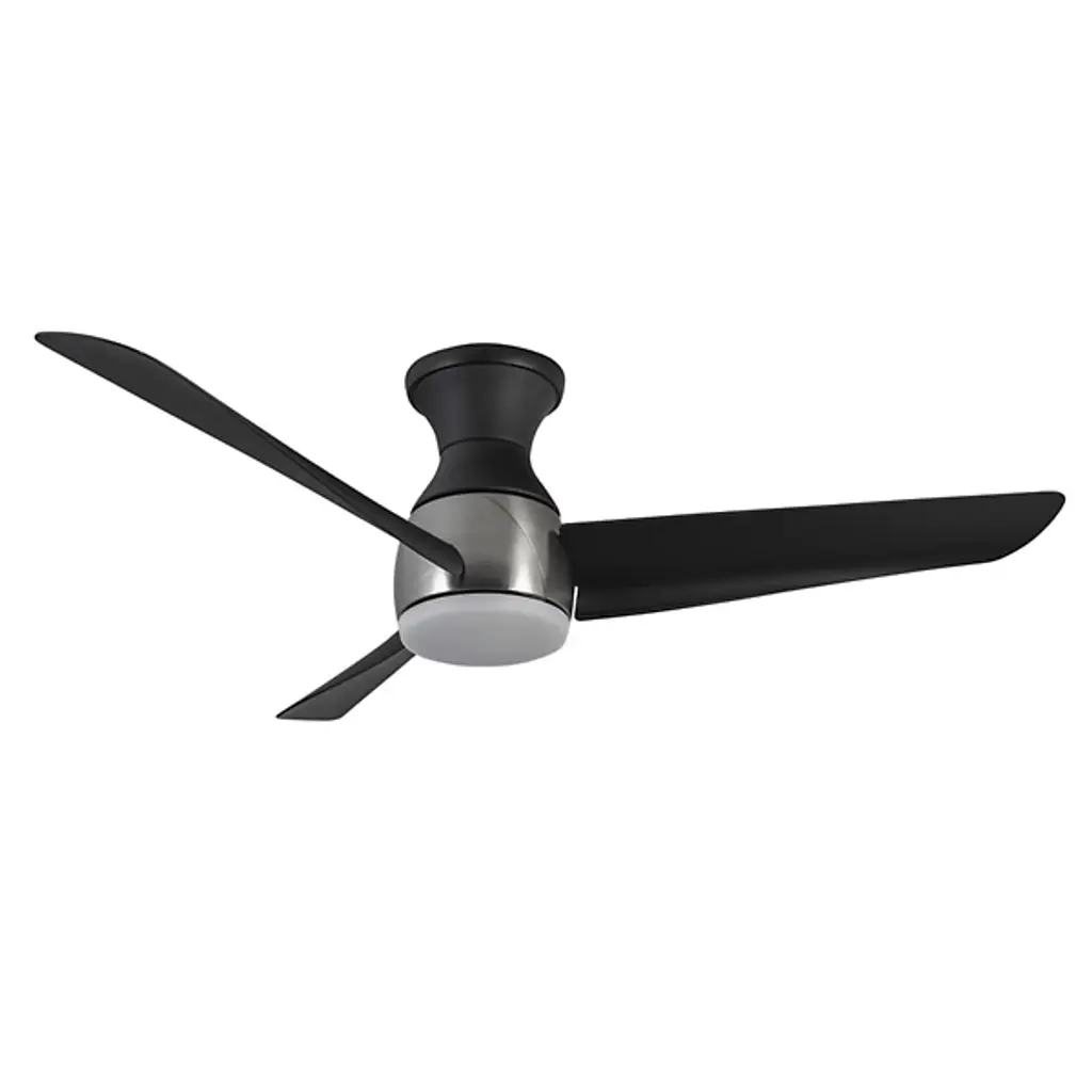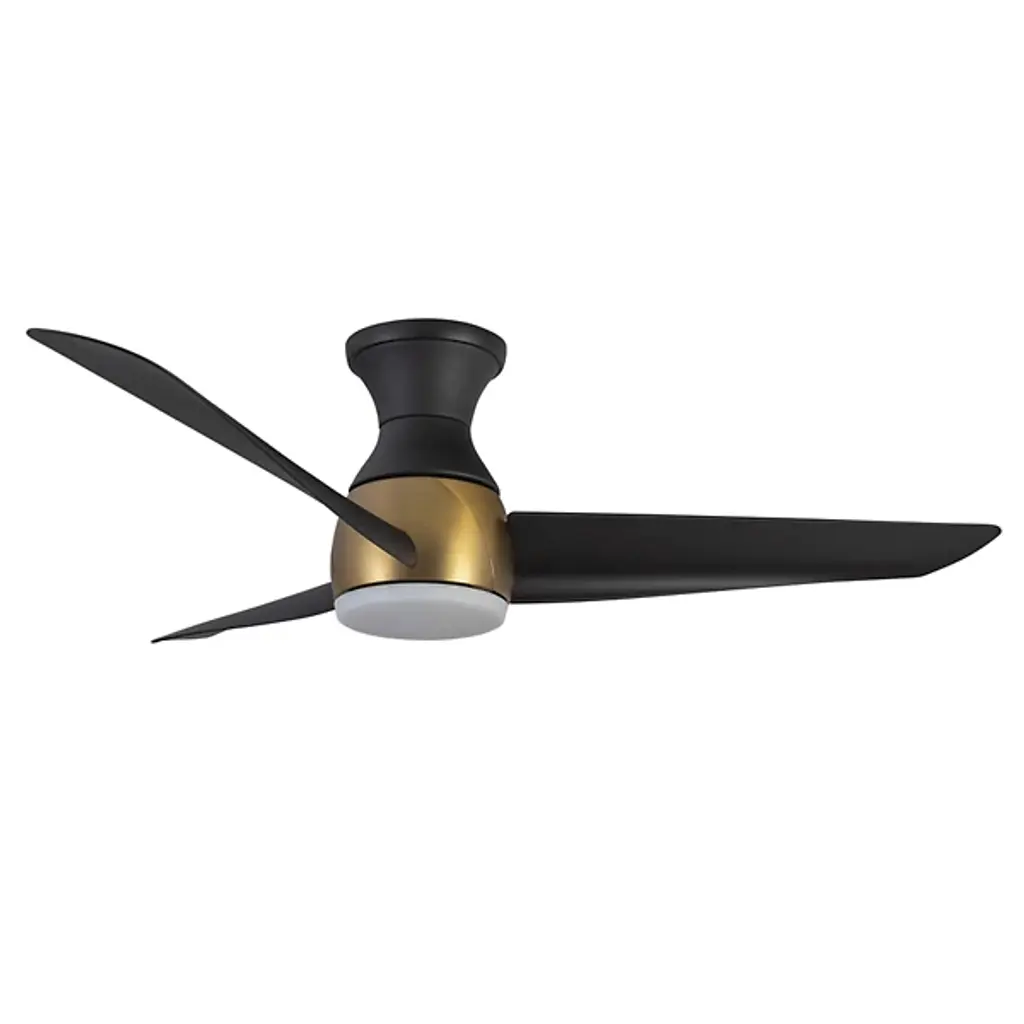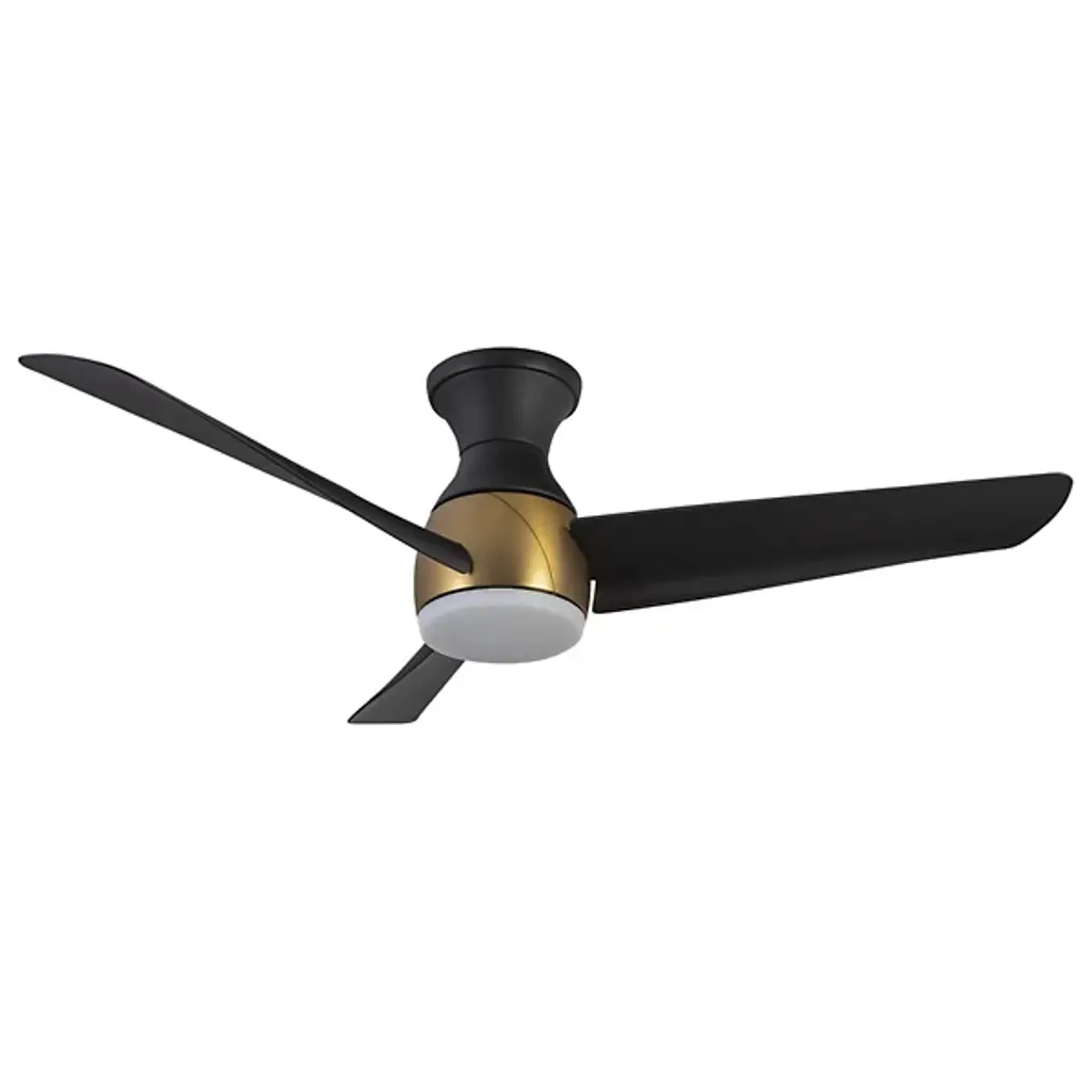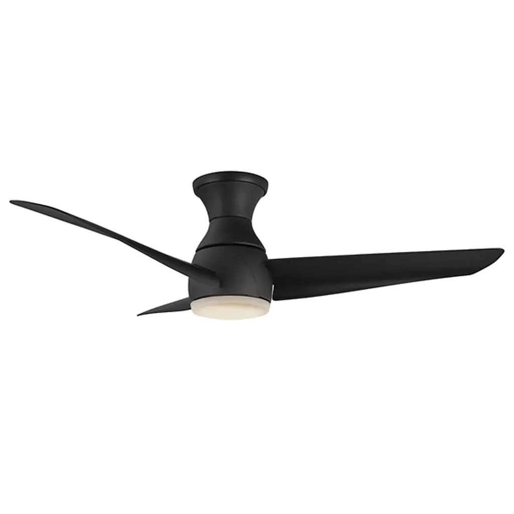 Give light and breeze to compact ceiling spaces with the Thalia LED Smart Hugger Ceiling Fan from Kuzco Lighting. Intersecting the employment of modern sophistication and thoughtful design, the metallic frame, housing, and durable, matte blades contribute to its cutting-edge aesthetic. This adaptable fan features a ceiling-hugging mount, flaring slightly from its mounting surface while holding a central light housing at its center. A steel construction and ABS blades support a frosted polymeric lens shade, encompassing damp-listed lighting that can be customized on command, able to dim the lamp to 10% light emission. Its strong functionality coordinates well with distinctive style elements, and it can be commanded by the Smart by Bond app, or the included handheld remote, controlling the smart fan technology and whirling the fan through six adjustable speeds and a convenient reverse function.