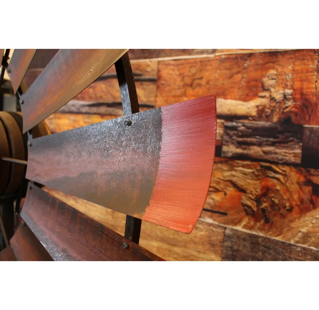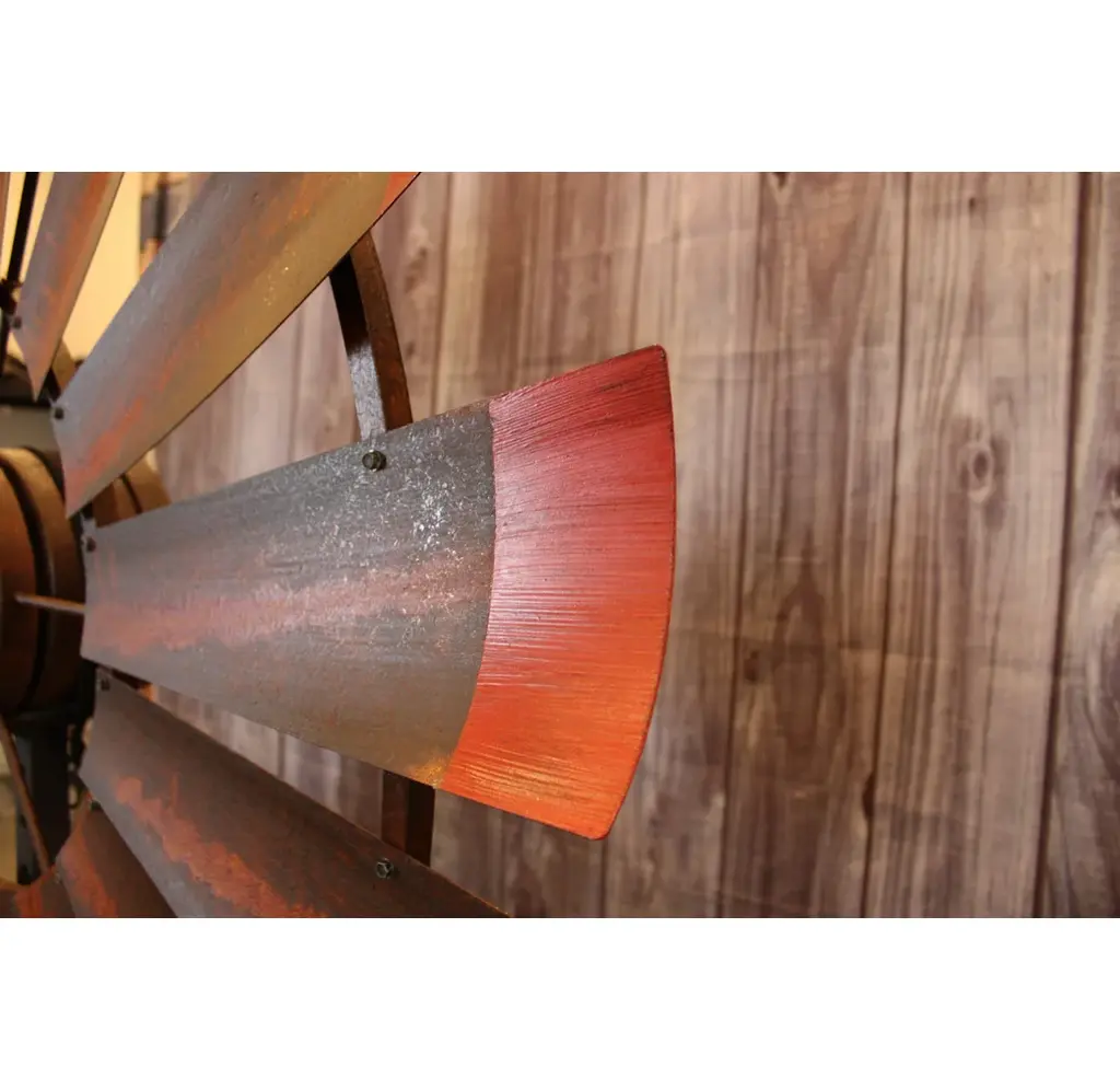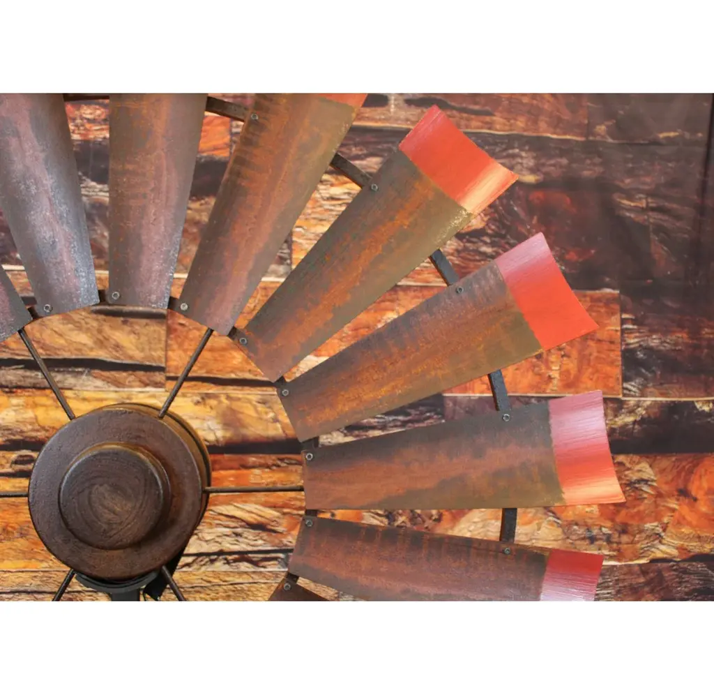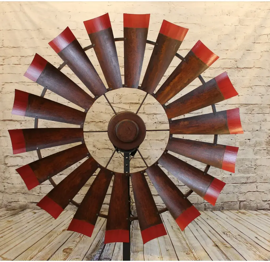 Cowboy Channel Windmill Ceiling Fan | The Patriot- The Cowboy Channel is the perfect blend of rust. Crafted from quality materials, this fan is built to last, while its nontraditional styling will stand out in any setting! Forged from the strength of Cowboys, this finish begins with the look and feel of a rusty, old windmill. The Rustic Red tips add a flare of nostalgia; you can practically feel the texture of a classic old red barn. The rich, rusted blades with red tips bring the soul of the farming lifestyle indoors with this exquisite fan design. How could you go wrong with this vivacious rusted and rustic red fan finish?Our windmill fans are hand-crafted, American-made, and truly one of a kind. We are a Texas family-owned and operated business. Each fan is constructed of durable steel and lightweight aluminum, allowing for stress-free Installation and perfect for interior or exterior placements. Our windmill ceiling fans work well in many settings.Easy Installation - standard ceiling supports and electricalEach fan is unique and one of a kindHand-crafted and American madeEighteen Blades for optimal balance (14 blades on the 46")Available in 46", 52", 60", 66", 72" diameter sizingEfficient motor integration designNone or minimal assembly requiredConstructed only of quality steel and aluminum. Absolutely no molded plastic and particle board!3-speed, reversible, quiet, gearless AC motorCFM rating from 3000-4500Free consultation and adviceAccessory Kit includes everything needed for InstallationFamily-owned and operatedFan weight is approximately 40 to 50lbs depending on the size and finishOutdoor damp ratedIt can be used on a flat or sloped ceilingWe are the only Windmill Ceiling Fan Company that provides unique aluminum lightweight, 18-blade design and custom finishes.Note: Our fans are not mass-produced. Each of our windmill ceiling fans are hand-crafted, they might have slight variances, and the rings may not be perfectly round or flat, very similar to an actual windmill in a pasture.Every fan is built, assembled, tested, and balanced with your blades and down rod. We remove the blades for shipping (smaller fan blades can remain attached upon request). We number each blade and number the frame so you will get the same balanced effect when reattached. Our fans are shipped all over the US and internationally in custom packaging (70" x70" x20").