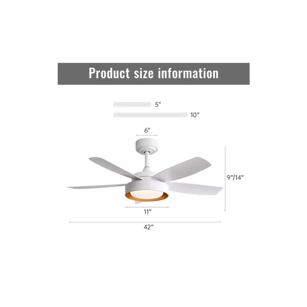 42 Inch Ceiling Fan with Light Color: White Blades/ White Body Blade Material: ABS Blades Size: 42" Light Source: 3CCT LED 22W Special Feature: Timer Certification: ETL Downrod: 50"/10" Room Type: Farmhouse, Restaurant, Rustic, Garage, Living Room, Bedroom, Home Office, Kids Room, Balcony, Cabinet, Garage, Garden, Home, Shop, Dining Room High Quality Ceiling Fan.With its durable and modern design, this 42-inch ceiling fan is perfect for small to medium-sized rooms from 80-160 sq.ft. Reversible Ceiling Fan Quiet Energy saving, Function Includes Forward and Reverse for Summer and Winter 2 Airflow Modes, Cooling In Summer and Keeping Warm in Winter. Modern 42 Inch Ceiling Fan This modern ceiling fan with light, each piece is carefully designed and crafted with great quality ABS blades. It gives the indoor/ outdoor decor a touch of luxury and refinement.