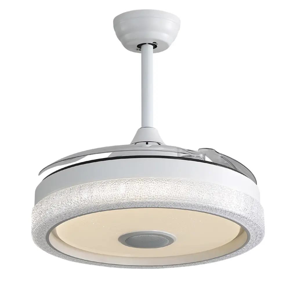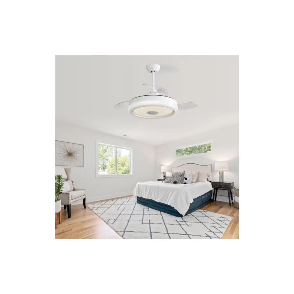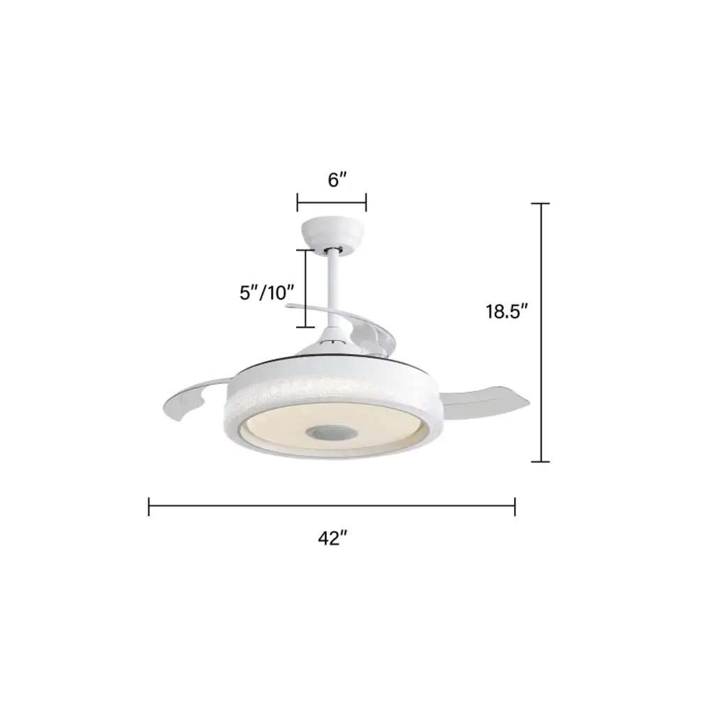 Modern Indoor 42 Inch Retractable Ceiling Fan Elevate your living space with this 42-inch RGB ceiling fan. Experience unparalleled comfort and convenience as you effortlessly control fan settings, lighting, and music with a simple touch. Dimmable Led Ceiling Fan With Light Our ceiling fan has many lighting options, you can change the color temperature from warm(3000K) to white(6000K), customize your brightness from 10%-100%. The upgraded 36W LED lighting is more energy-saving, gentle, and non-dazzling to make your eyes more comfortable. APP Control Ceiling Fan Modern ceiling fan supports RGB color changing and music speaker, not only suitable for daily lighting but also perfect for parties or festivals. There are solid colors and single RGB color, and also has multiple flash mode that can be selected. 42 Inch Invisible Ceiling Fan See the product details page for dimensional drawings. perfect for room sizes up to 25 m2, Restaurant, bedroom, living room, office, loft, balcony, modern living.