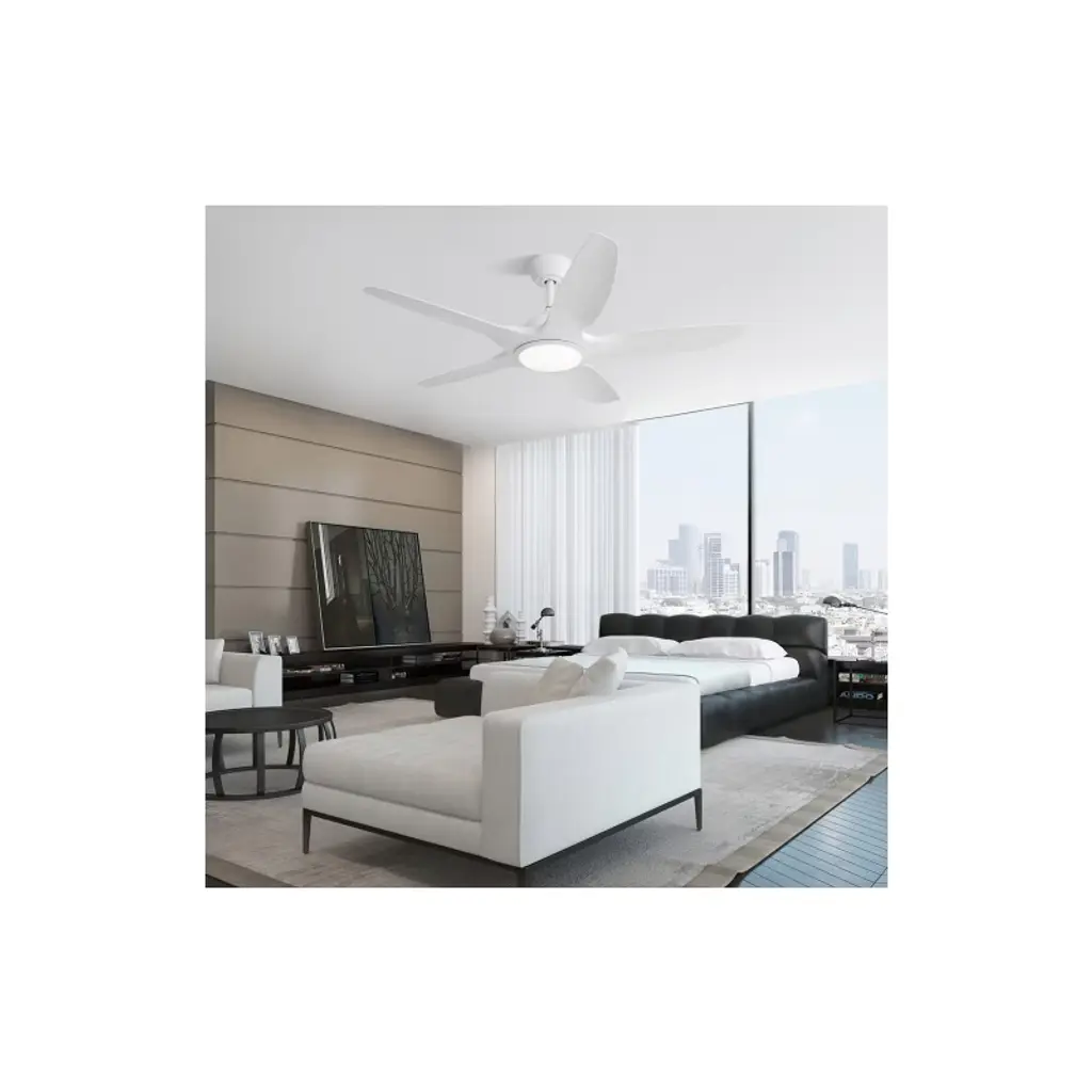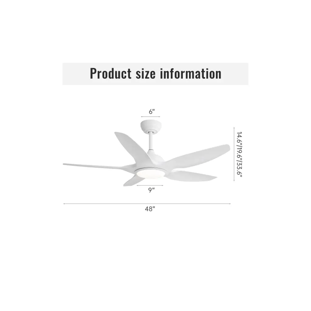 48 Inch Ceiling Fan With Light Color: White Blades/ White Body Blade Material: ABS Blades Size: 48" Voltage: 110-240V/50Hz/60Hz Light Source: 3CCT LED 22W Special Feature: Timer Certification: ETL Downrod: 5"/10"/24" Room Type: Farmhouse, Restaurant, Rustic, Garage, Living Room, Bedroom, Home Office, Kids Room, Balcony, Cabinet, Garage, Garden, Home, Shop, Dining Room High Quality Ceiling Fan This ceiling fan features a high-capacity pure copper DC motor, delivering powerful airflow and ensuring years of quiet performance. With its durable and modern design, this 48-inch ceiling fan is perfect for small to medium-sized rooms ranging from 80-160 sq.ft. Function Includes Forward and Reverse for Summer and Winter 2 Airflow Modes, Cooling In Summer and Keeping Warm in Winter. Modern 48 Inch Ceiling Fan This modern ceiling fan with light, each piece is carefully designed and crafted with great quality ABS blades. It gives the indoor/outdoor decor a touch of luxury and refinement.