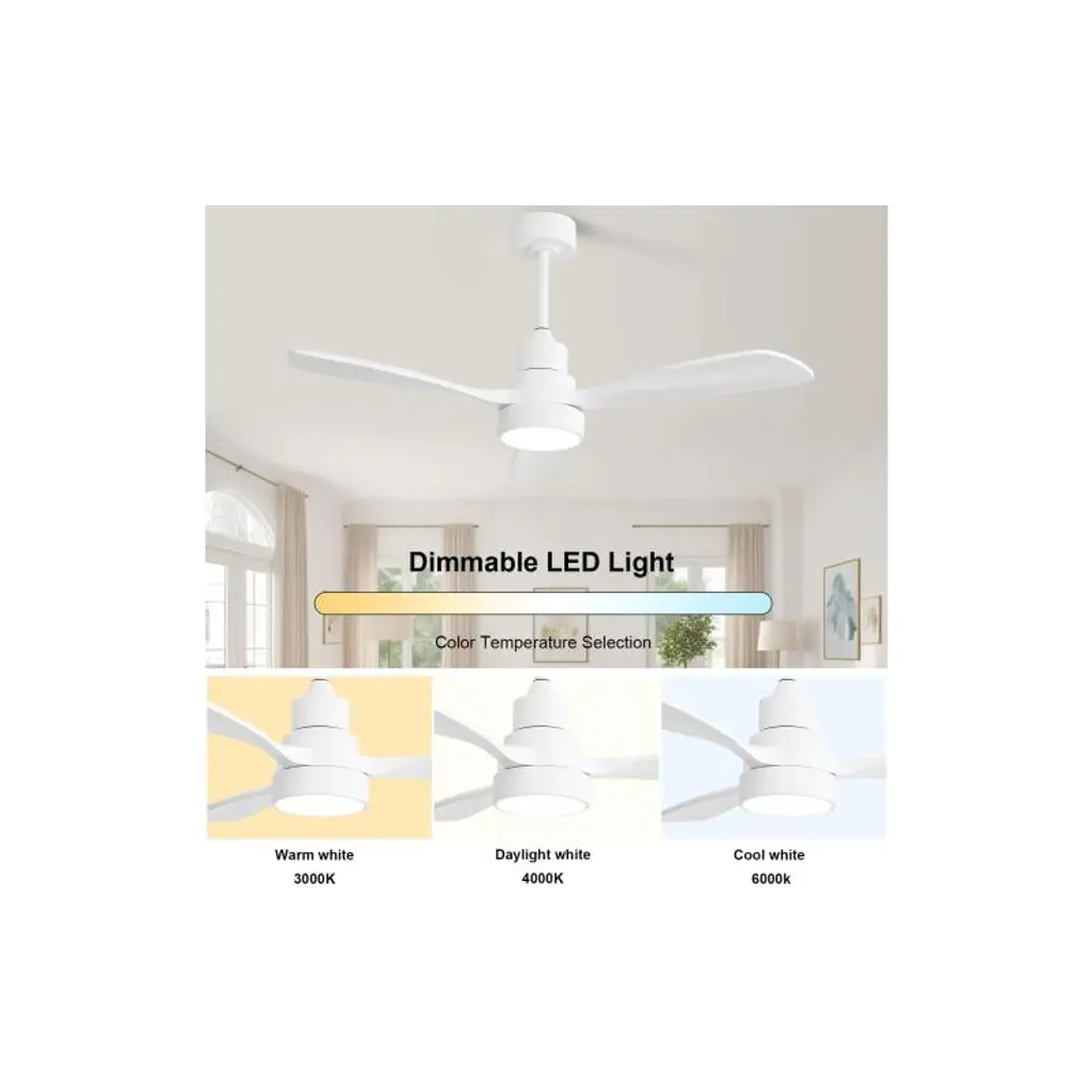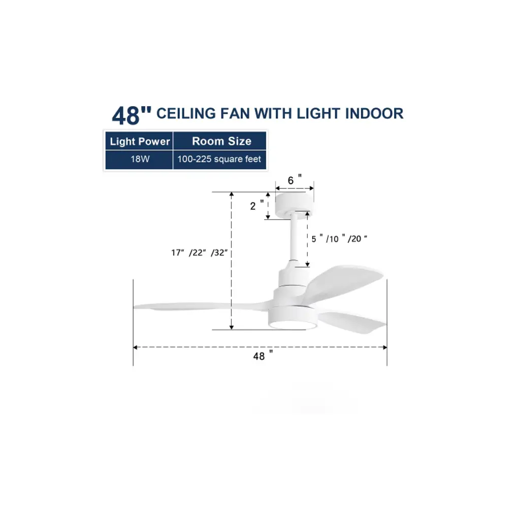 48 Inch Ceiling Fan With Light Color: White Blades/ Matte White Body Blades Size: 48" Voltage: 100-240V/50~60Hz Light Source: 3CCT LED 18W Special Feature: Timer Certification: ETL Downrod: 5"/10"/20" Room Type:Farmhouse, Restaurant, Rustic, Garage,, Living Room, Bedroom, Home Office, Kids Room, Balcony, Cabinet, Garage, Garden, Home, Shop, Dining Room , Function Includes Forward and Reverse for Summer and Winter 2 Airflow Modes, Cooling In Summer and Keeping Warm in Winter. Advanced Saving 3CCT LED Light Ceiling fan adopt 18W LED light source with a lighting memory function. Compared with ordinary light sources, LED light sources are more energy-efficient and have a longer lifespan. There are 3 color temperatures to choose from (3000K/4000K/6000K). Indoor & Outdoor See the product details page for dimensional drawings. Perfect for room sizes up to 25 m2, Restaurant, bedroom, living room, office, loft, balcony, modern living.