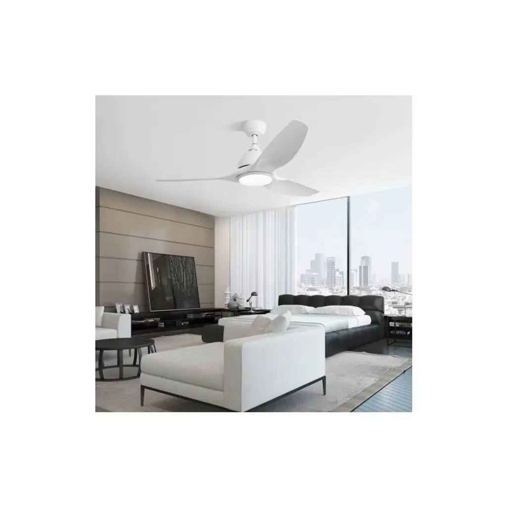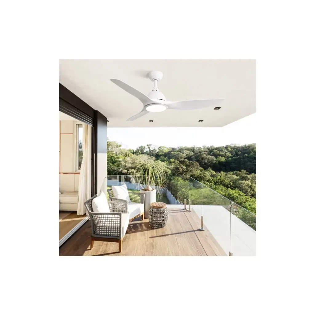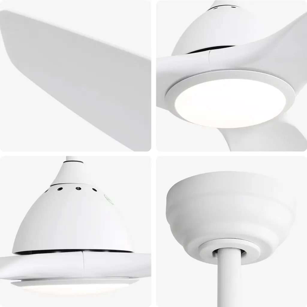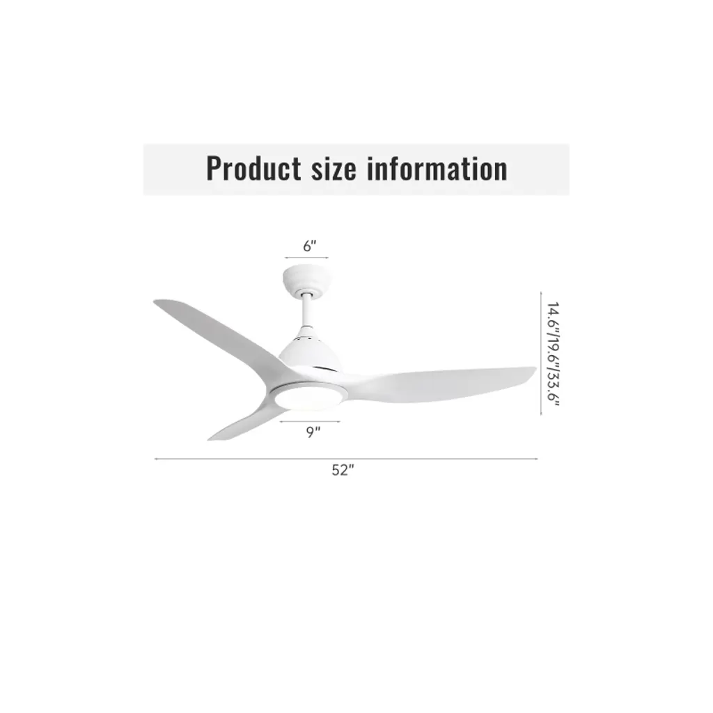 52 Inch Ceiling Fan with Light Color: White Blades/ White Body Blade Material: ABS Blades Size: 52" Voltage: 100V-240V/50Hz~60Hz Light Source: 3CCT LED 22W Feature: Timer Certification: ETL Downrod: 50"/10"/24" Room Type: Farmhouse, Restaurant, Rustic, Garage, Living Room, Bedroom, Home Office, Kids Room, Balcony, Cabinet, Garage, Garden, Home, Shop, Dining Room High Quality Ceiling Fan This ceiling fan features a high-capacity pure copper DC motor, delivering powerful airflow and ensuring years of quiet performance. With its durable and modern design, this 52-inch ceiling fan is perfect for medium to large-sized rooms ranging from 160-360 sq.ft. Reversible Ceiling Fan Reversible Quiet Energy saving, Function Includes Forward and Reverse for Summer and Winter 2 Airflow Modes, Cooling In Summer and Keeping Warm in Winter. Modern 52 Inch Ceiling Fan This modern ceiling fan with light, each piece is carefully designed and crafted with great quality ABS blades. It gives the indoor/outdoor decor a touch of luxury and refinement.
