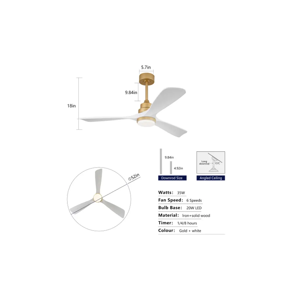 Solid Wood Ceiling Fan: 52 inch modern ceiling fan, 3 blades are carved from sycamore wood that has grown for more than 20 years, each blade is professionally calibrated and balanced, stable operation, and uniform air supply.Ceiling Fan with Lights: Integrated LED Light , 1500 Lumen, 18W, 3000K warm light, 4000K natural light, 6500K white light, 20%-100% brightness adjustment, no flicker, no buzz, safe to eyes and energy saving.
