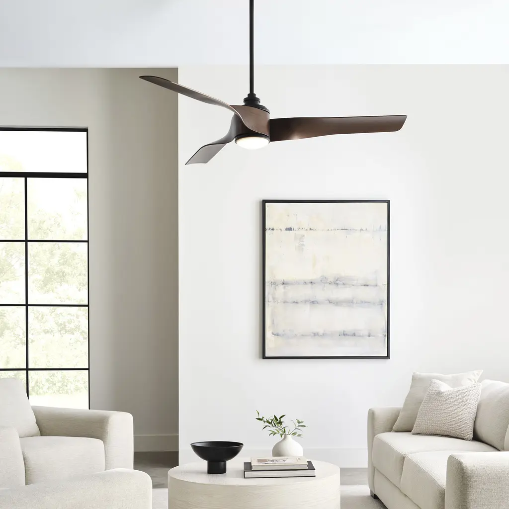 The Touro Smart 60" LED fan by Chapman & Myers is inspired by the elegant curved profile of a jet engine. Slim blades wrap around the cylindrical housing and then gently twist away to create a horizontal silhouette. This app-controlled illuminating fan is damp-rated for indoor and outdoor use alike.