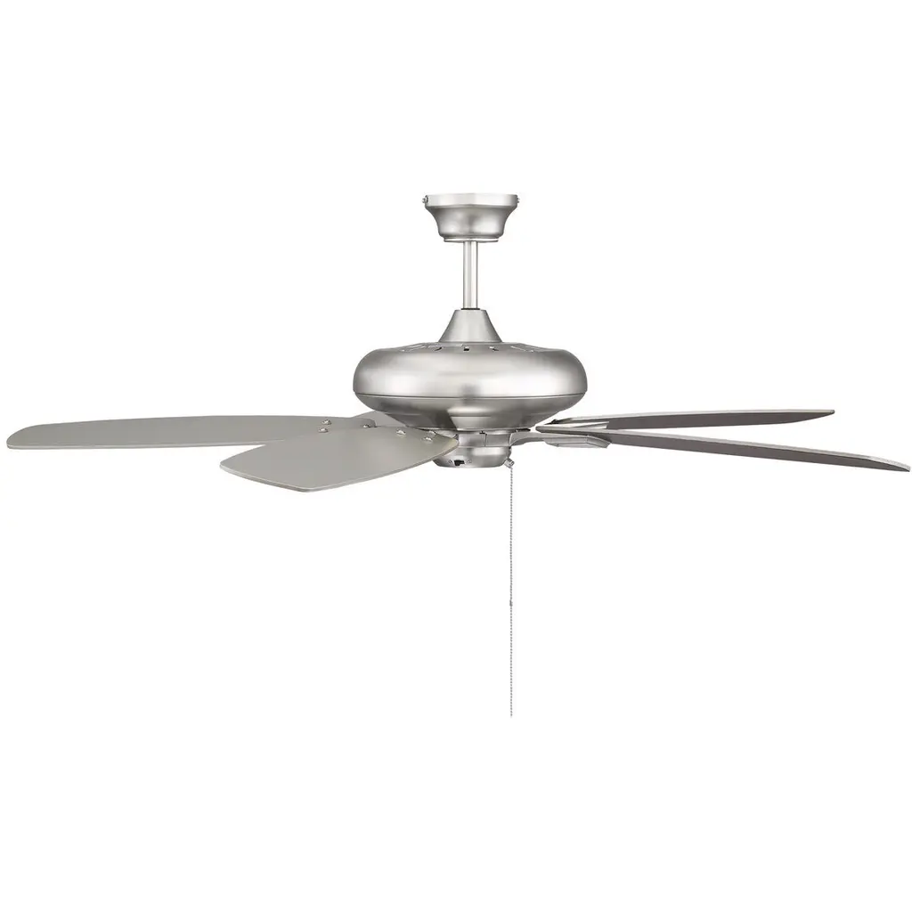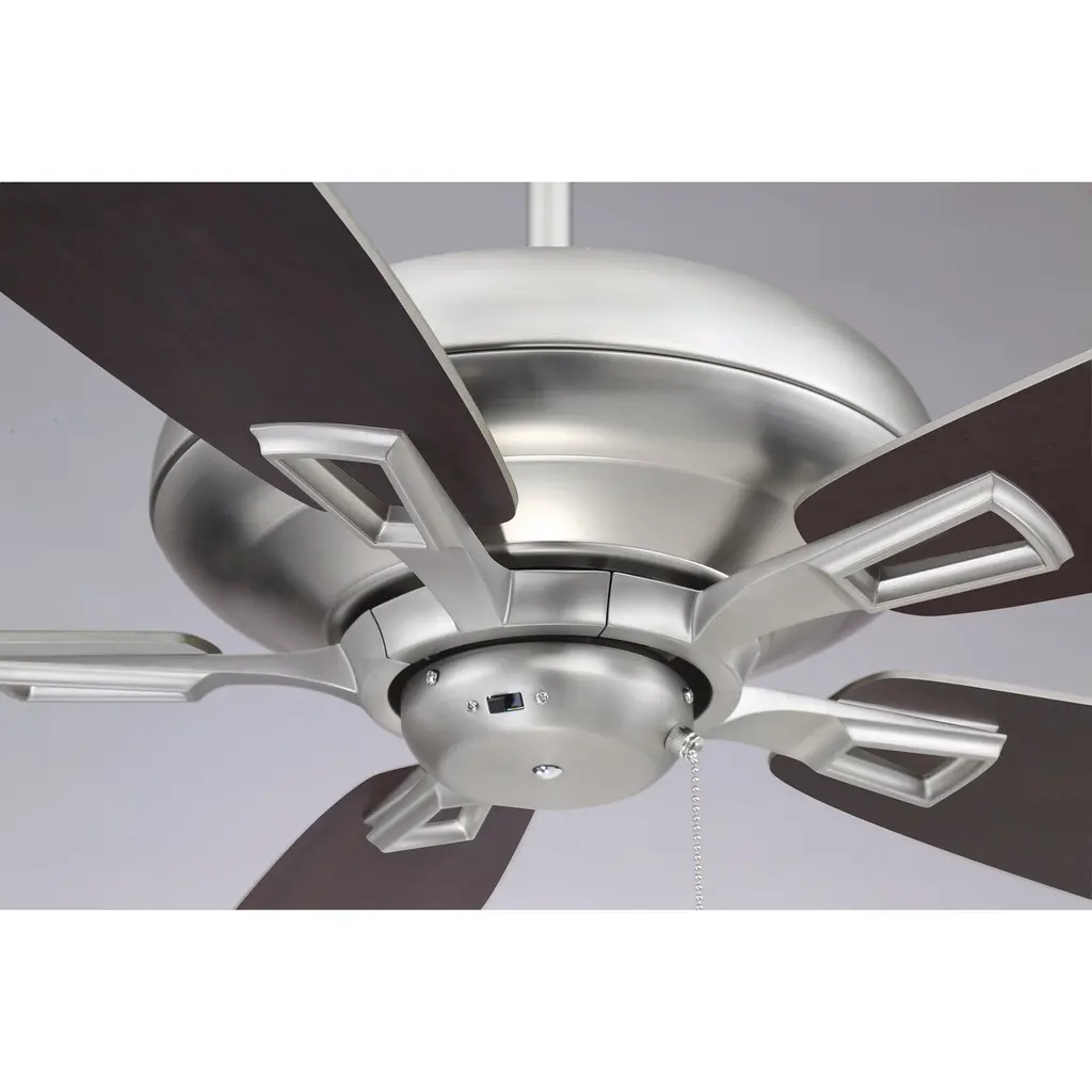 Mystique is a rich, intriguing contemporary look that’s perfect for your ceiling. This Savoy House fan features 5 blades in reversible finishes (chestnut and teak or teak and walnut) and a polished nickel, Byzantine bronze, satin nickel or English bronze finish. The light kit, boasting a dome in white or cream frosted glass, is included.